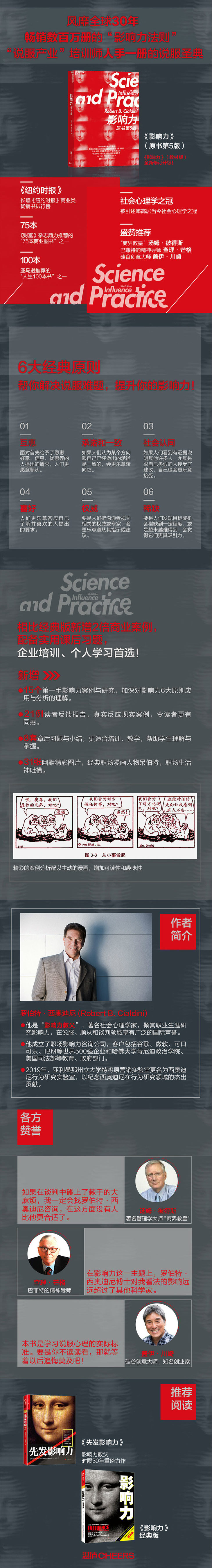 《影响力》(原书第5版)是西奥迪尼的社会心理学经典作品,在书中,作者从专业角度为读者阐释了顺从他人行为背后的六大基本原则:互惠、承诺和一致、社会认同、喜好、**和稀缺,为我们解释了为什么有些人极具说服力,而我们也总是容易上当受骗。