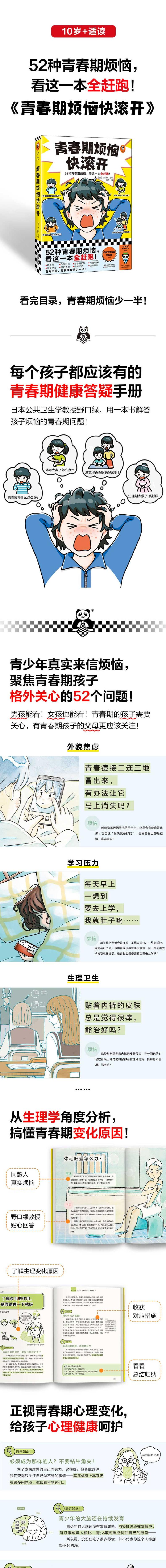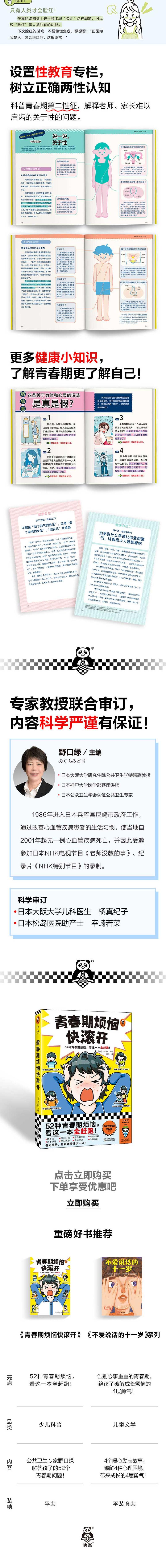 青春痘、体毛旺盛、月经遗精、学习压力、外貌焦虑……日本公共卫生学教授野口绿,用一本书解答孩子格外关心的52个青春期烦恼问题!全书分为“如何保持身体健康”“如何保持心灵健康”“如何健康地变美”“如何健康地生活”四大版块,帮助孩子了解青春期应选择的饮食、运动和生活方式,科普大人们难以启齿的性问题。