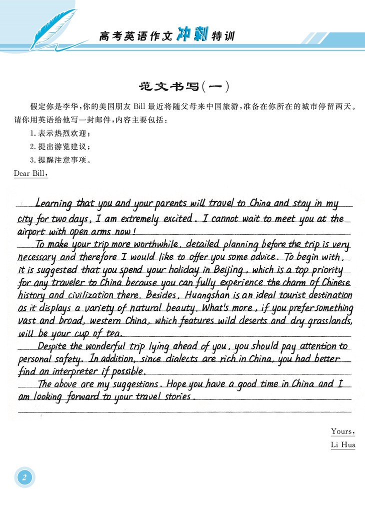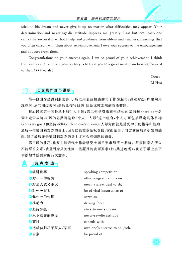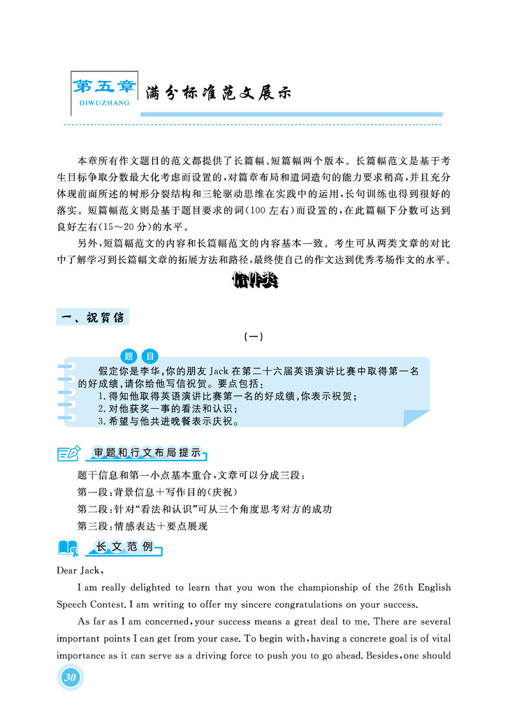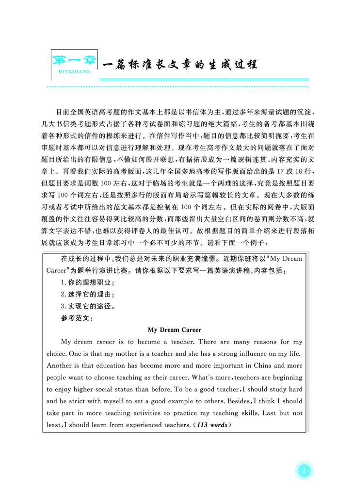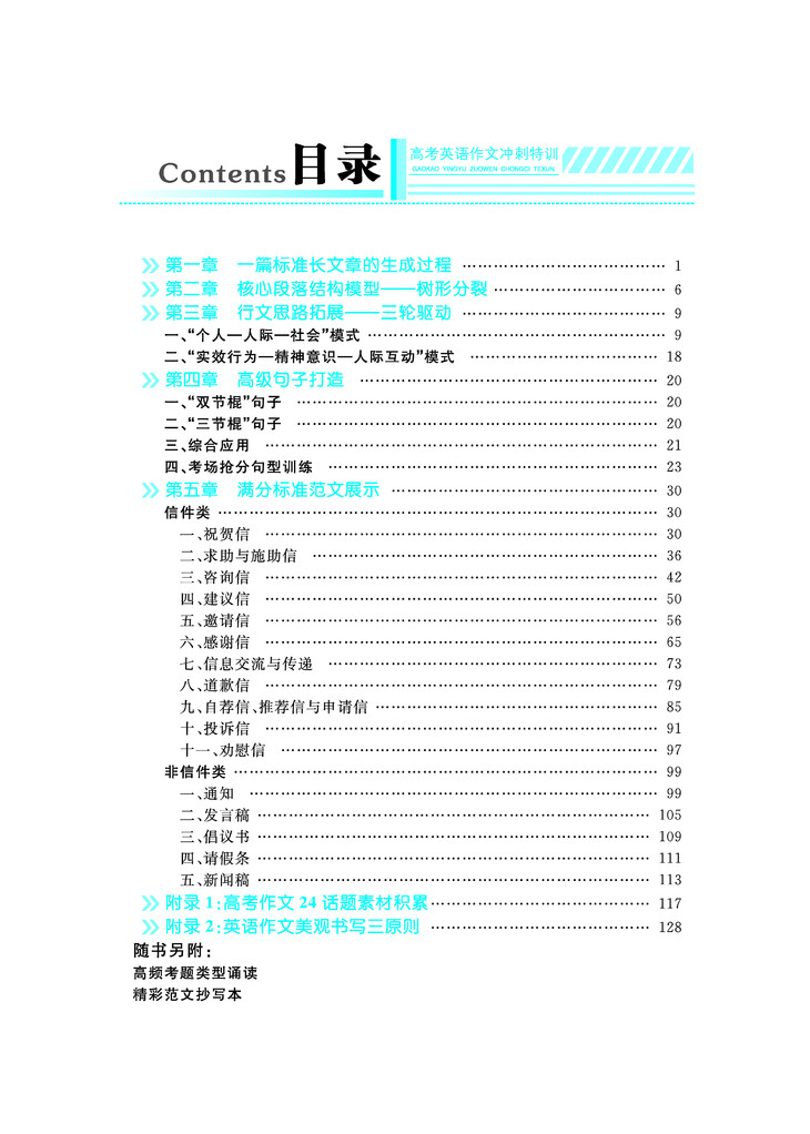 所以本书侧重让考生如何能在合理流畅的基础上做到把篇幅延伸至覆盖大部分的考场所给出的作文卷面(180词)。同时本书也为每一个题目给出了篇幅较短的范文,适合基础较为薄弱的学生参考模仿,也为学习写作长篇幅文章的学生提供一个进阶的过度性对比学习。