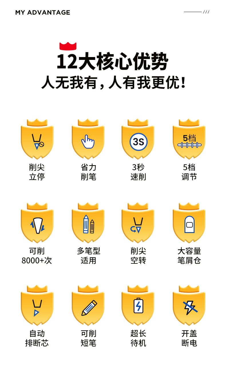单手按压,削尖立停,五档粗细可调,多种笔型都能削