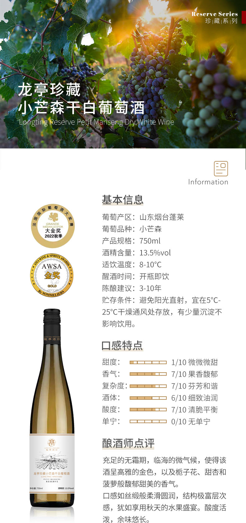 龙亭珍藏小芒森干白葡萄酒 中国 Longting Reserve Petit Manseng Dry White Wine, China