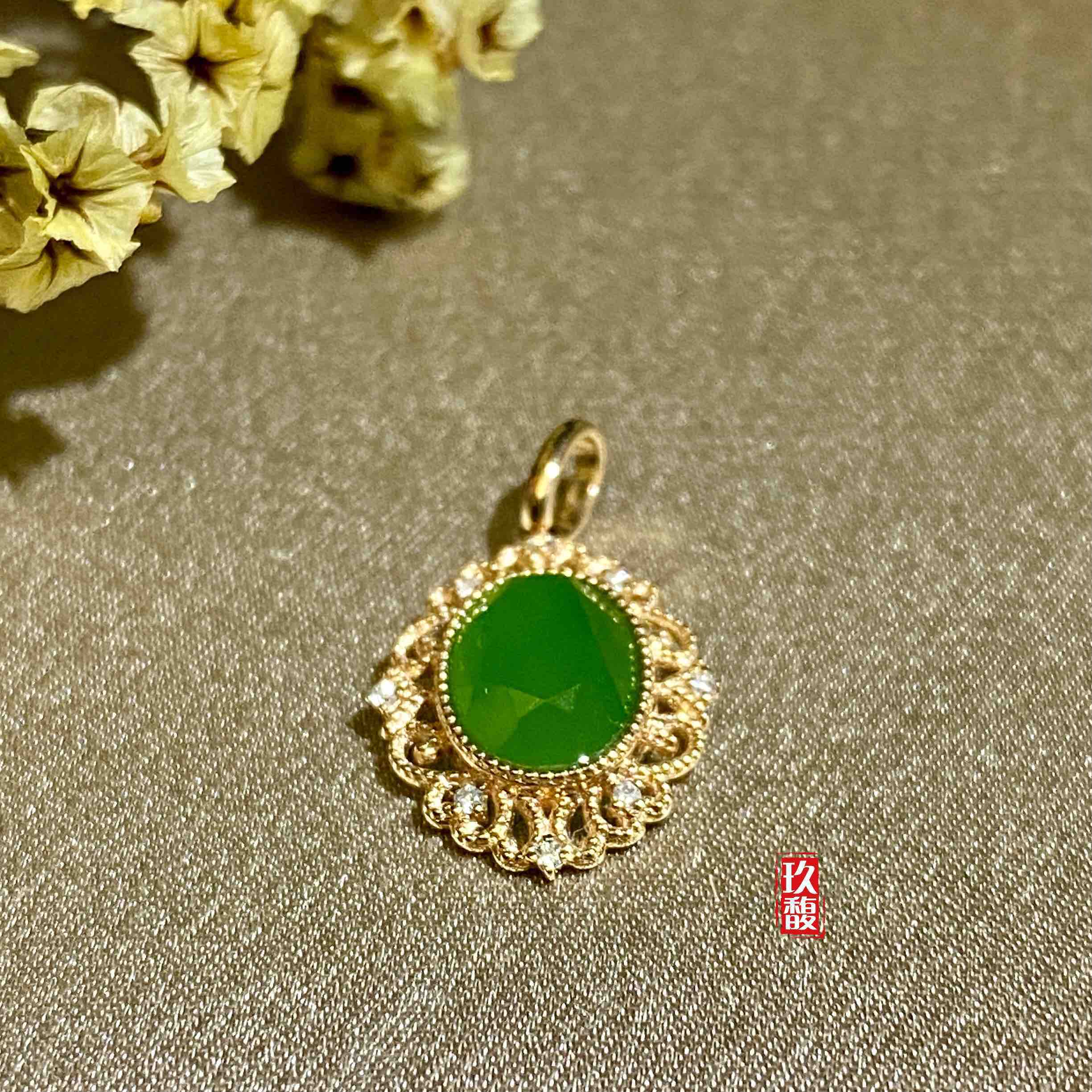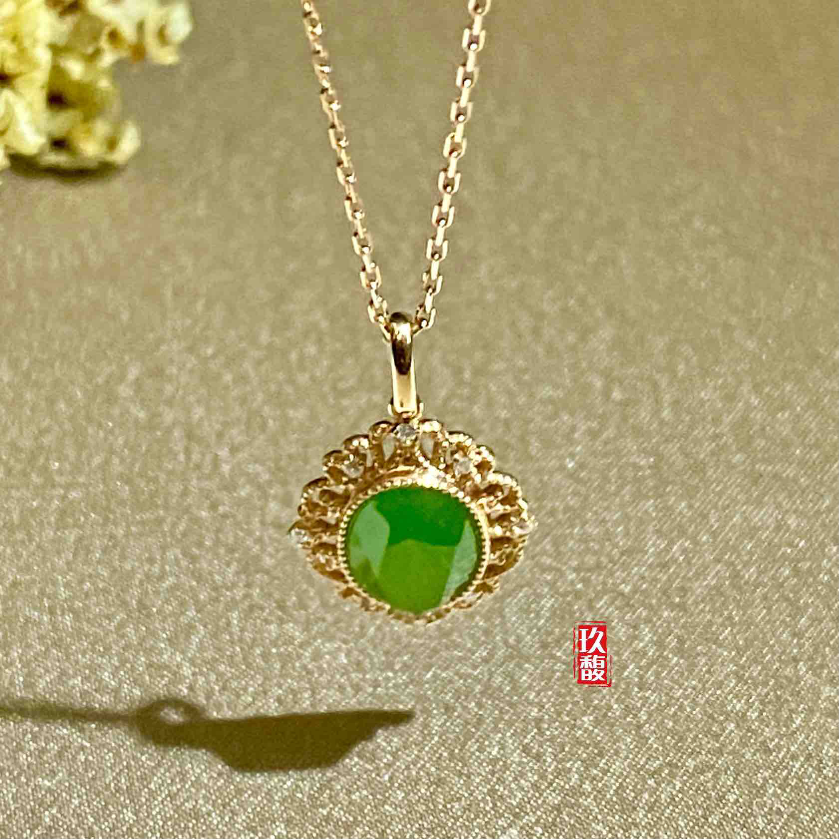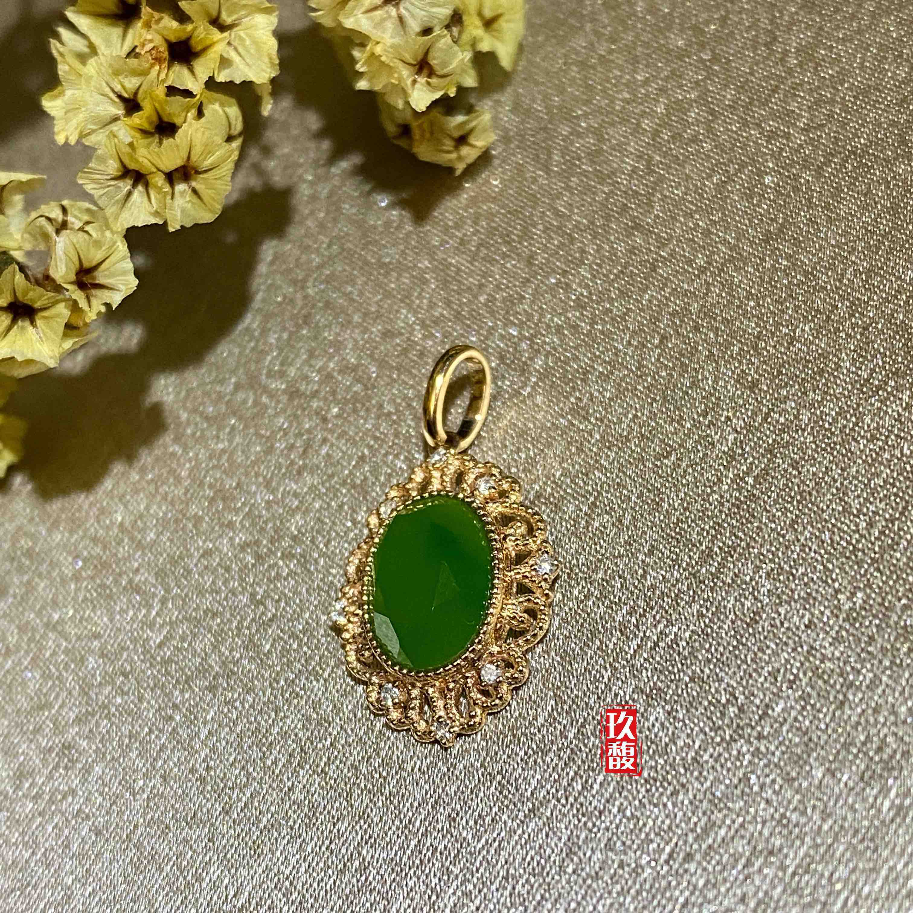 18K玫瑰金和田玉(碧玉)吊坠