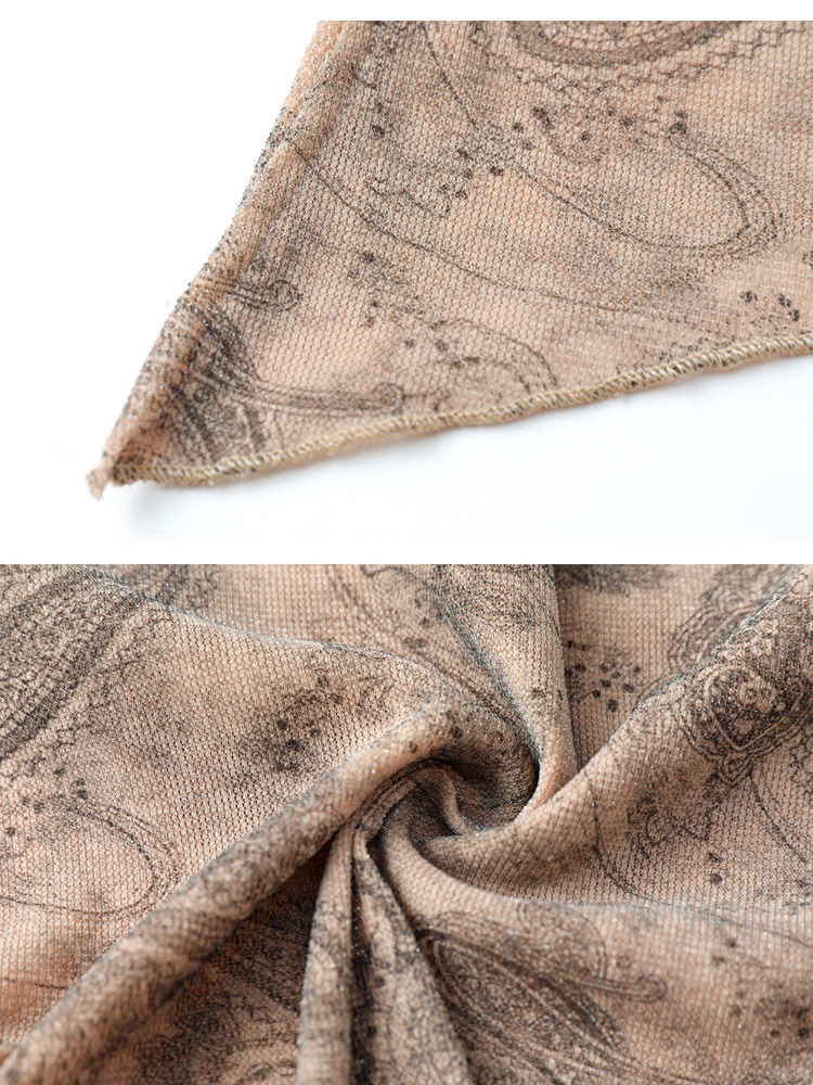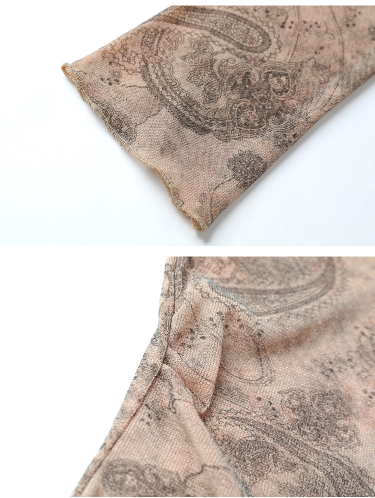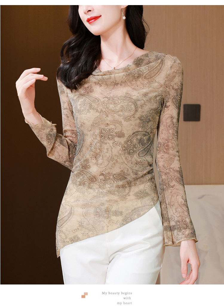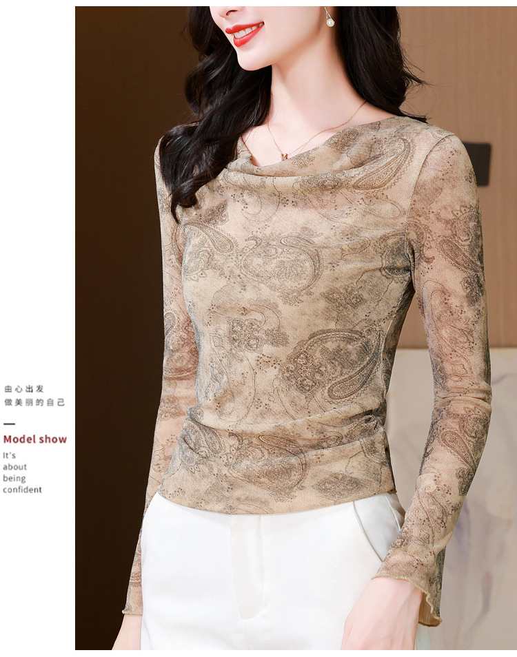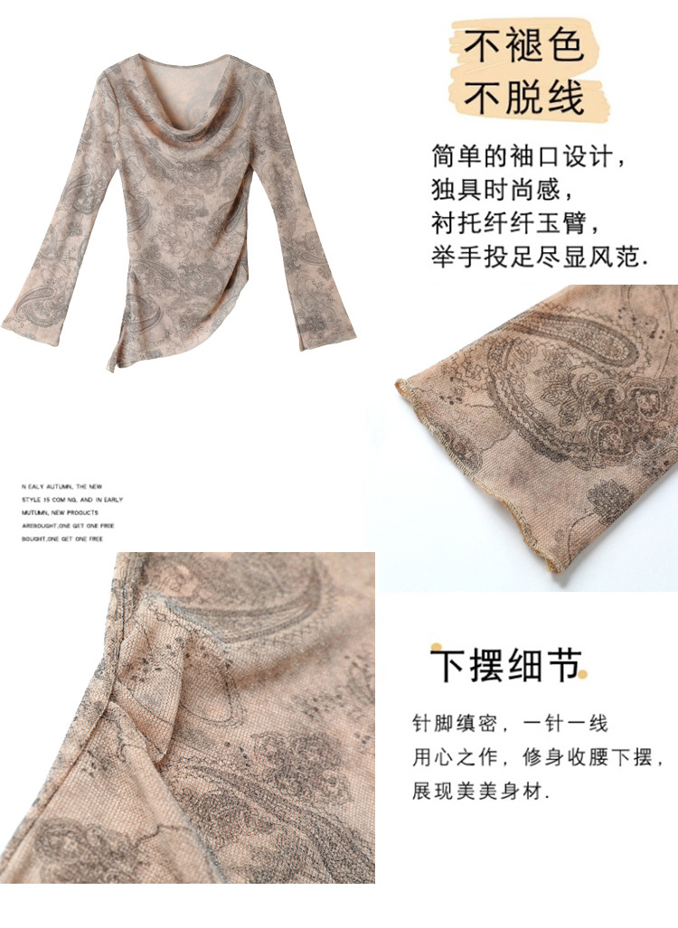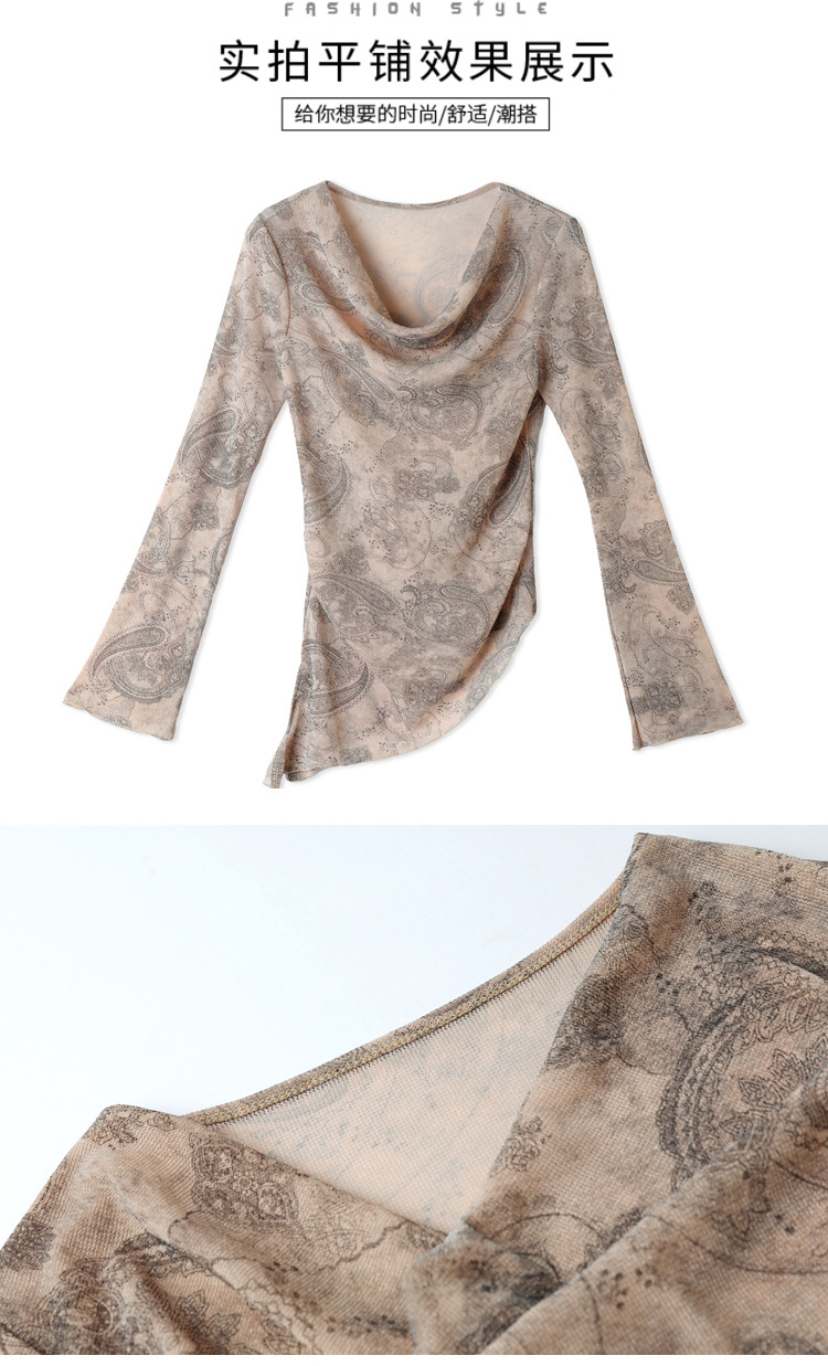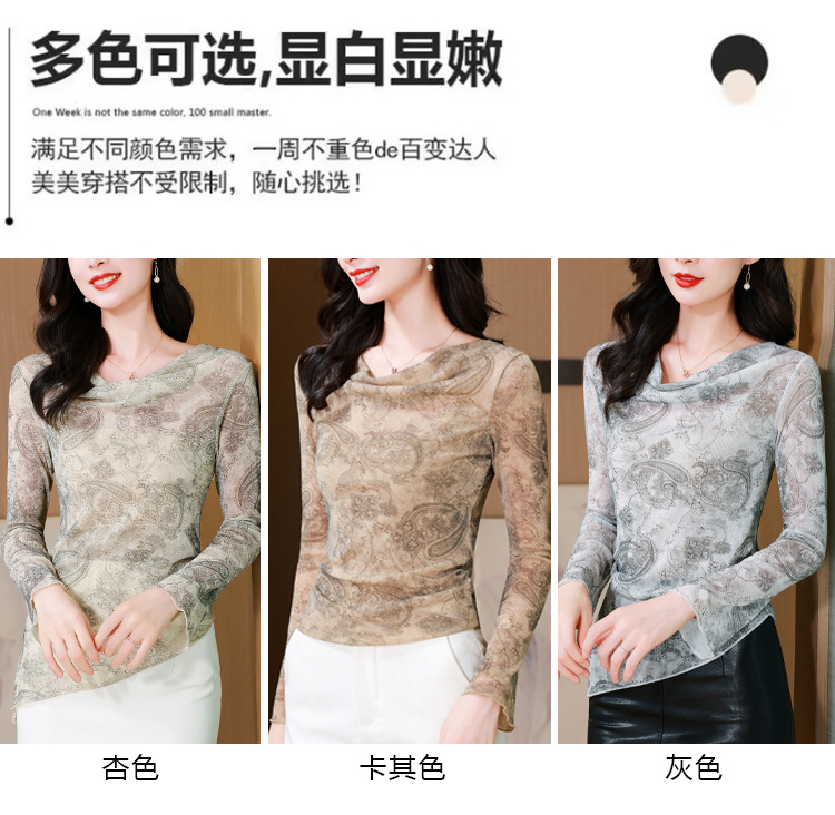 网纱印花荡领收腰显瘦,打底衫百搭长袖T恤KQL-E46M2036