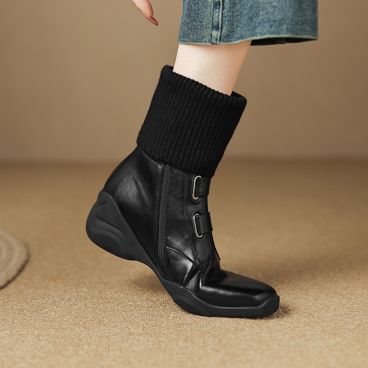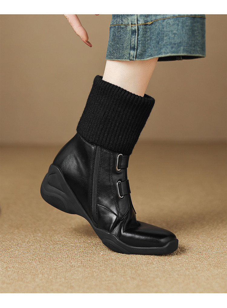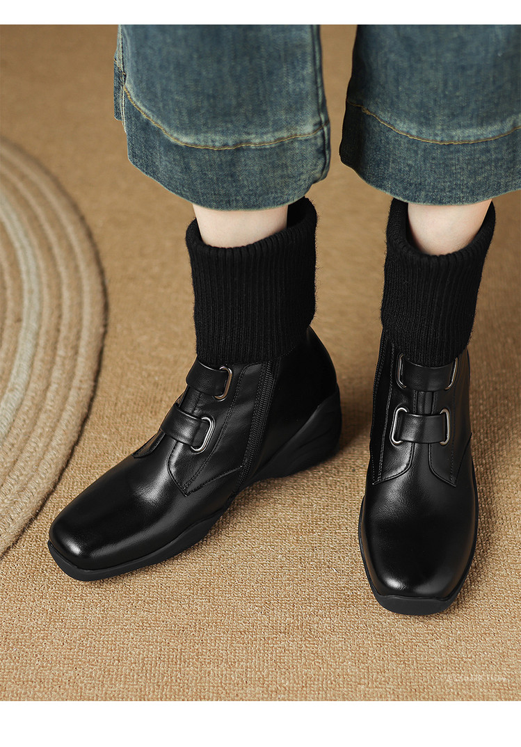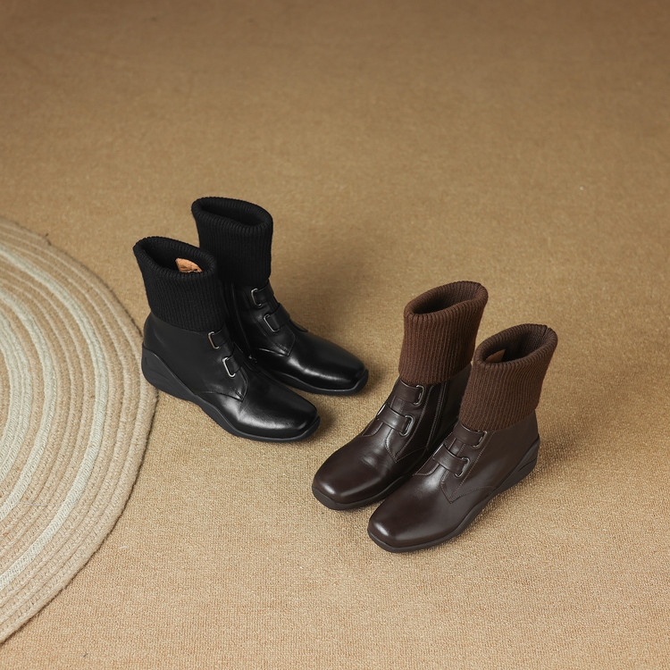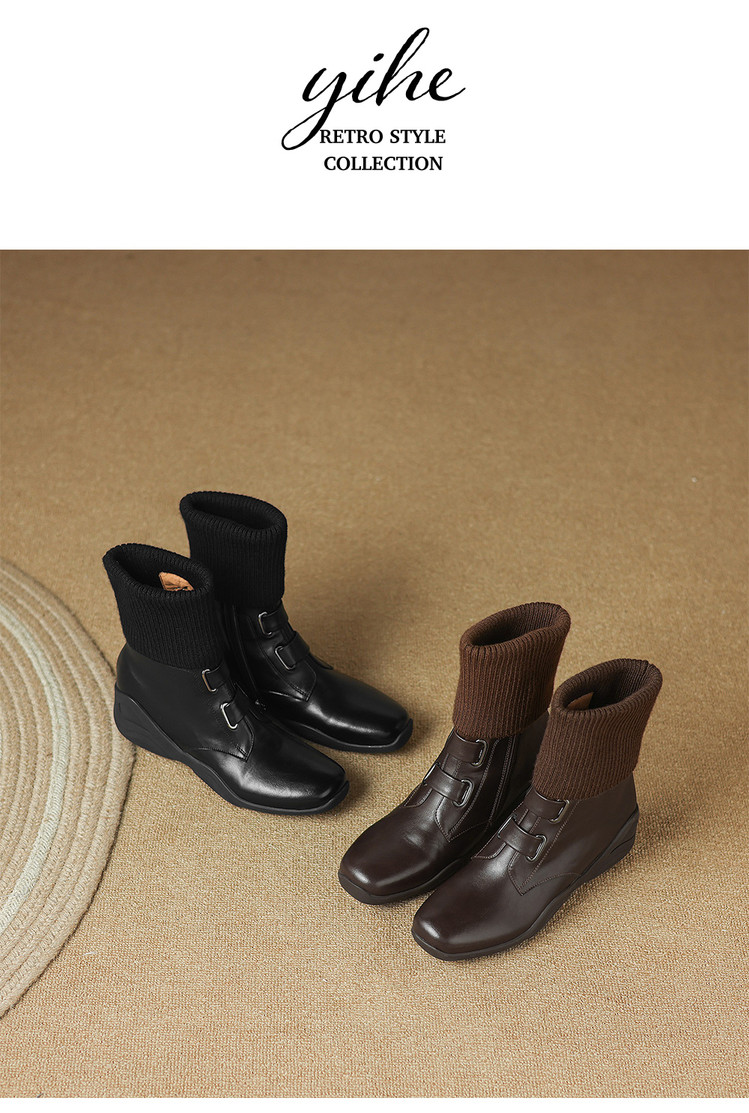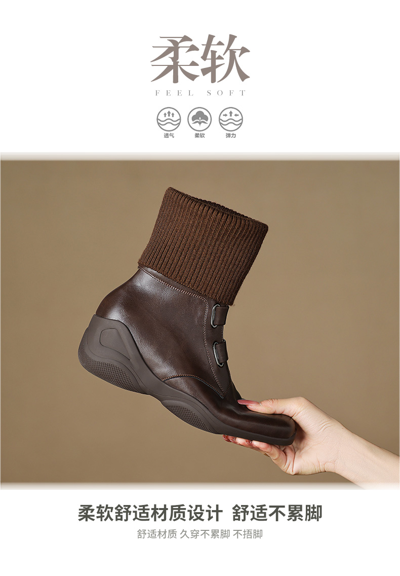 【预售5天】秋冬季坡跟软皮短靴女新款加绒毛线口中筒靴子方头休闲保暖女靴LD&7513