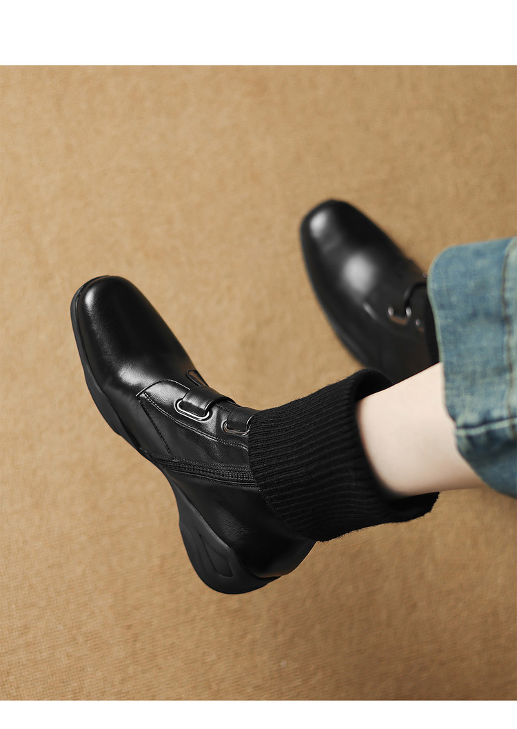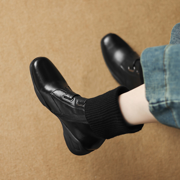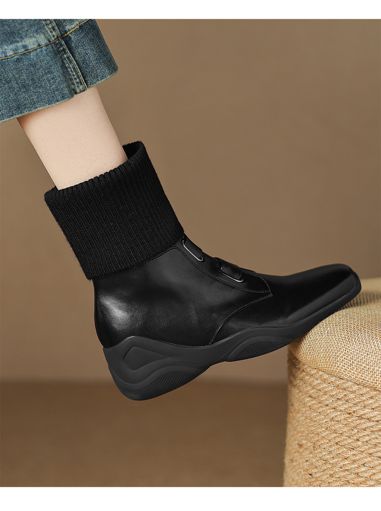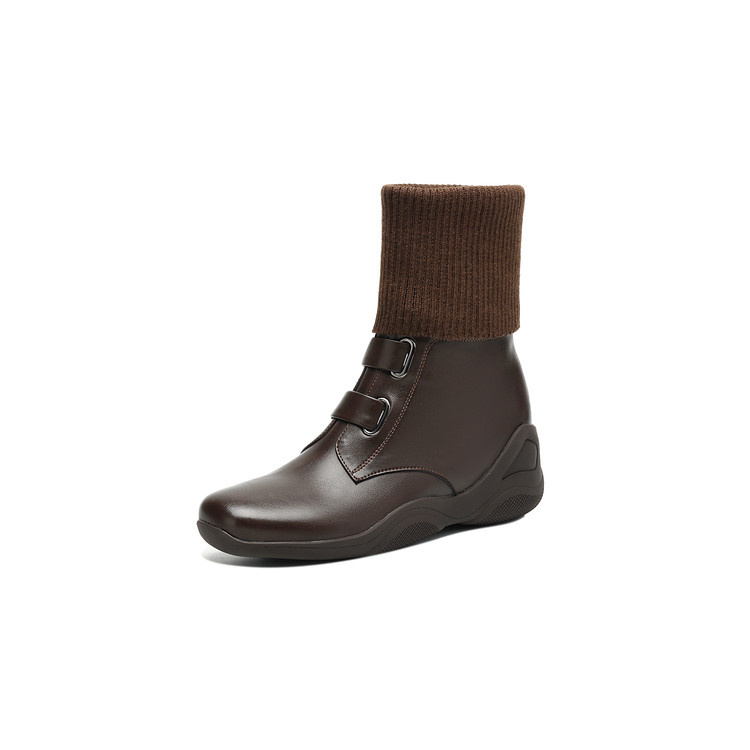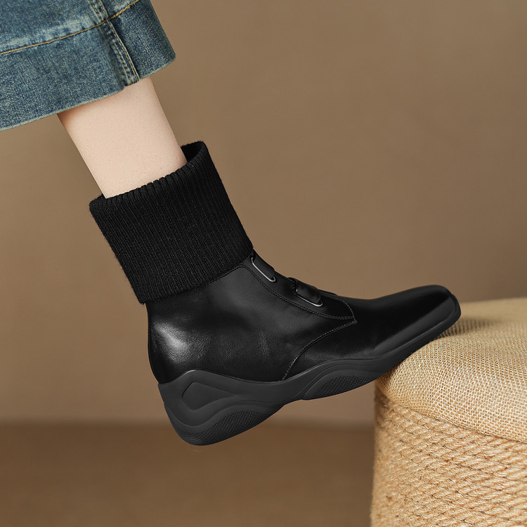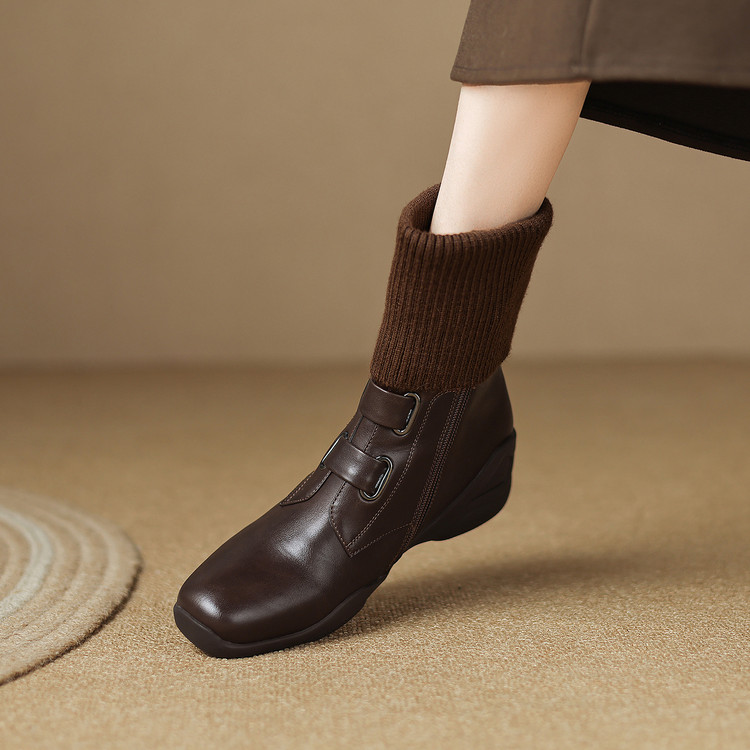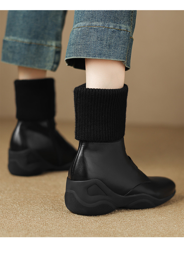 【预售5天】秋冬季坡跟软皮短靴女新款加绒毛线口中筒靴子方头休闲保暖女靴LD&7513
