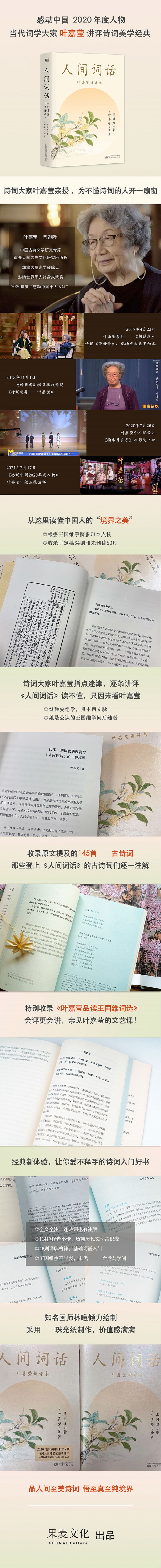 ★中华诗词终身成就奖、影响世界华人终身成就奖、2020年度“感动中国十大人物”叶嘉莹逐则深入讲评《人间词话》。