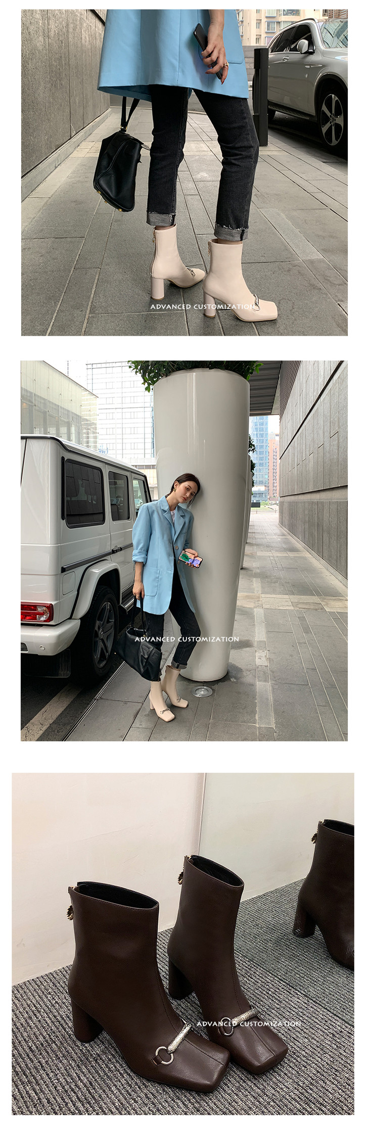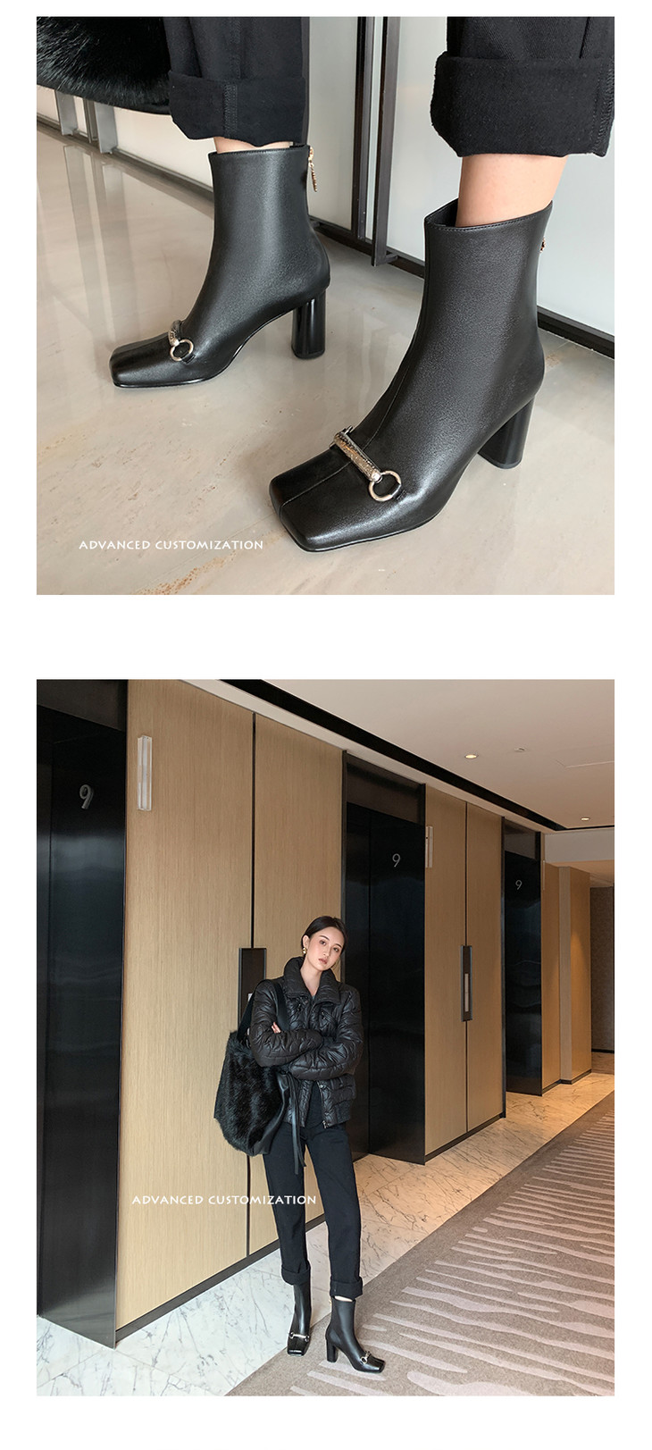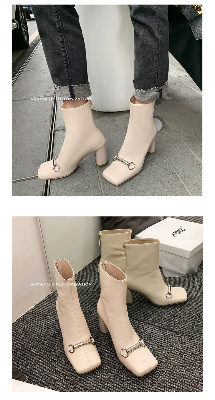 上海旗袍厂HFE-N610-F3151 秋冬新款纯色真皮方头粗跟时装靴后拉链气质淑女短筒靴