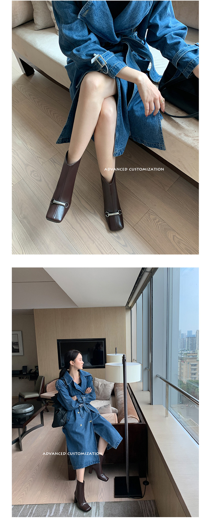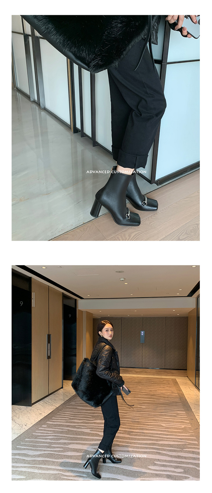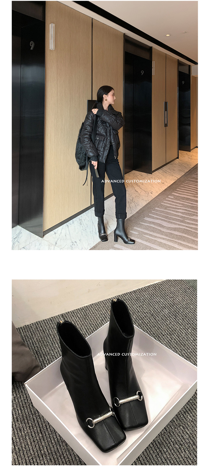 上海旗袍厂HFE-N610-F3151 秋冬新款纯色真皮方头粗跟时装靴后拉链气质淑女短筒靴