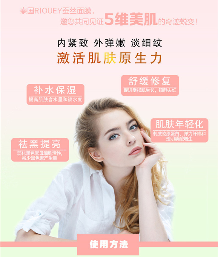 ❤ 双倍补水、高效锁水,含光果甘草根提取物、甘草酸二钾、虎杖根提取物、茶叶提取物等️增加细胞基底层细胞活力👌 kang氧化,调节肌肤免疫力,更新肌肤细胞zai生,增加肌肤保水度❤ 活化更新肌肤细胞,kang敏防护作用,保护肌肤免受外界伤害🍀 riouey面膜精华液一片足足35克,共计2层,珠光层+蚕丝面膜层。敷完蚕丝面膜 把珠光层去掉 静静等待20-30分钟即可㊙