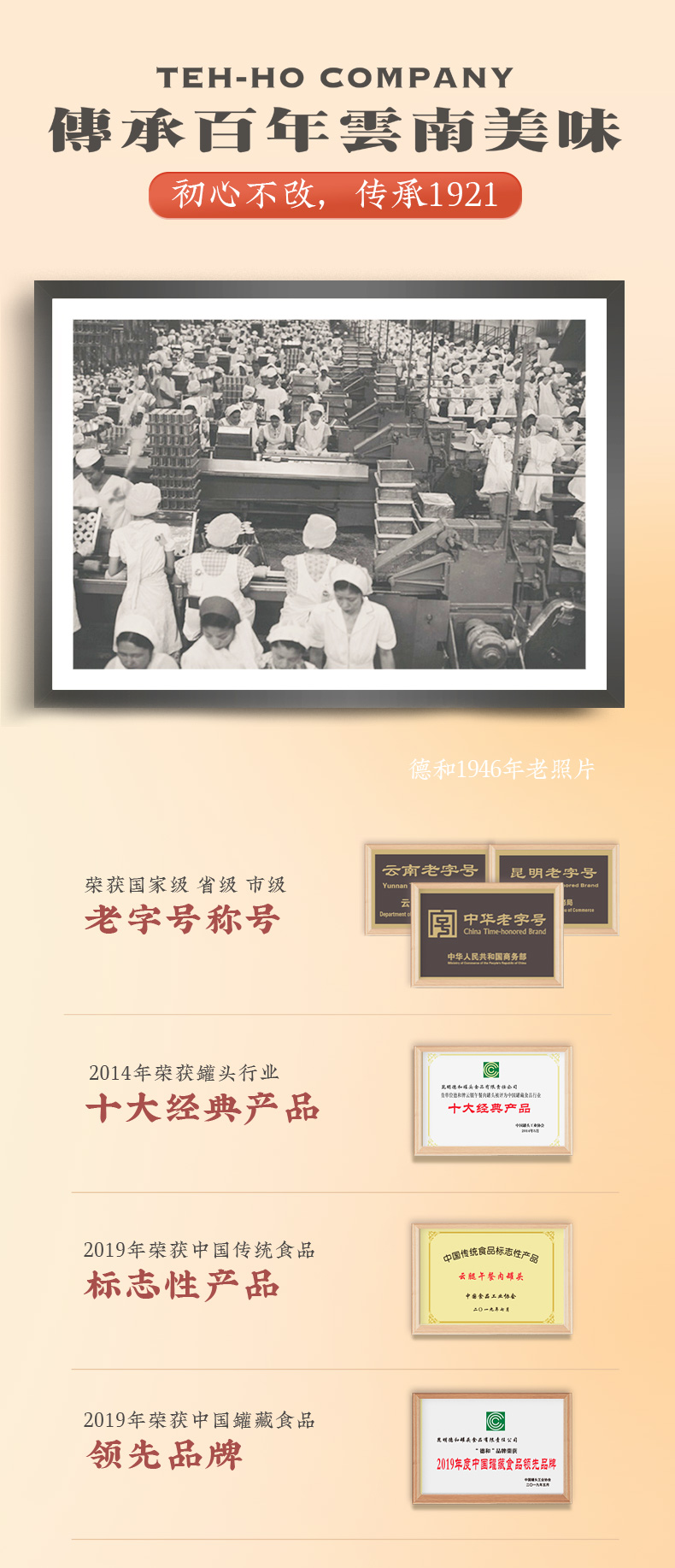 昆明德和罐头厂是中国最早开始生产制造罐头的企业之一,至今已有九十八年的悠久历史,现已形成以罐头食品为主,腌腊制品、糕点月饼等为辅的云南省规模最大和最具影响力综合食品制造企业,奠定了云南罐头行业的基石。