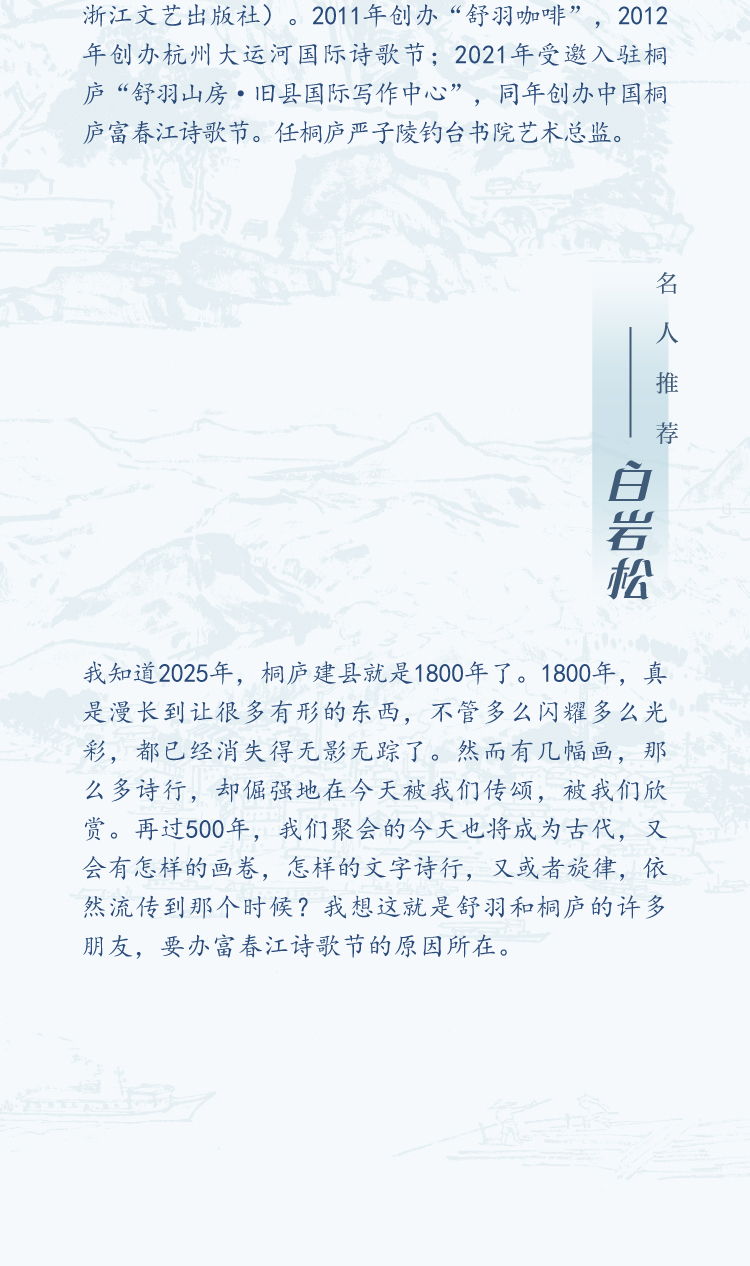 我知道2025年,桐庐建县就是1800年了。1800年,真是漫长到让很多有形的东西,不管多么闪耀多么光彩,都已经小时得无影无踪了。然而有几幅画,那么多诗行,却倔强地在今天被我们传颂,被我们欣赏。再过500年,我们聚会的今天也将成为古代,又会有怎样的画卷,怎样的文字诗行,又或者旋律,依然流传到那个时候?我想这就是舒羽和桐庐的许多朋友,要办富春江诗歌节的原因所在。