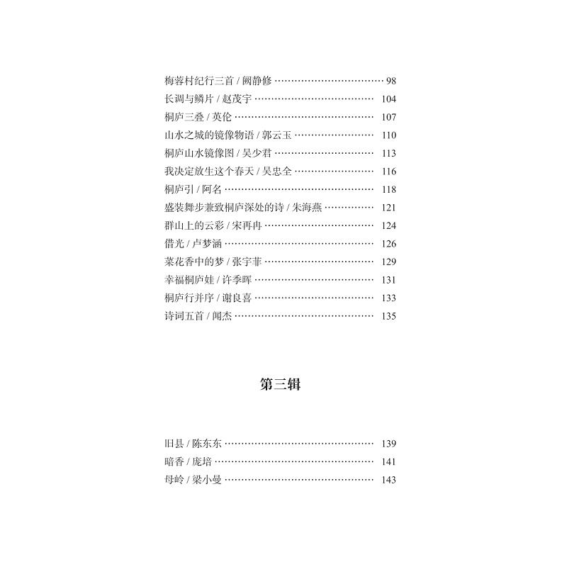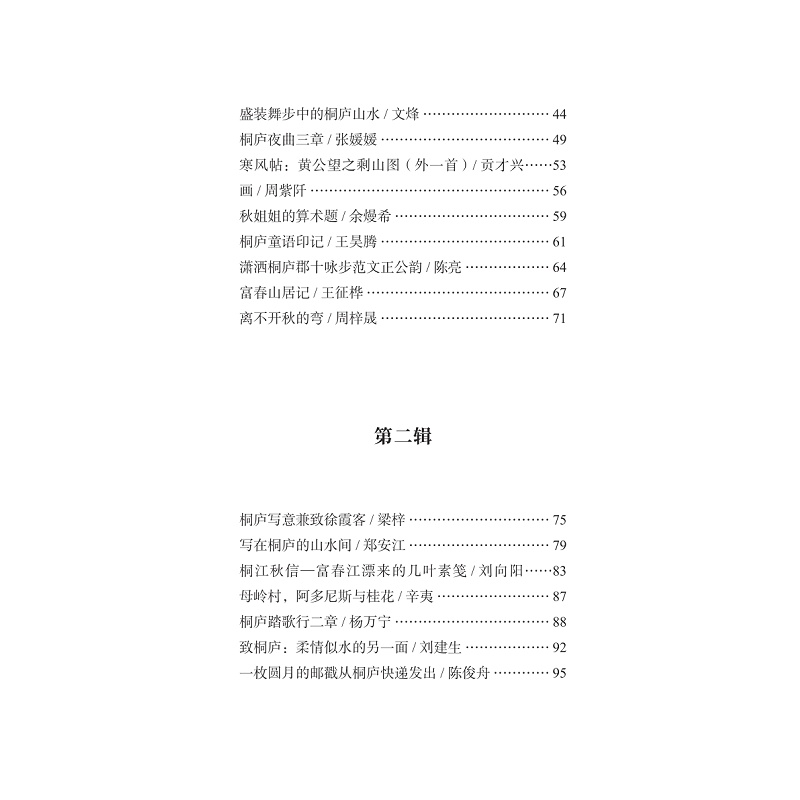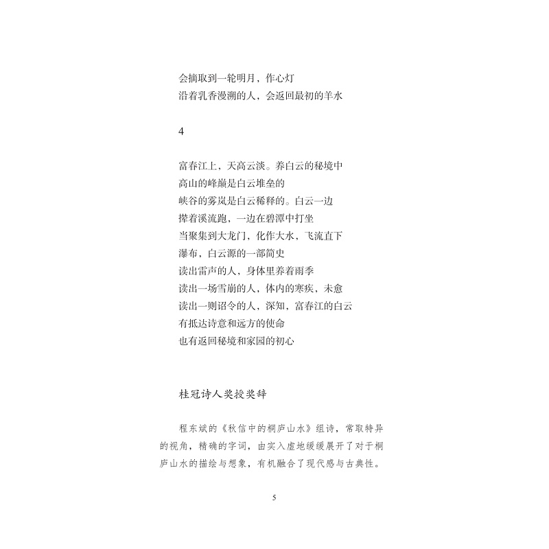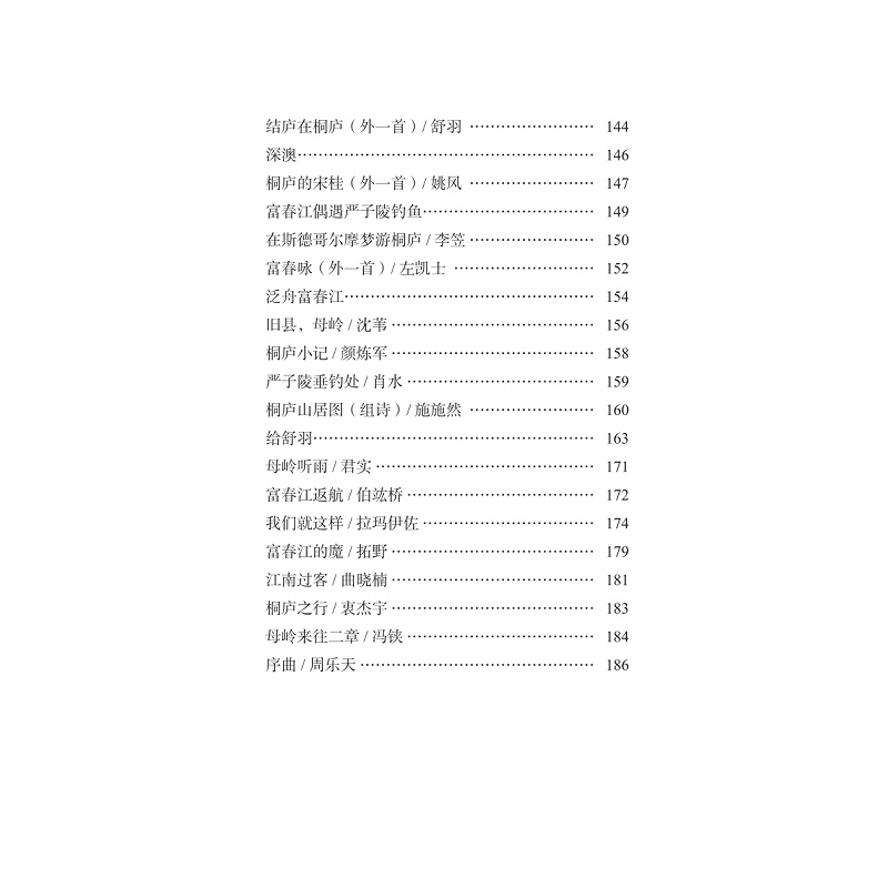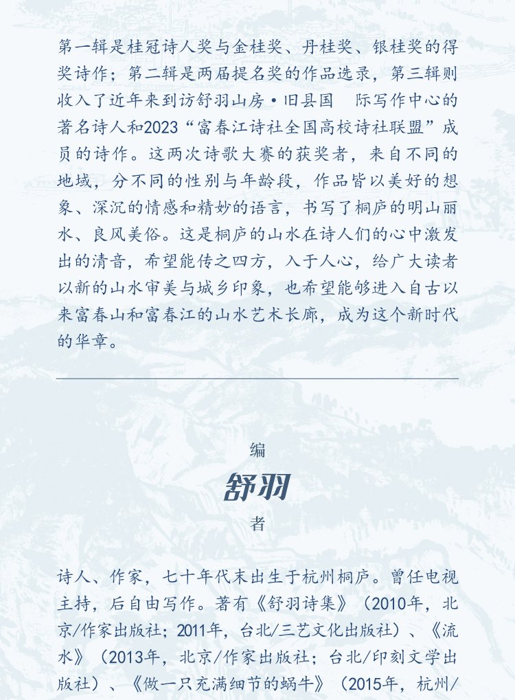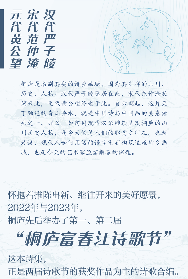 桐庐是名副其实的诗乡画城,因为其别样的山川、 历史、人物。汉代严子陵隐居在此,宋代范仲淹贬谪来此,元代黄公望终老于此。自六朝起,这片天下独绝的奇山异水,就是中国诗与中国画的灵感源头之一。那么,如何用现代汉语继续呈现桐庐的山川历史人物,是今天的诗人们的职责之所在。也就是说,现代人如何用活的语言重新构筑这座诗乡画城,也是今天的艺术家亟需解答的课题。怀抱着推陈出新、继往开来的美好愿景,2022年与2023年,桐庐先后举办了第一、第二届“桐庐富春江诗歌节”。这本诗集,正是两届诗歌节的获奖作品为主的诗歌合编。第一辑是桂冠诗人奖与金桂奖、丹桂奖、银桂奖的得奖诗作;第二辑是两届提名奖的作品选录,第三辑则收入了近年来到访舒羽山房·旧县国 际写作中心的著名诗人和 2023“富春江诗社全国高校诗社联盟”成员的诗作。这两次诗歌大赛的获奖者,来自不同的地域,分不同的性别与年龄段,作品皆以美好的想象、深沉的情感和精妙的语言,书写了桐庐的明山丽水、良风美俗。这是桐庐的山水在诗人们的心中激发出的清音,希望能传之四方,入于人心,给广大读者以新的山水审美与城乡印象,也希望能够进入自古以来富春山和富春江的山水艺术长廊,成为这个新时代的华章。