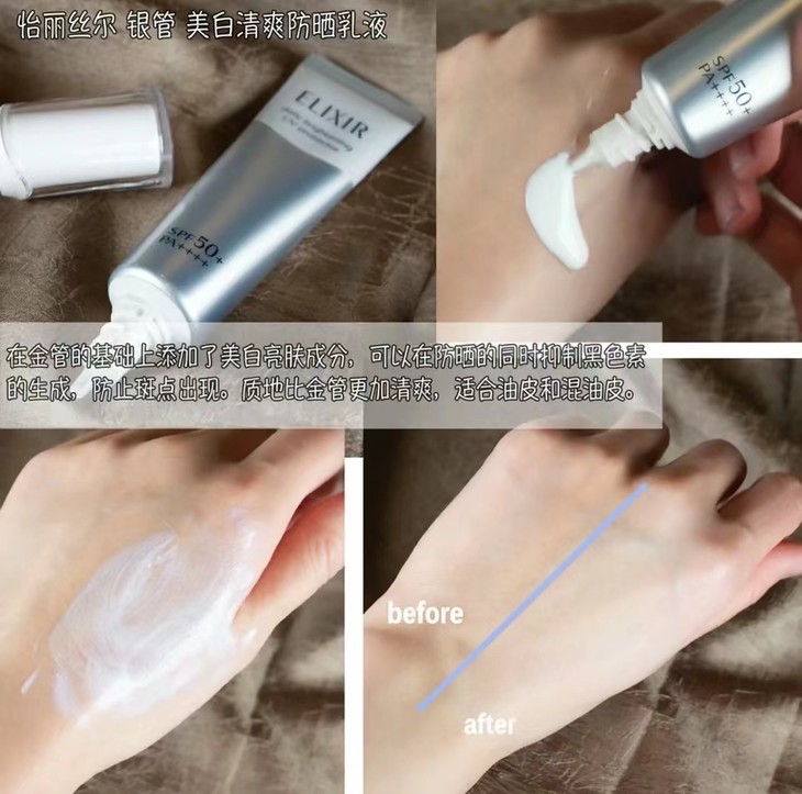 👑怡丽丝尔净白多效防晒乳35ml-银管 👍物理+化学防晒,【主打清爽美白】 💦美白防晒,微微润色,3效合一:隔离+防晒+乳液 ✨乳液质地,颜色偏白,水润不油腻,成膜快 🔆SPF50+ PA++++,抵御长波紫外线,防晒能力超强,长期户外活动,不怕晒 🙋适合油皮、混油皮使用