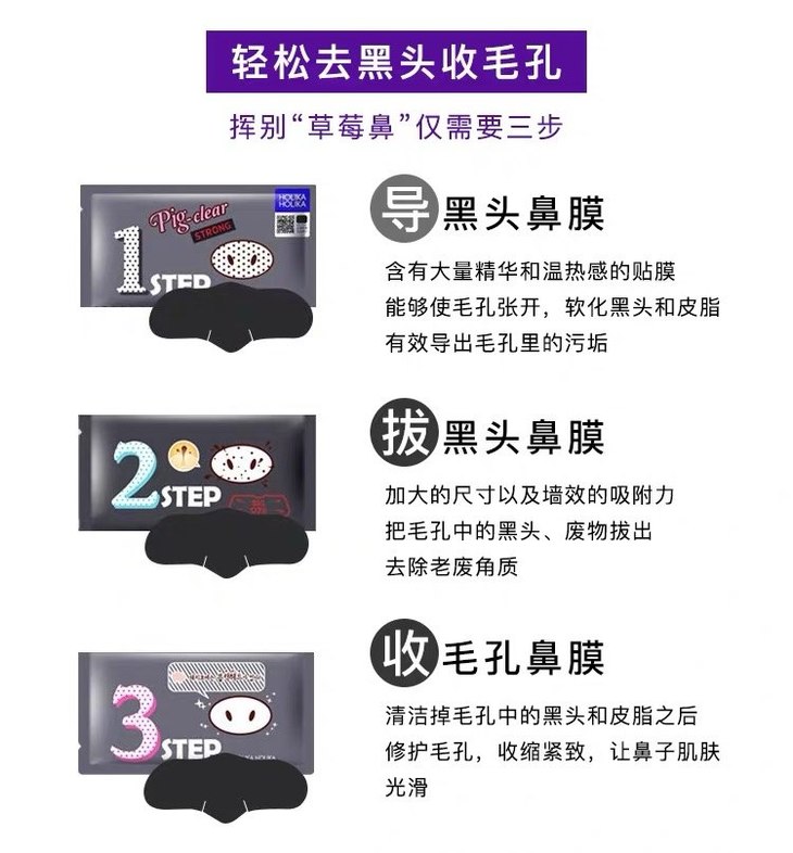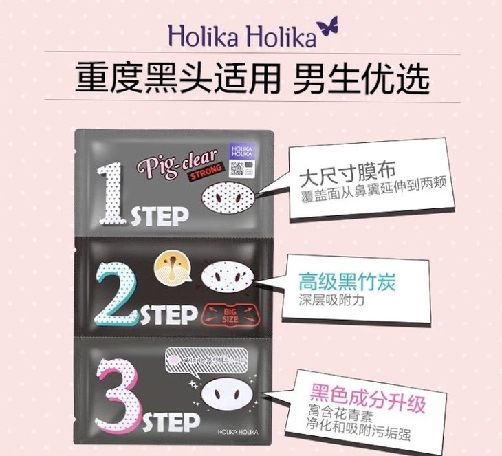 HolikaHolika除黑头猪鼻贴 #黑👍猪鼻贴鼻祖当属Holika,这款是继经典款猪鼻子又一力作👏,更强劲的吸附力令吸黑头效果更佳!强力款⬆,适合重度人群,吸附能力强,而且是加大尺寸的哦,👨男士很推荐用。分三个环节,可以很好的去鼻部黑头和油脂👊,防止黑头再次长出来。一周2片,10片一个周期🕓,坚持使用毛孔垃圾自然会变少,告别草莓鼻🍓~