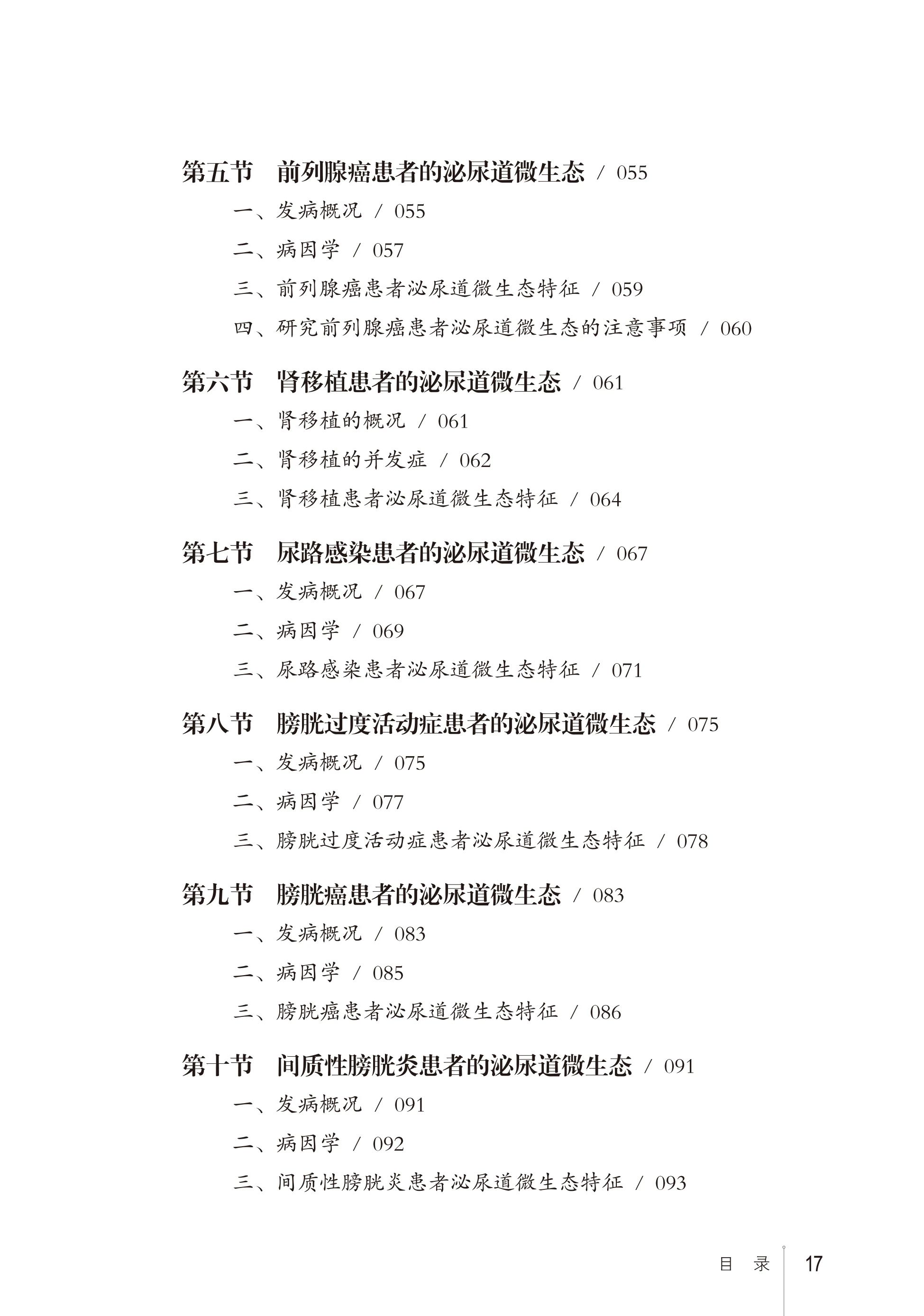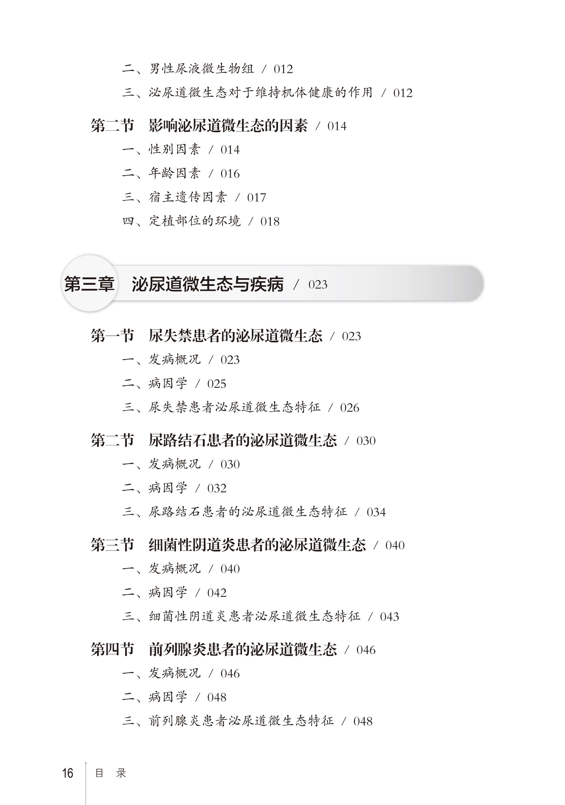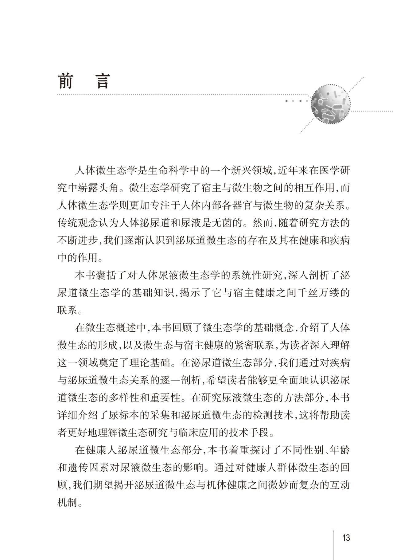 在微生态概述中,本书回顾了微生态学的基础概念,介绍了人体微生态的形成,以及微生态与宿主健康的紧密联系,为读者深入理解这一领域奠定了理论基础。在泌尿道微生态部分,我们通过对疾病与泌尿道微生态关系的逐一剖析,希望读者能够更全面地认识泌尿道微生态的多样性和重要性。在研究尿液微生态的方法部分,本书详细介绍了尿标本的采集和泌尿道微生态的检测技术,这将帮助读者更好地理解微生态研究与临床应用的技术手段。