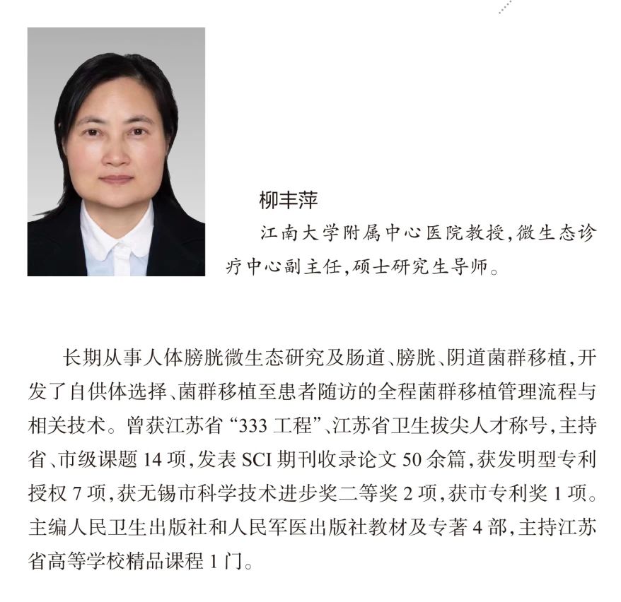 李学松:北京大学第一医院泌尿外科主任、主任医师、教授 ,北京大学医学部博士研究生导师, 博士后导师。北京大学泌尿外科医师培训学院副院长,北京大学第一医院泌尿外科上尿路修复专业组组长,北京泌尿内腔镜博物馆馆长。柳丰萍:江南大学附属中心医院教授,微生态诊疗中心副主任,硕士研究生导师。长期从事人体膀胱微生态研究及肠道、膀胱、阴道菌群移植,开发了自供体选择、菌群移植至患者随访的全程菌群移植管理流程与相关技术。