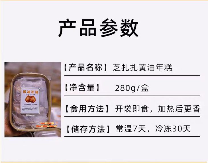 品名:浙江黄油年糕 规格:8枚280g/盒*2盒;拍几份发几个包裹,不一定能同时到达,请耐心等待 发货地/产地:浙江台州 保质期:常温7天,冷冻30天 包装方式:盒装 物流信息:默认中通快递,不支持指定快递 发货区域:新疆、西藏不发; 物流详情:周六、周日及节假日除外,正常48小时内发货,到货时间约为2~5天,请耐心等待 售后说明:收到货后有质量问题,在24小时内都可以拍照(坏品+快递单面箱子一起拍)上传,申请按坏品比例理赔或联系客服,生鲜性质特殊,因地址错误,手机号联系不上,拒收等造成的损失无法售后,请理解; |
