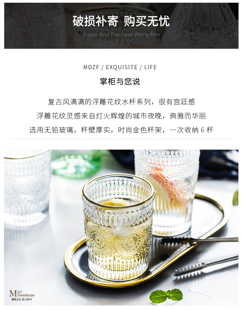 摩登主妇玻璃杯浮雕家用水杯套装女ins风金边夏季太阳花咖啡杯子