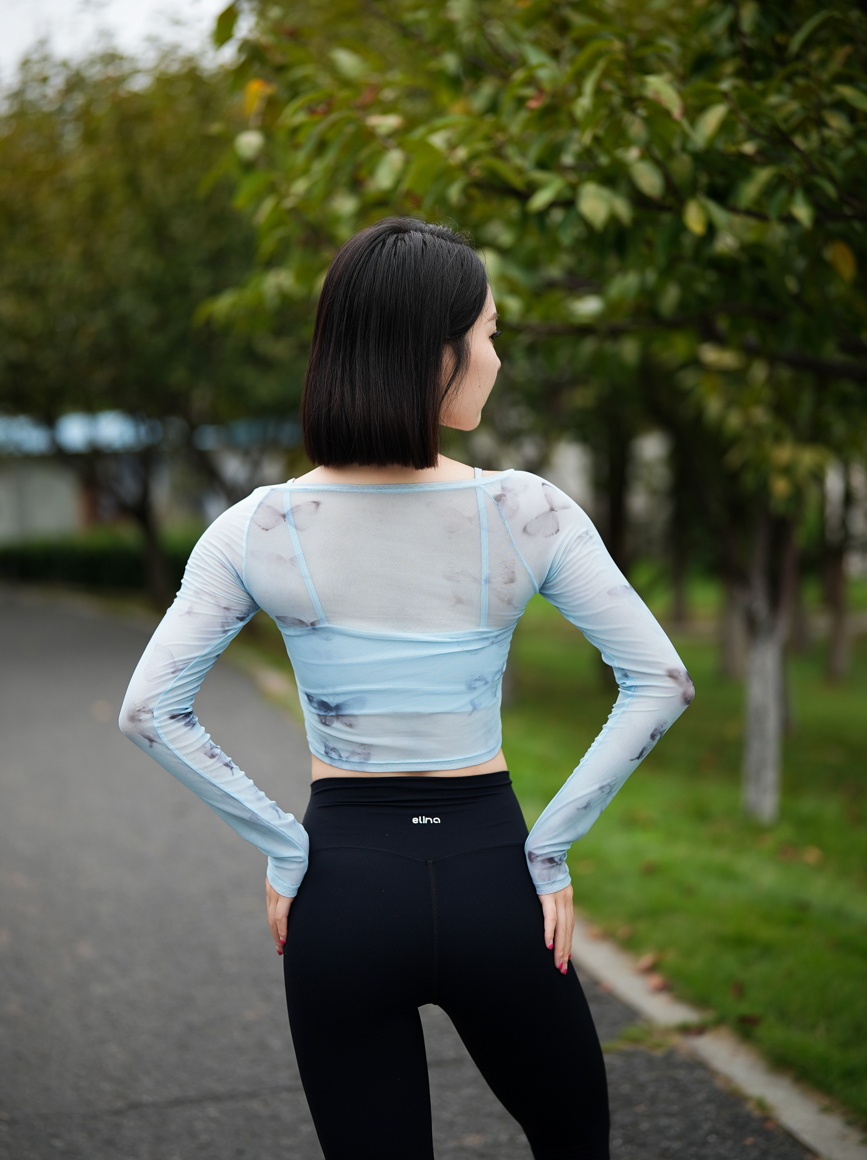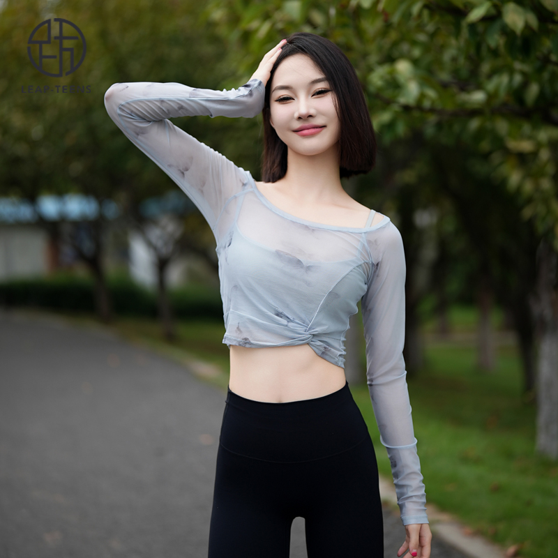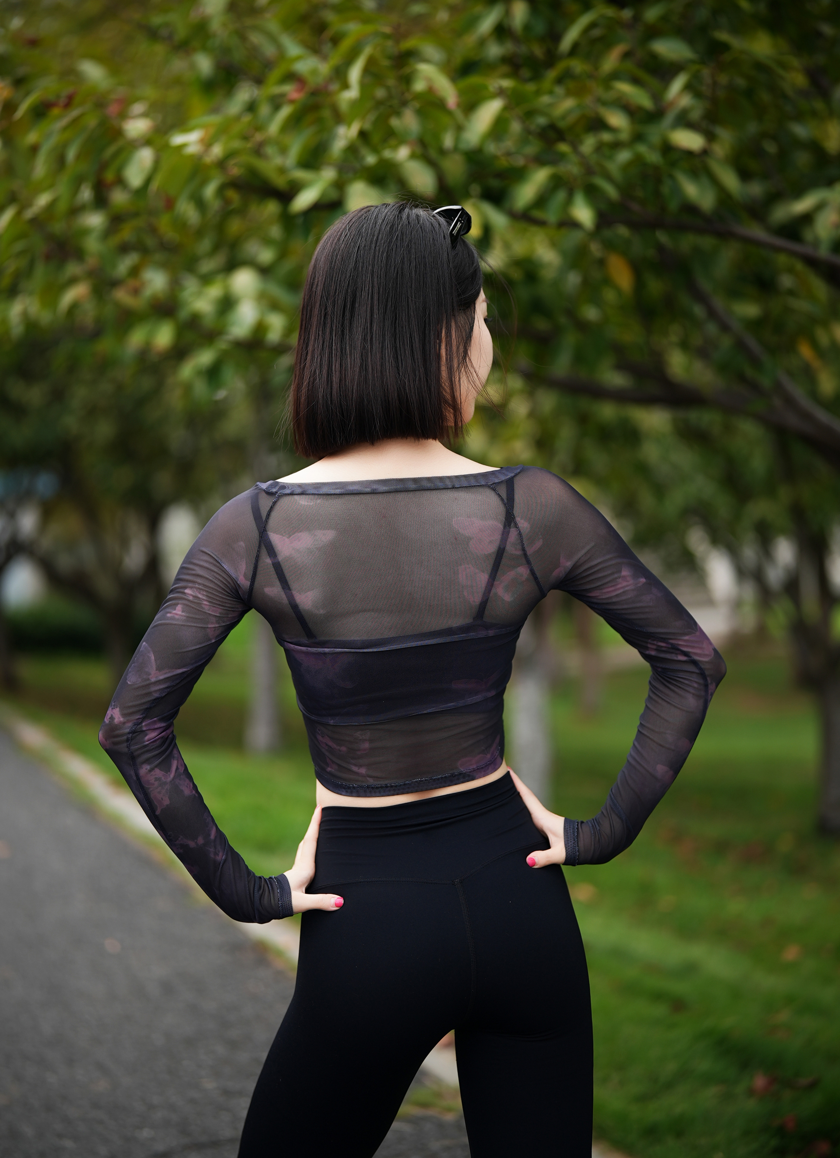 跃牌【禅语梵心】花蝴蝶假两件运动T恤女长袖带胸垫瑜珈服网纱上衣速干显瘦健身衣CX2925