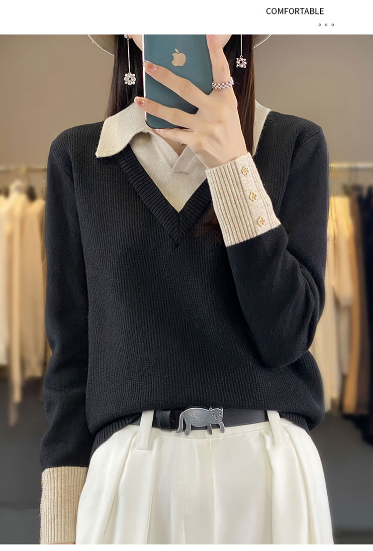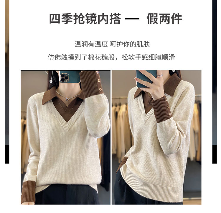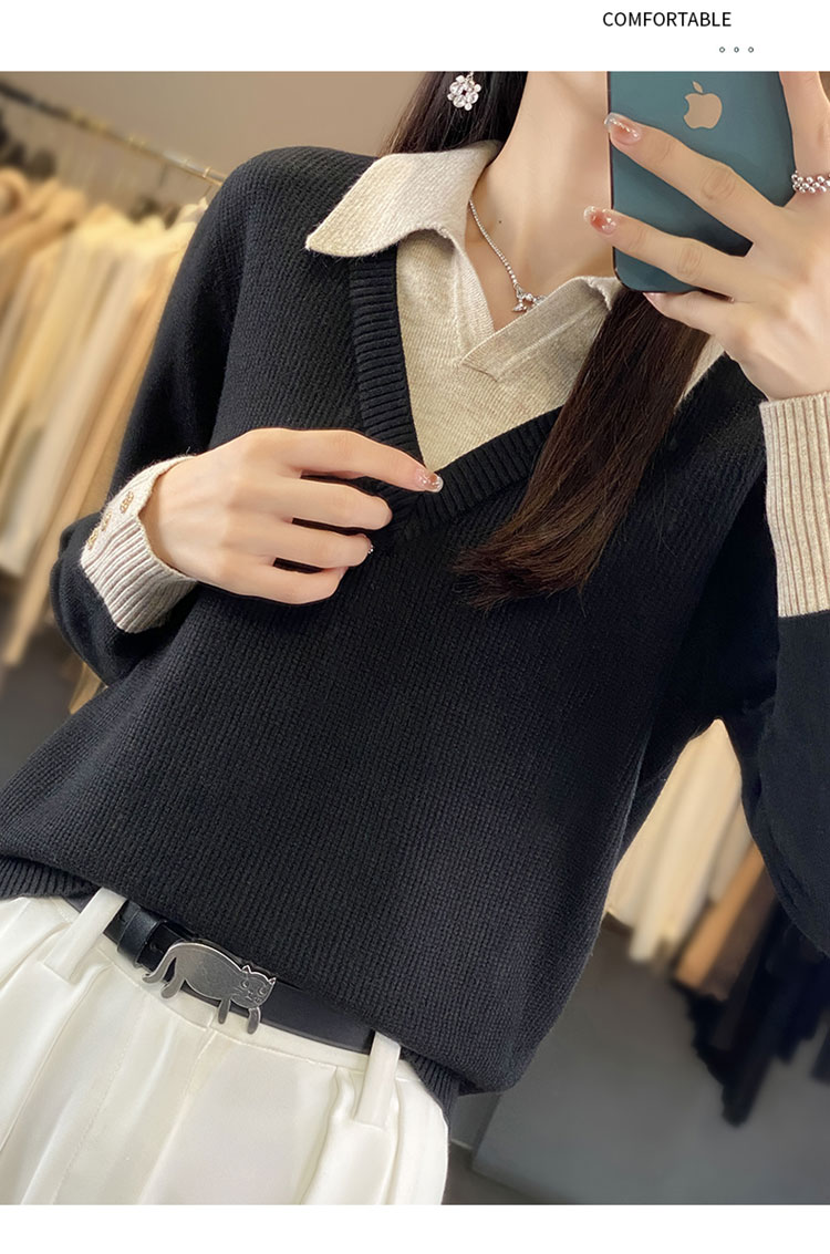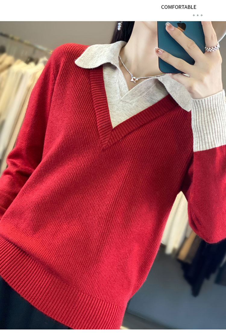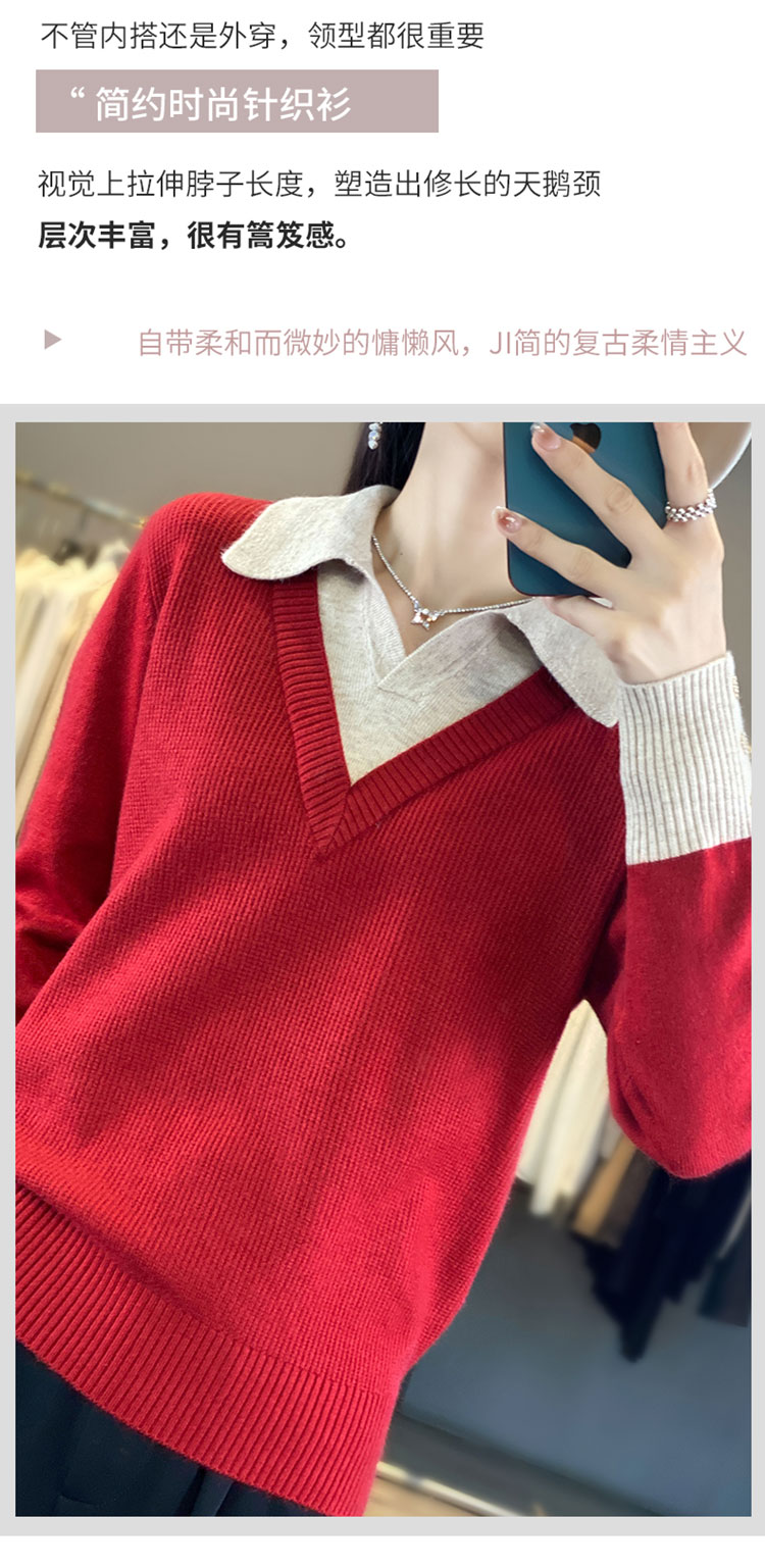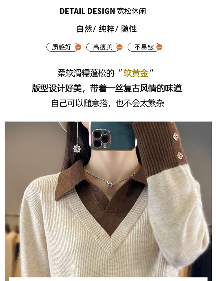 【三石专属】SimpleRetro午后微风 法式撞色假两件荡领t恤女秋设计感长袖上衣