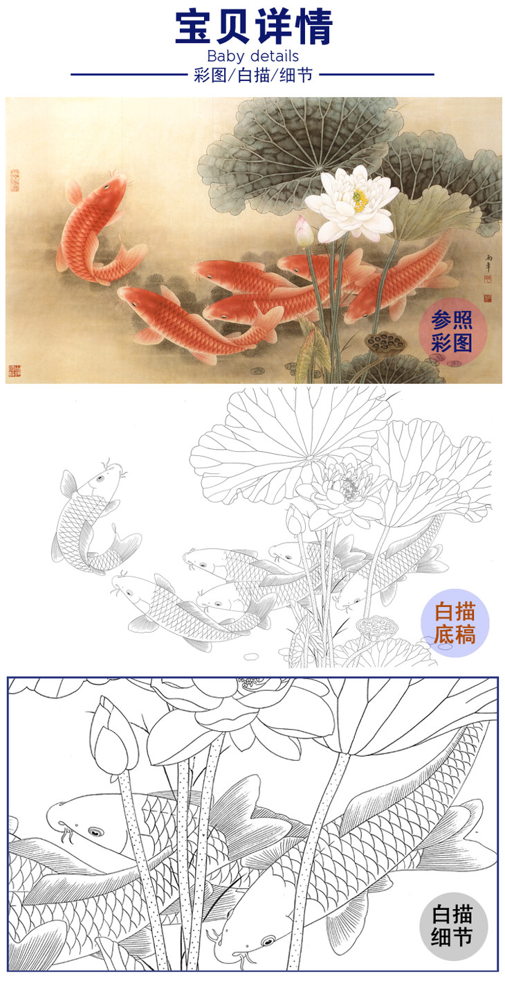 横幅四尺六尺工笔花鸟白描底稿-路雨年-荷花鱼-A155