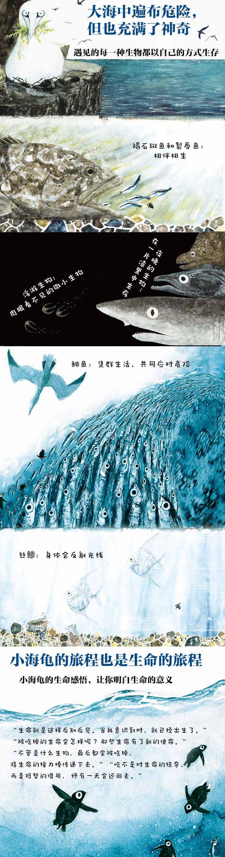 这本书从小海龟的角度讲述了一次特别而惊险的海洋之旅。沙滩里100颗沉睡的海龟蛋一一裂开,蛋里的小海龟破壳而出,一小步一小步地迈向被阳光照得闪闪发亮的大海,展开短暂生命的大海之旅。从蛋壳中出来的那一刻,小海龟注定会面对危机四伏的海洋之旅。它遇见了贪吃的浣熊、大白鹭、随着光线游动的丝鲹、相伴相生的裂唇鱼和褐石斑鱼、夜晚出没的鱼、北方鲣鸟、座头鲸和一只大海龟!小海龟随时可能葬身大海,而它遇到的所有生物,也都会有死亡之时。在大海中的弱肉强食的食物链下,每个生命都依循着大自然的规则吃与被吃。不论是什么生物,结果都会被吃掉,成为孕育下个生命的食粮。这才是大自然本质、天然的模样。