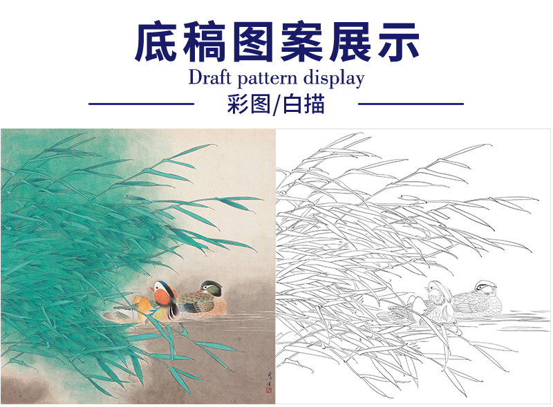 周彦生花鸟工笔画白描底稿《戏水鸳鸯》四尺斗方临摹勾线高清打印稿A669