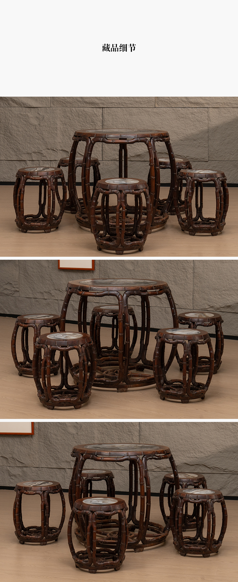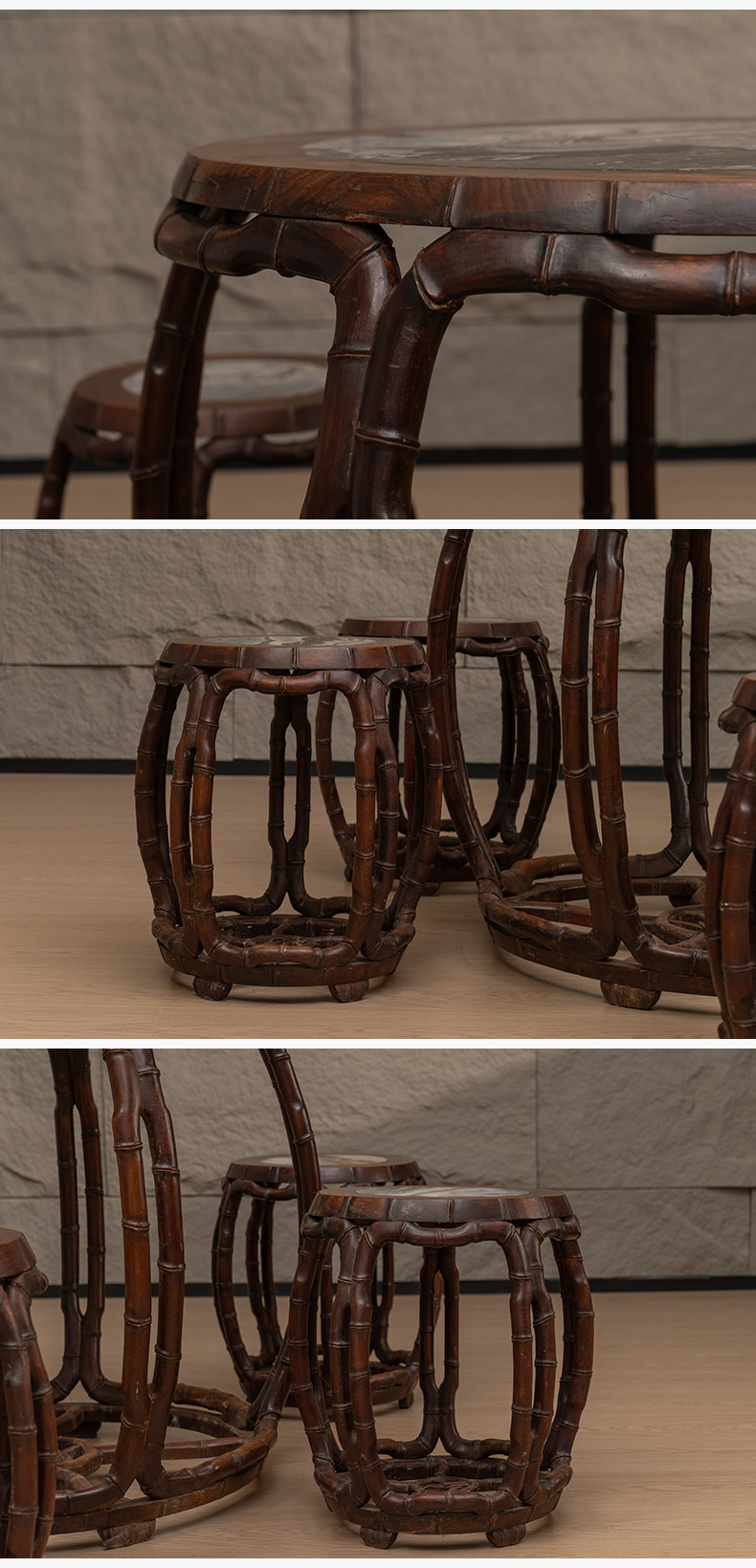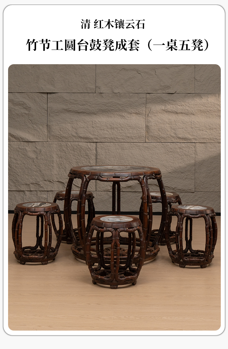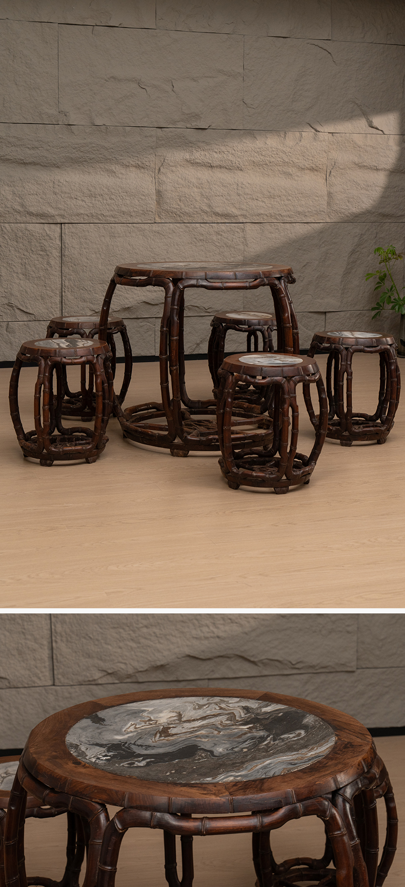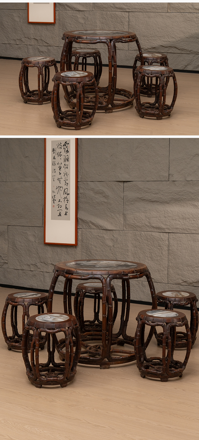 清 红木镶云石竹节工圆台鼓凳成套(一桌五凳)