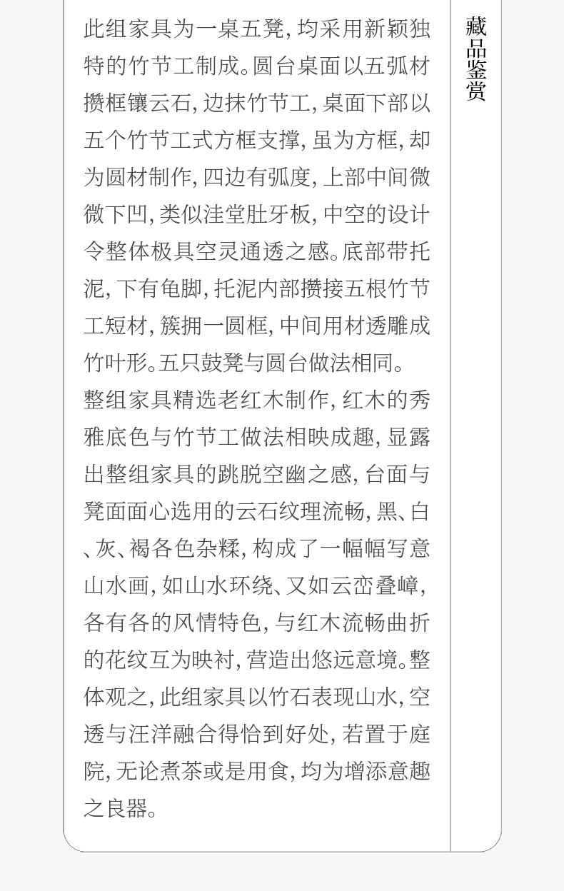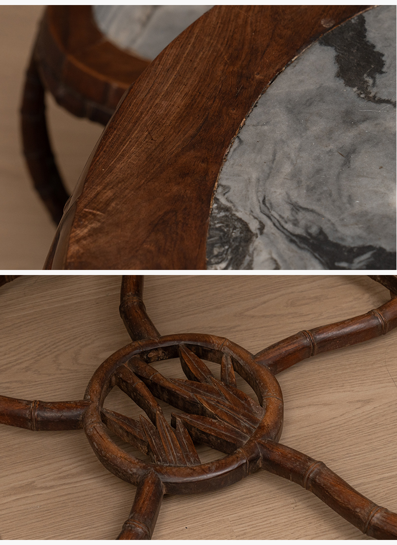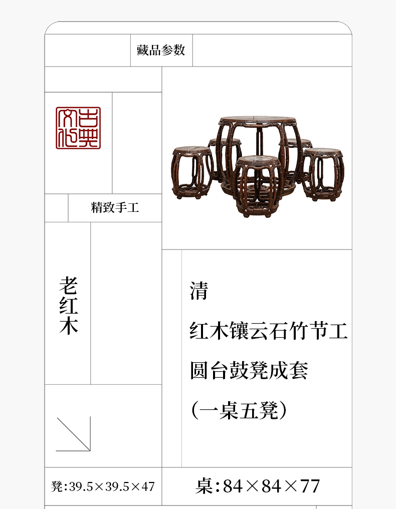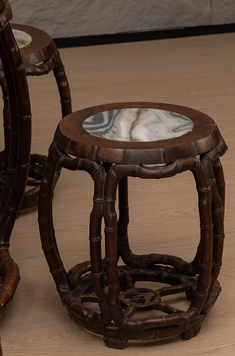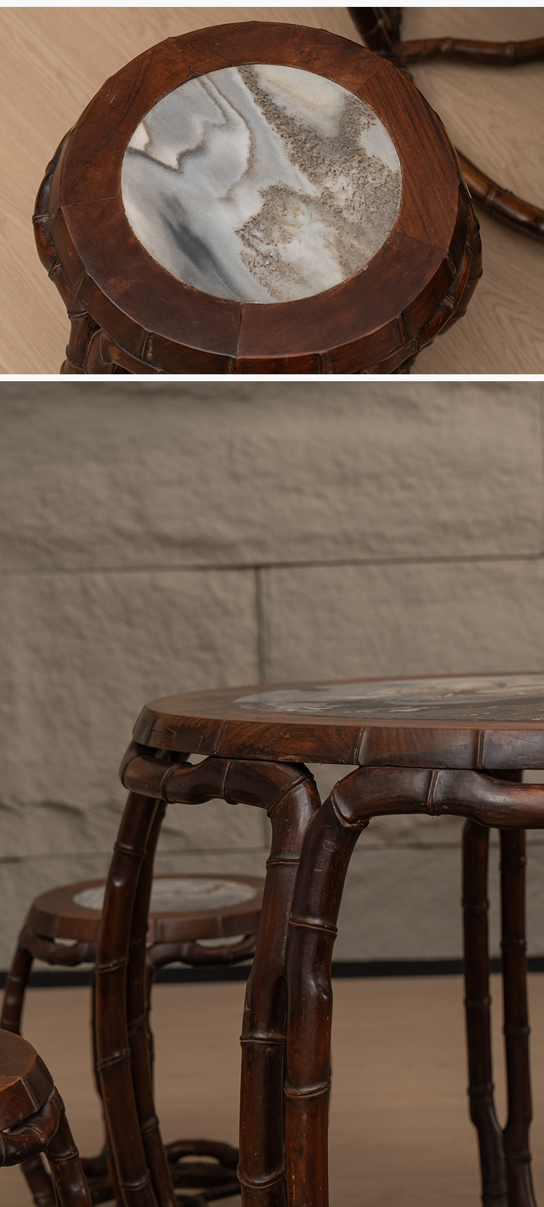清 红木镶云石竹节工圆台鼓凳成套(一桌五凳)