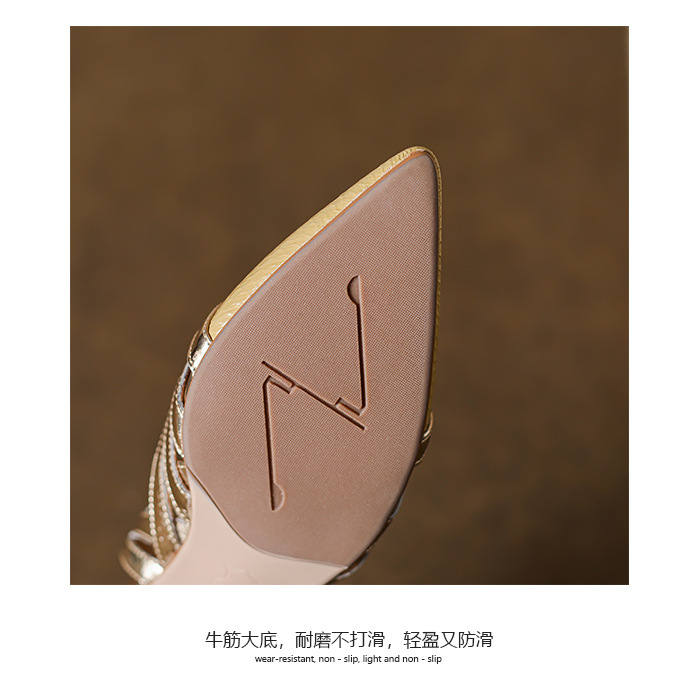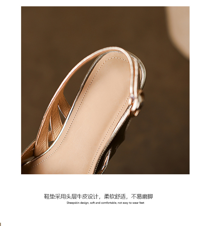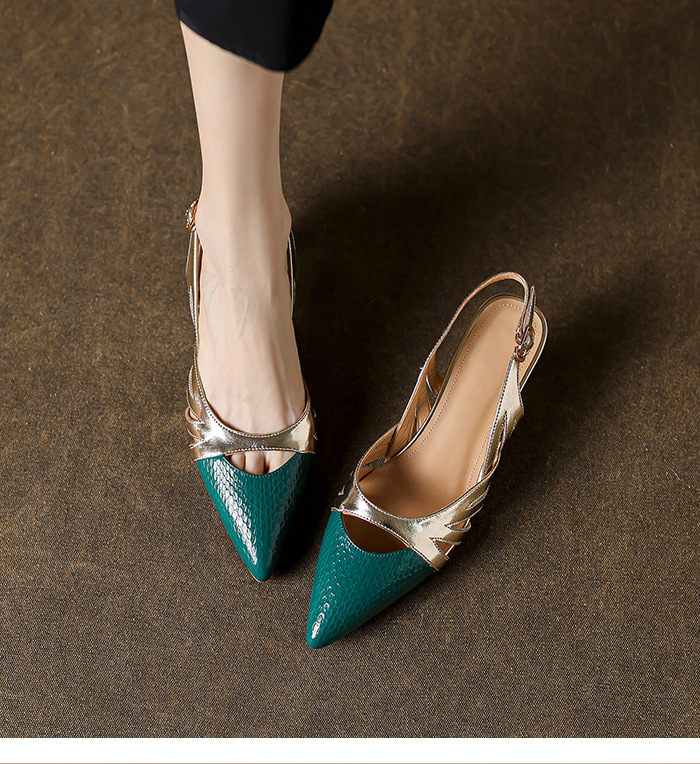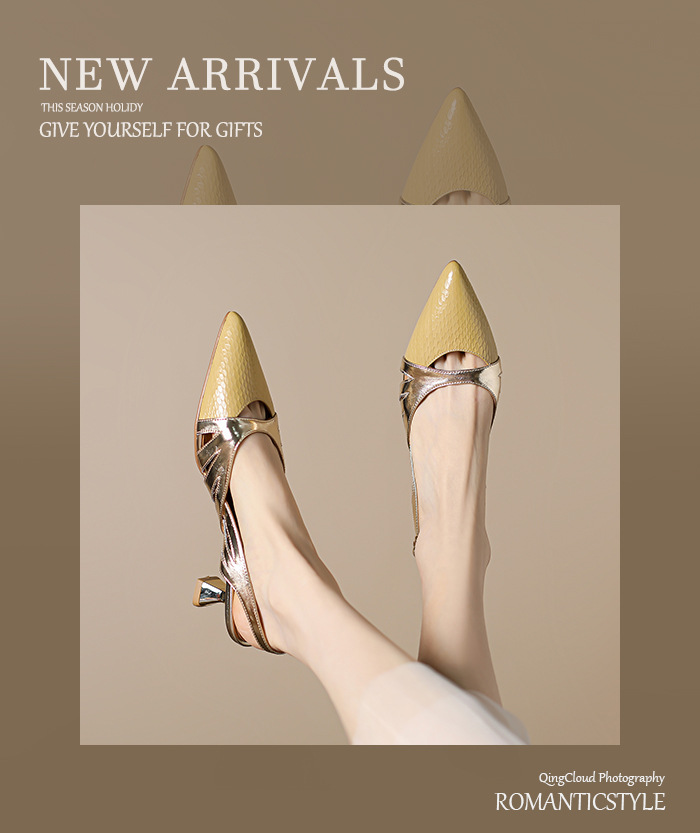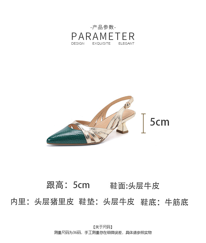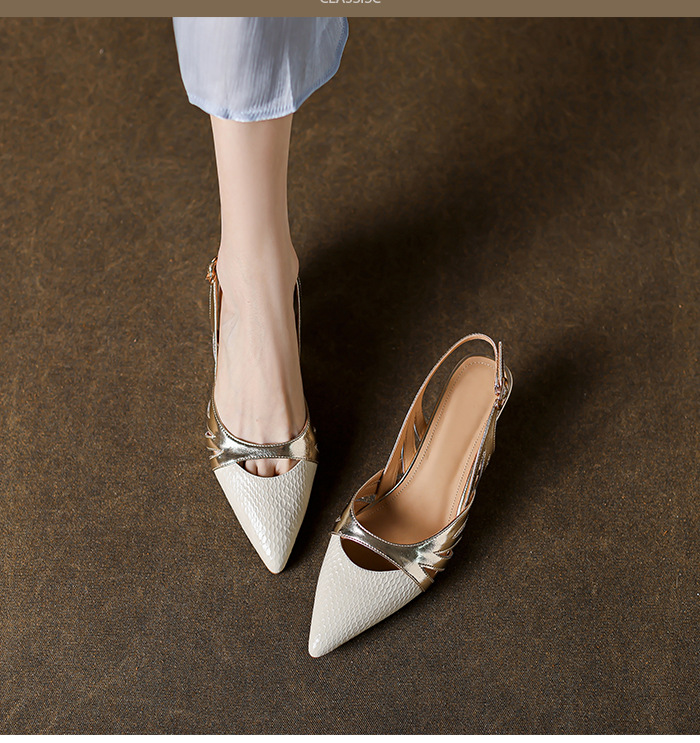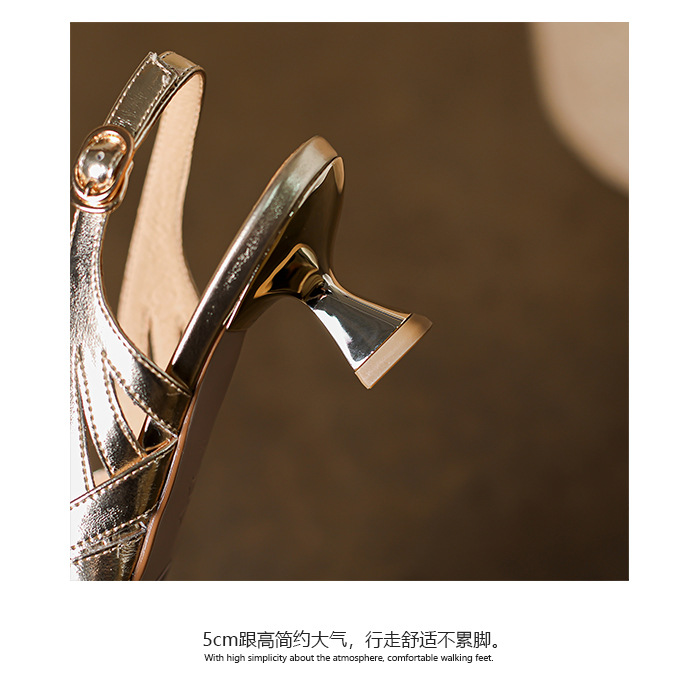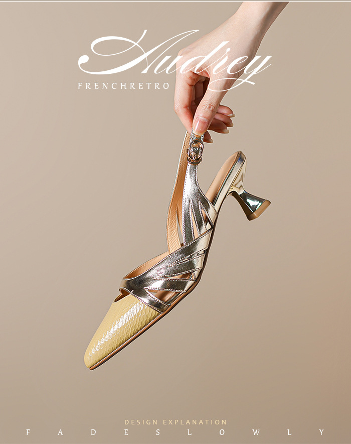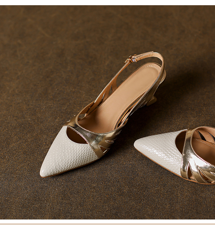OLD-602拼色高跟鞋2023新款漆皮镂空丁字扣法式尖头罗马包头粗跟凉鞋