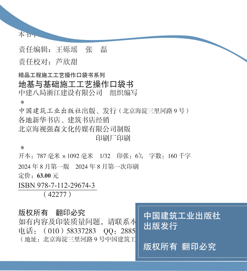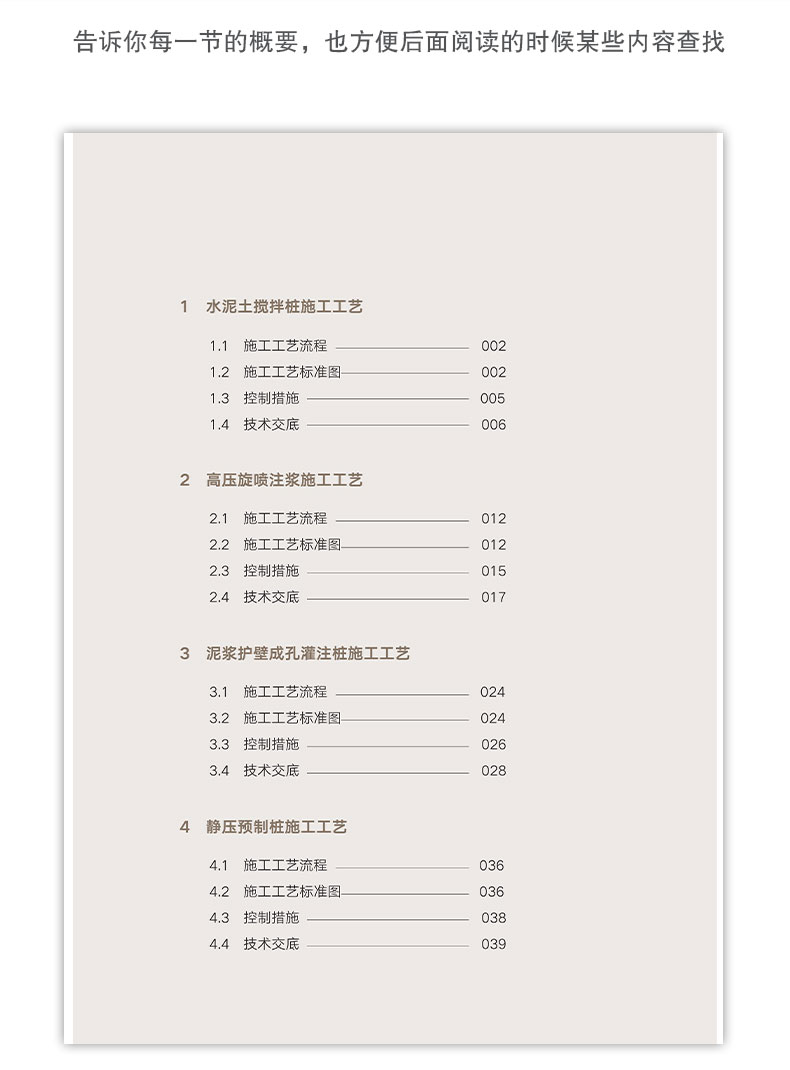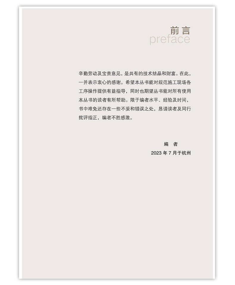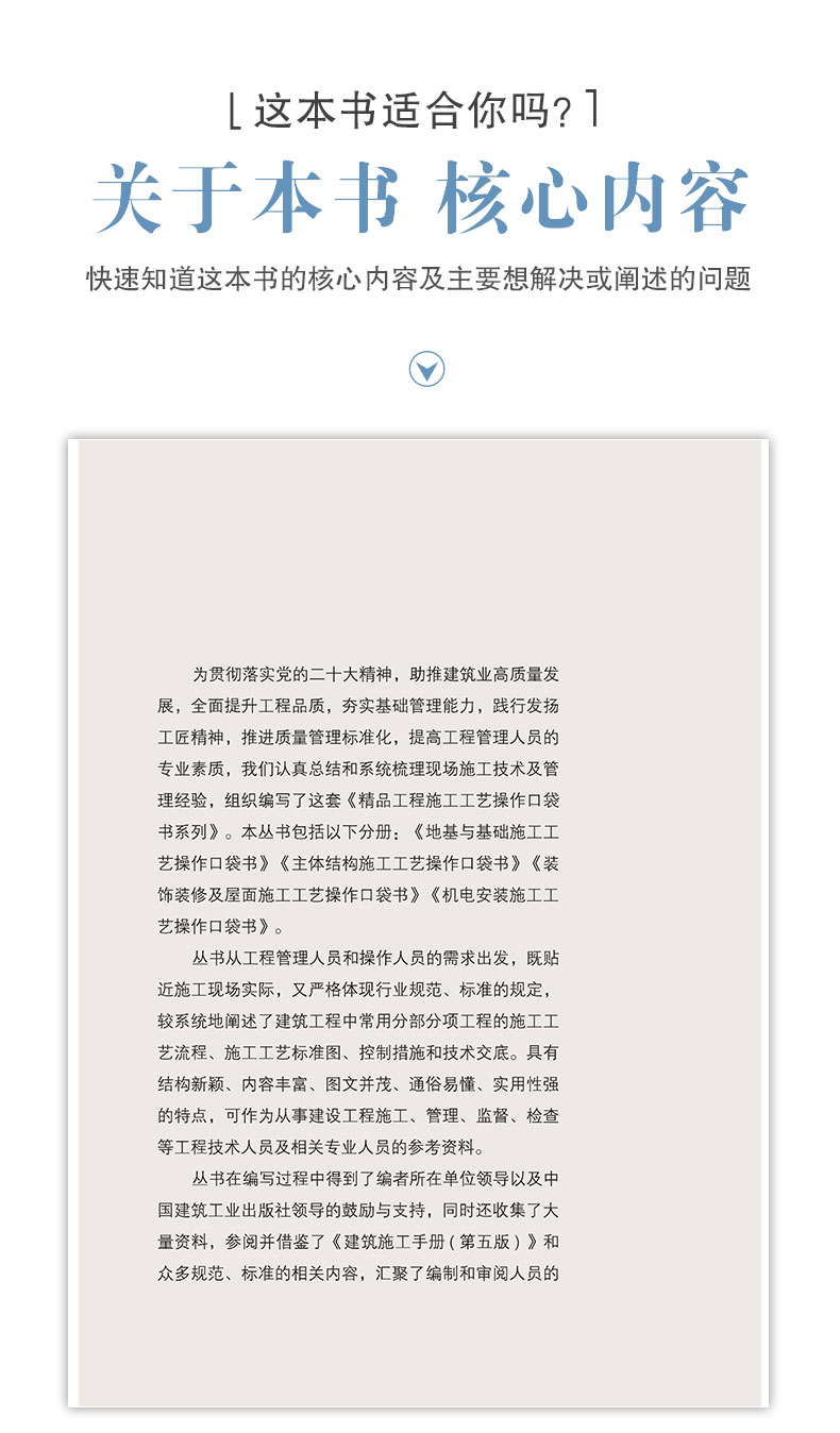 精品工程施工工艺操作口袋书系列共分为四个分册,包括地基与基础施工工艺操作口袋书、主体结构施工工艺操作口袋书、装饰装修及屋面施工工艺操作口袋书、机电安装施工工艺操作操作口袋书。书中内容从工程管理人员和操作人员的需求出发,既贴近施工现场实际,又严格体现行业规范、标准的规定,较系统地阐述了建筑工程中常用分部分项工程的施工工艺流程、施工工艺标准图、控制措施和技术交底。具有结构新颖、内容丰富、图文并茂、通俗易懂、实用性强的特点,可作为从事建设工程施工、管理、监督、检查等工程技术人员及相关专业人员的参考资料。