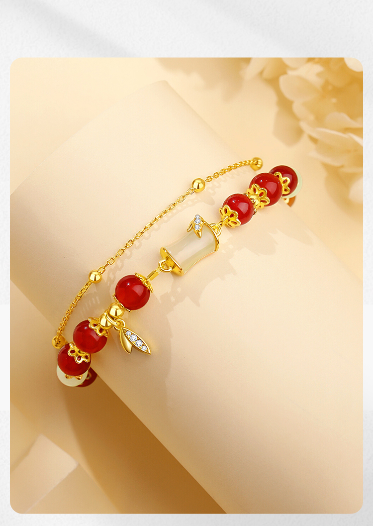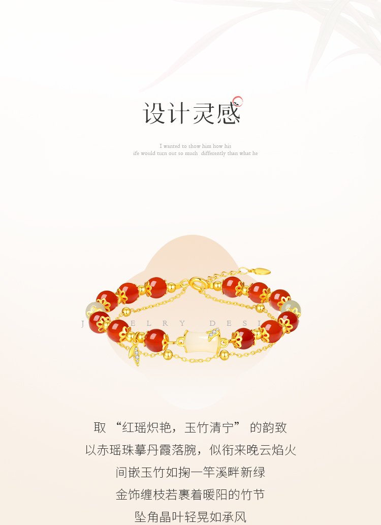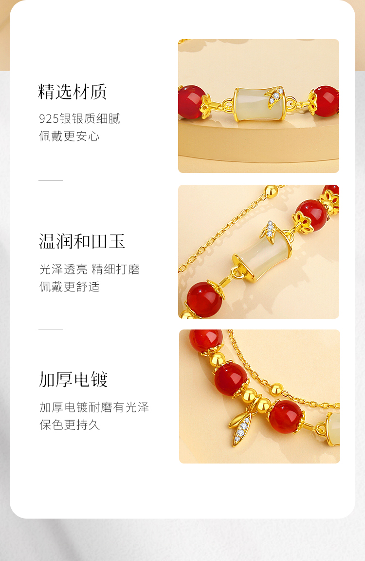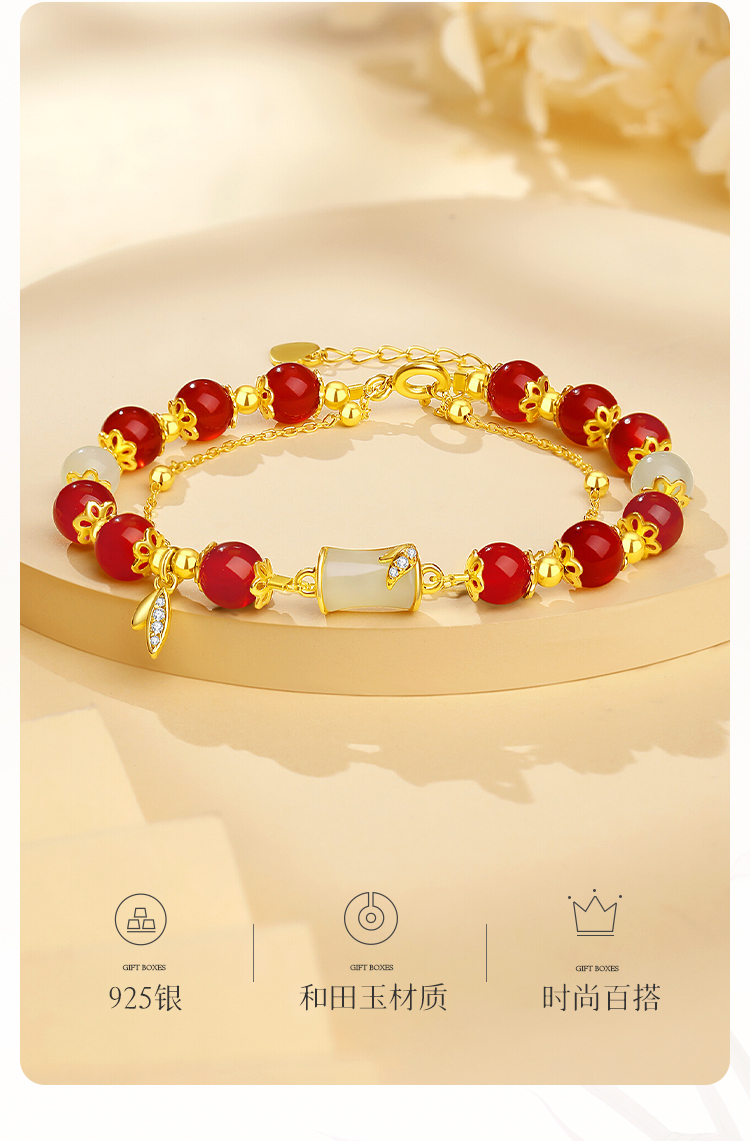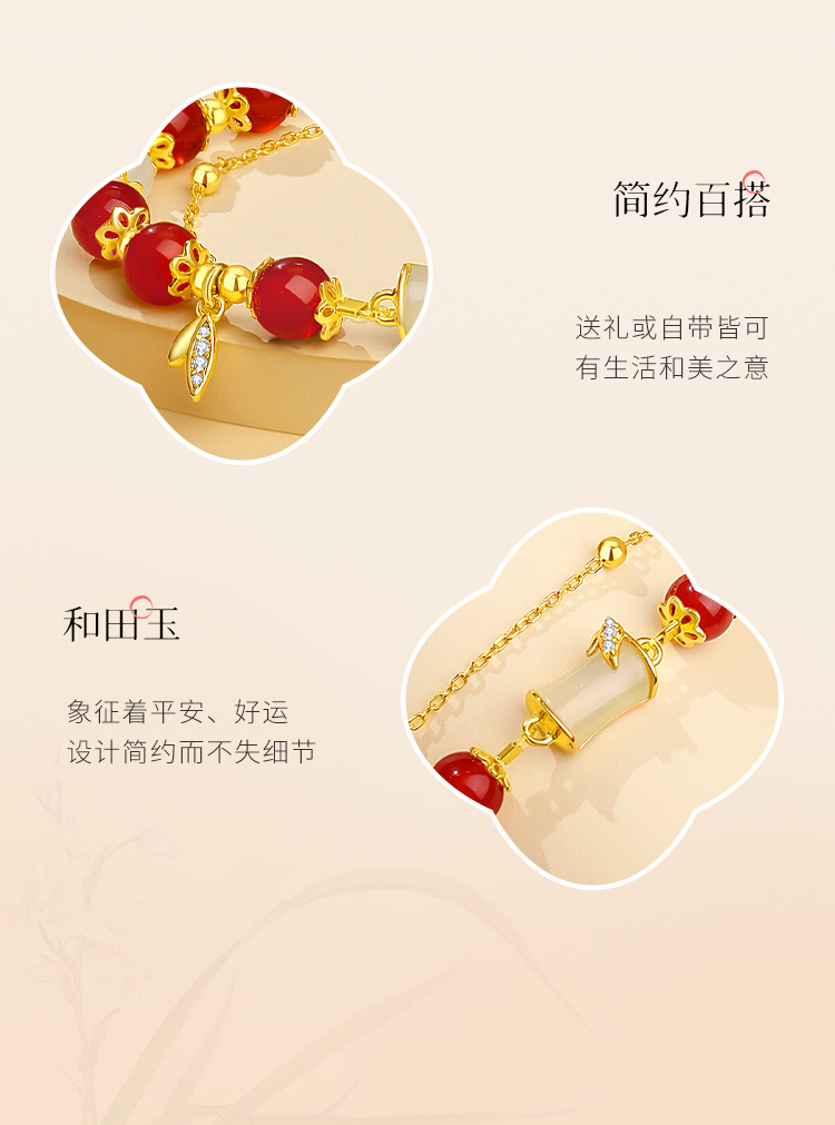 Winy S925 银镀金红瑶玉竹手链 玉髓和田玉 合成立方氧化锆带证书