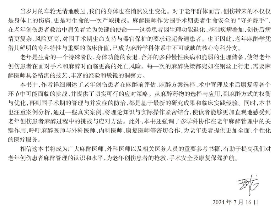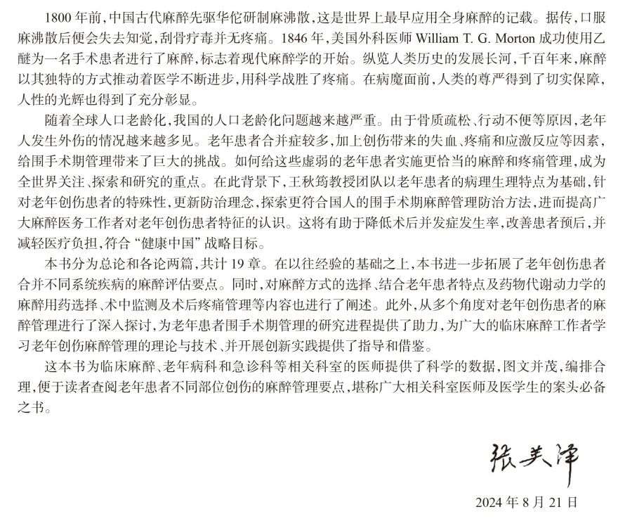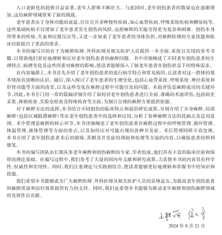 作者详细阐述了老年创伤患者在麻醉前评估、麻醉方案选择、术中管理及术后康复等各个环节中可能面临的挑战,并提供了切实可行的应对策略。相信这本书将成为广大麻醉医师、外科医师及相关医务人员的重要参考书籍,有助于提高我们对老年创伤患者麻醉管理的认识和水平,为老年创伤患者的抢救、手术安全及康复保驾护航。