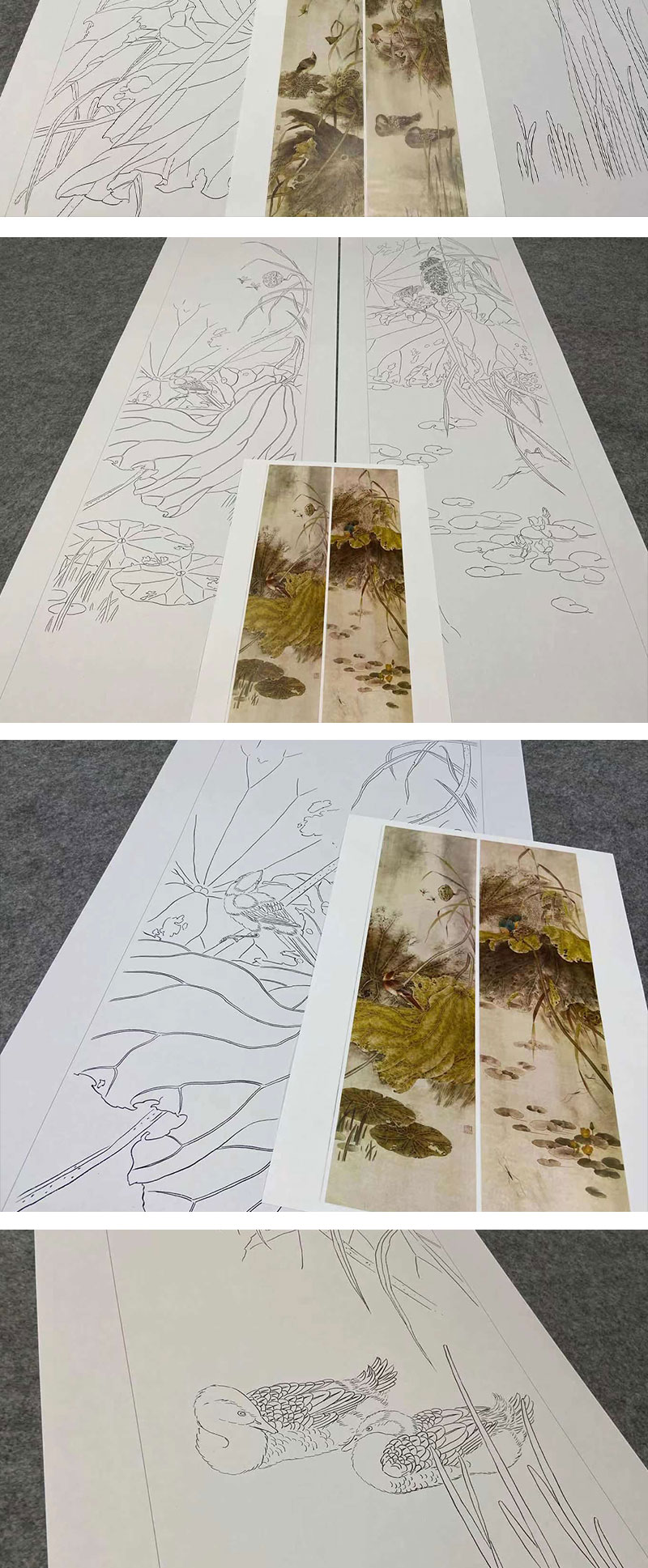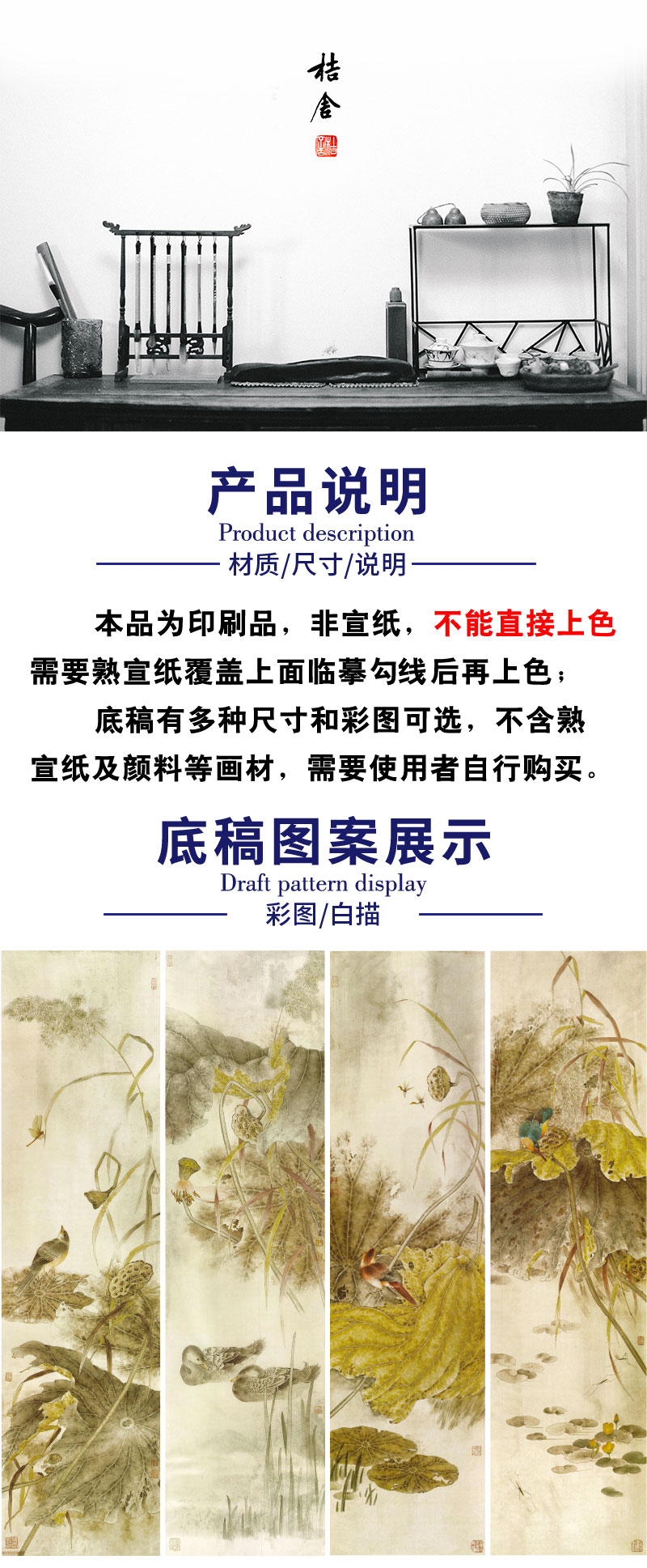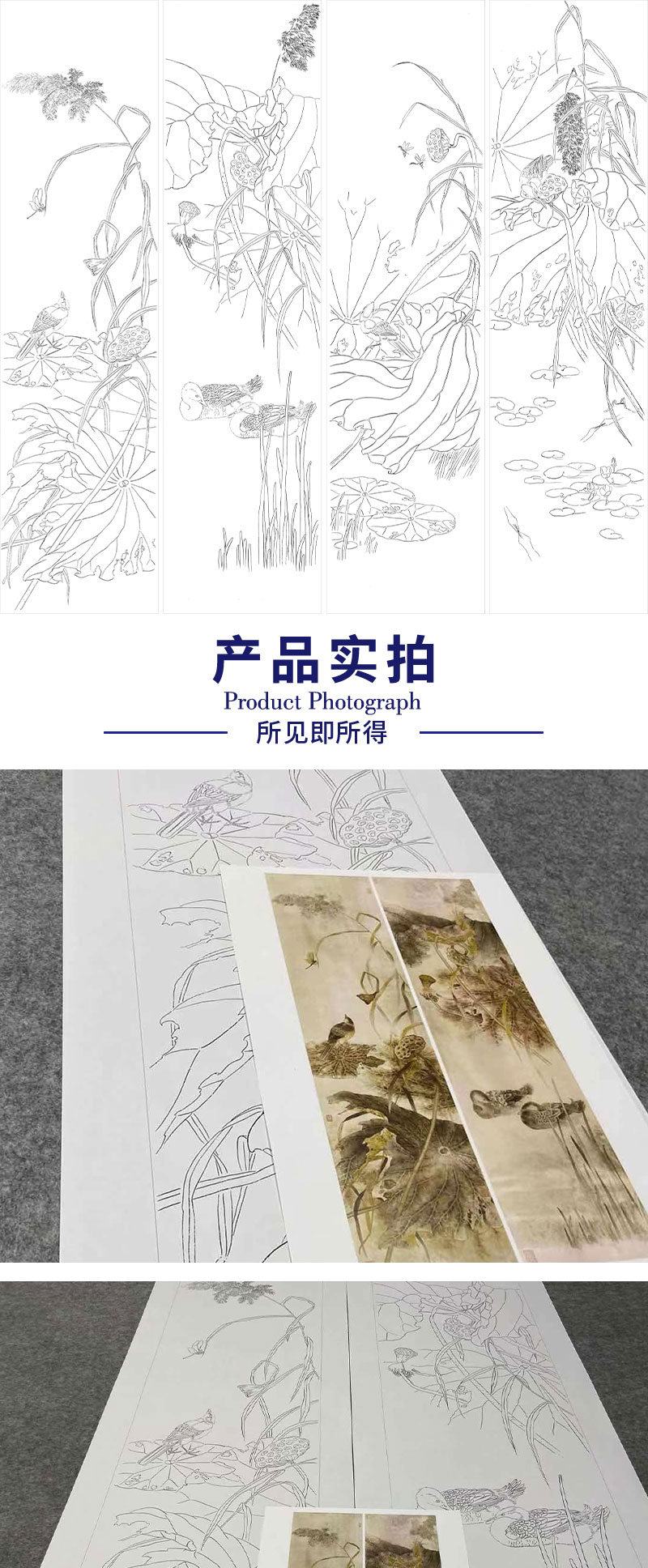 【四条屏】工笔画白描底稿荷花临摹勾线花鸟线稿TP08