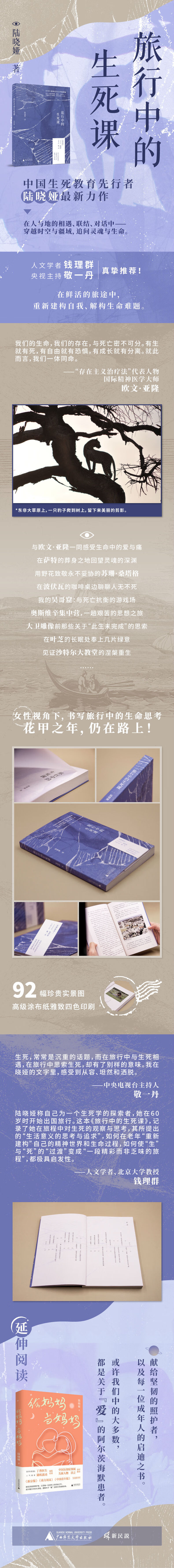 在作者丰沛的书写里,生命与死亡是线索,串联了时代、地域、风景、人物、文化、历史、文学、学术等诸多方面和她自己的故事。旅行与写作,让她能不断建构自我的精神世界,更勇敢地面对后一段生命旅程。
