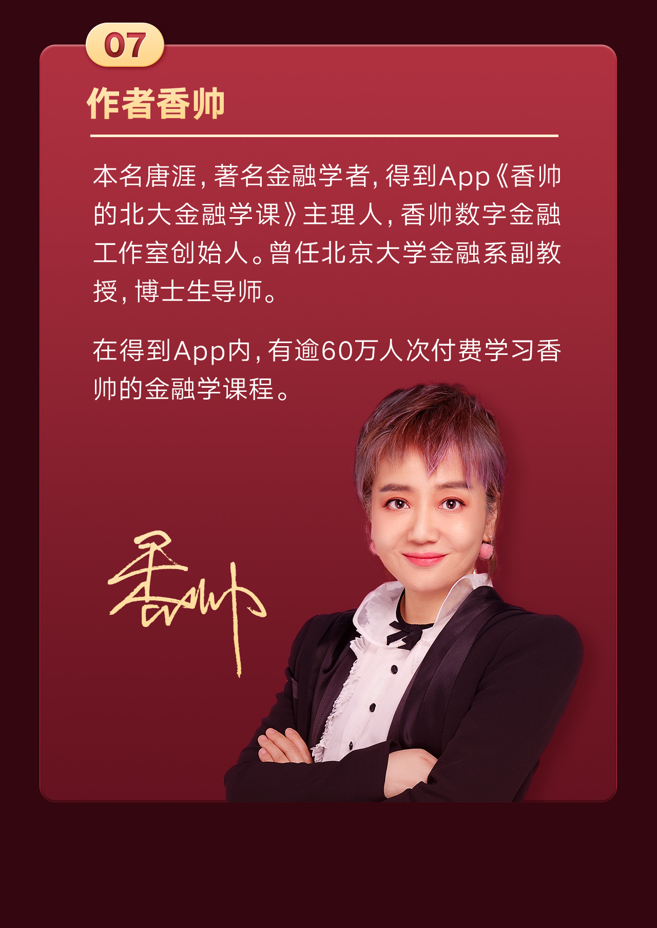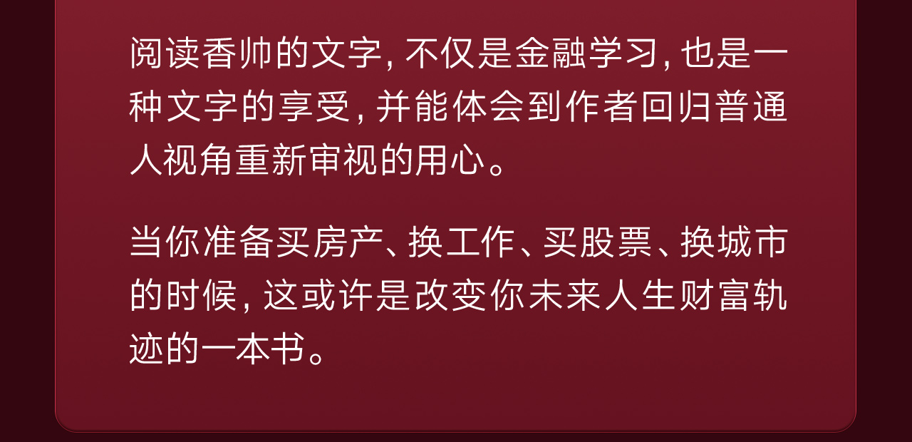 ●这本金融学专著看得懂、用得上、有成效 香帅是为数不多的能把金融学写得让普通人也能看得懂的专业金融学者,帮助普通人更高效地找到自己在财富版图上的位置以及未来的上升通道。 ●属于每一个中国普通家庭的财富指南 如何减小通胀对我们财富水平的影响、学区房还有没有价值、房价还会不会涨、基金业绩还会反转吗、未来3—5年的家庭投资该怎么做、…… 这些困扰中国普通家庭的“日常性疼痛”,在书中都能找到解决的线索。