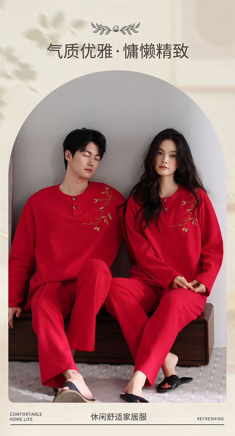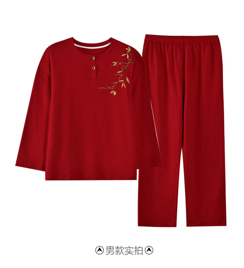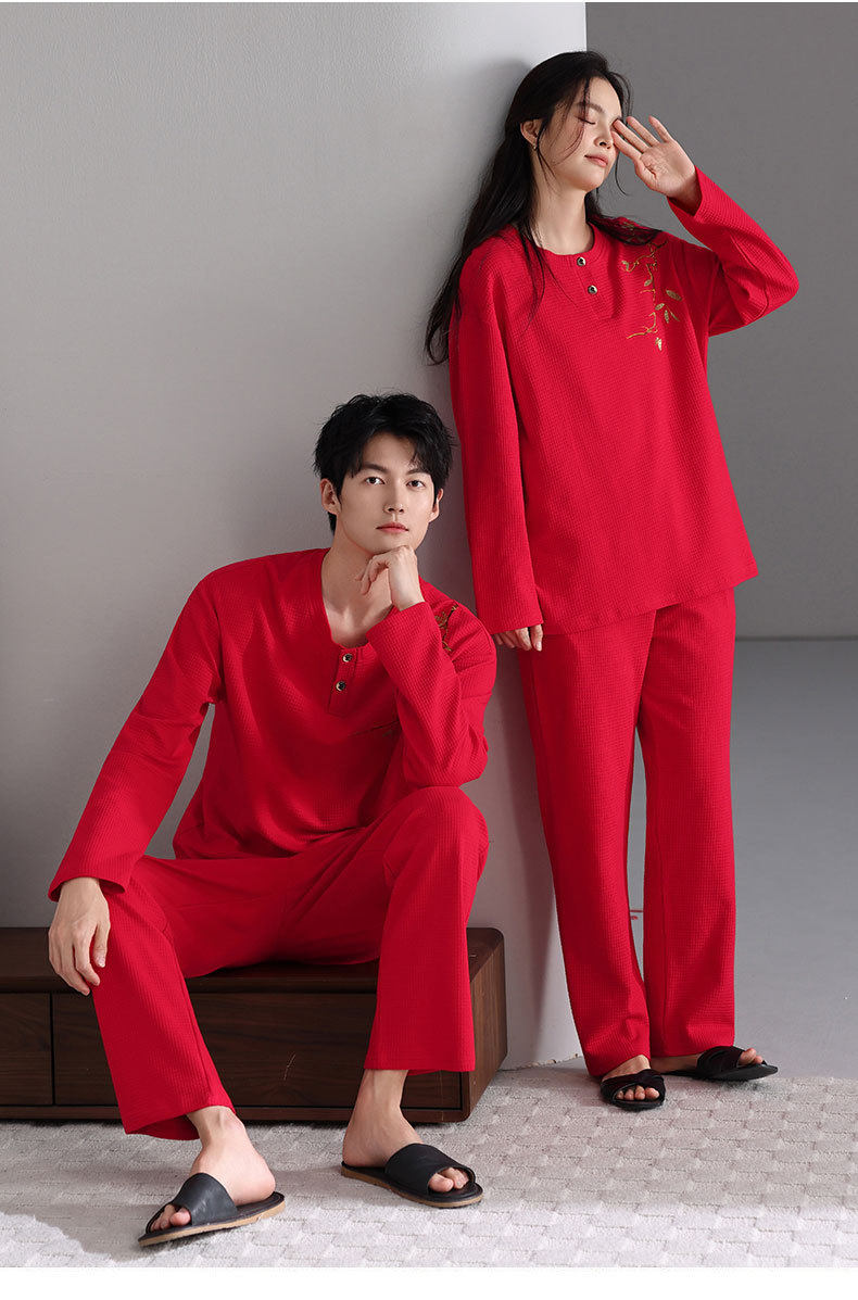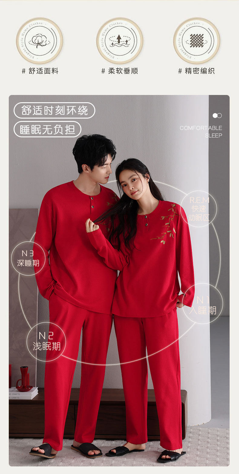 纯棉华夫格情侣睡衣女长袖长裤套装秋季简约风中青年可外穿家居服 JL-NQT9080/NQT8080