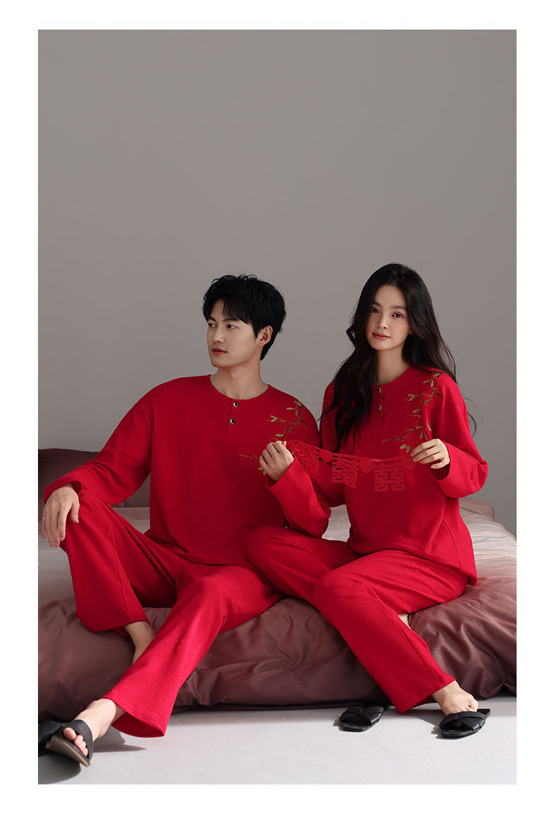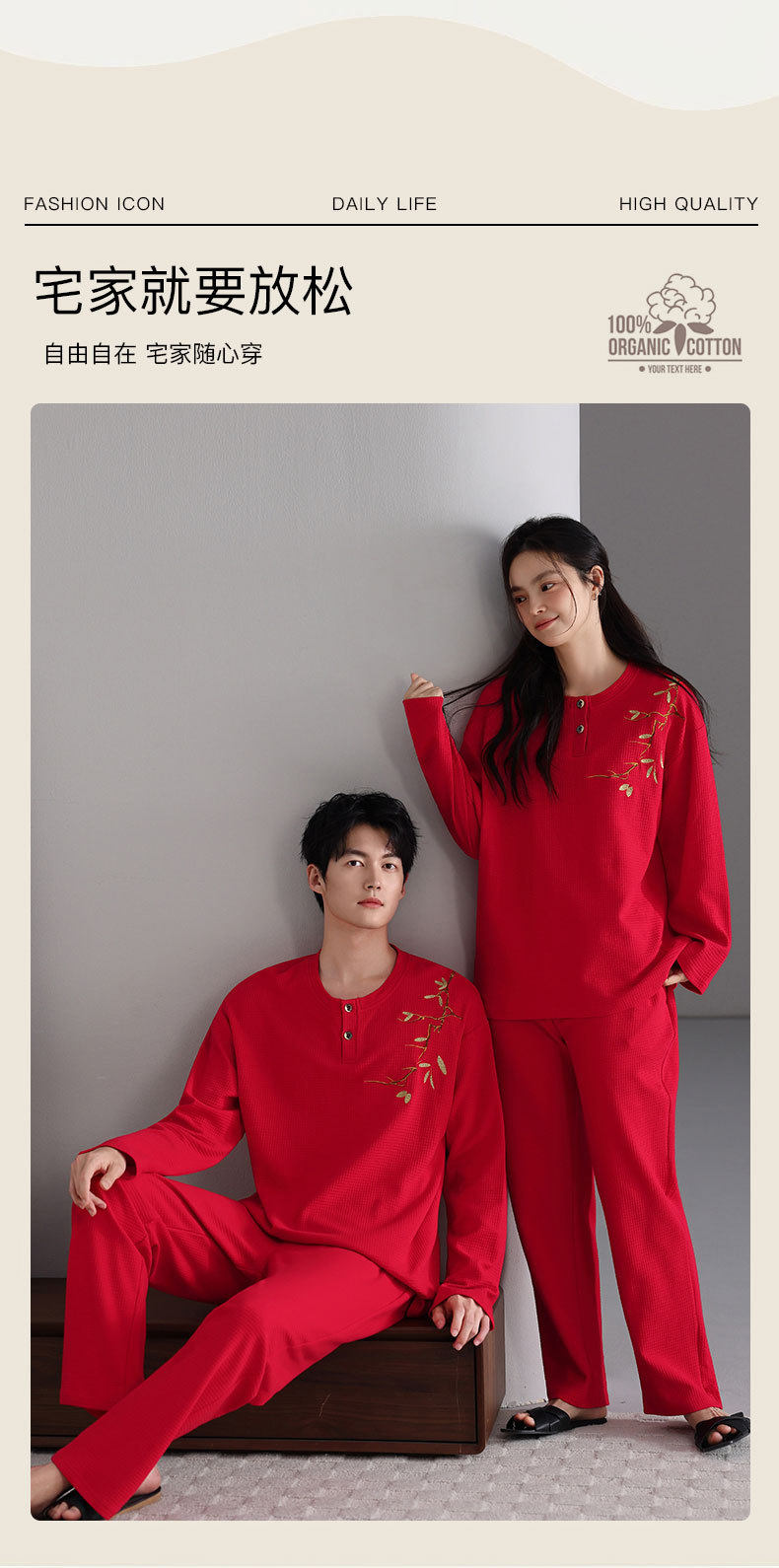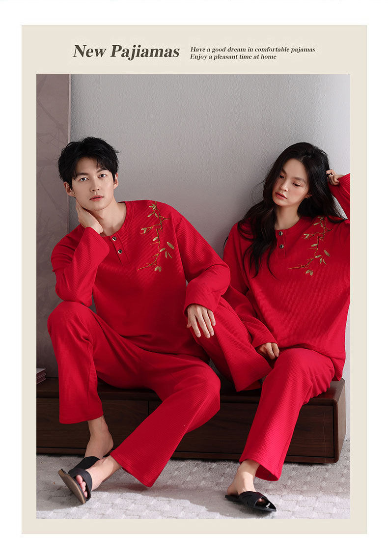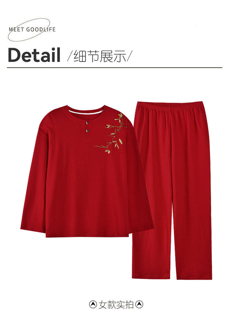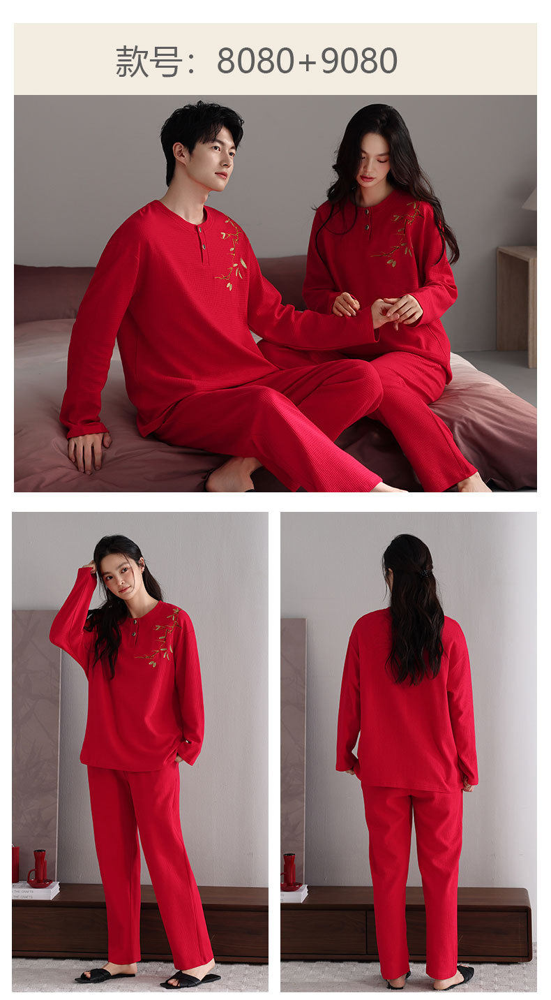 纯棉华夫格情侣睡衣女长袖长裤套装秋季简约风中青年可外穿家居服 JL-NQT9080/NQT8080