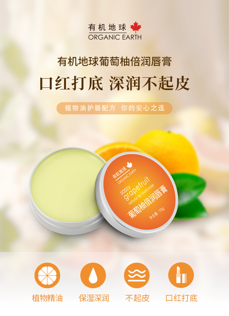 葡萄柚倍润唇膏 | 10g/罐 植物精油护唇配方 妆前打底 8小时润泽保湿 含蜂蜡 有机地球