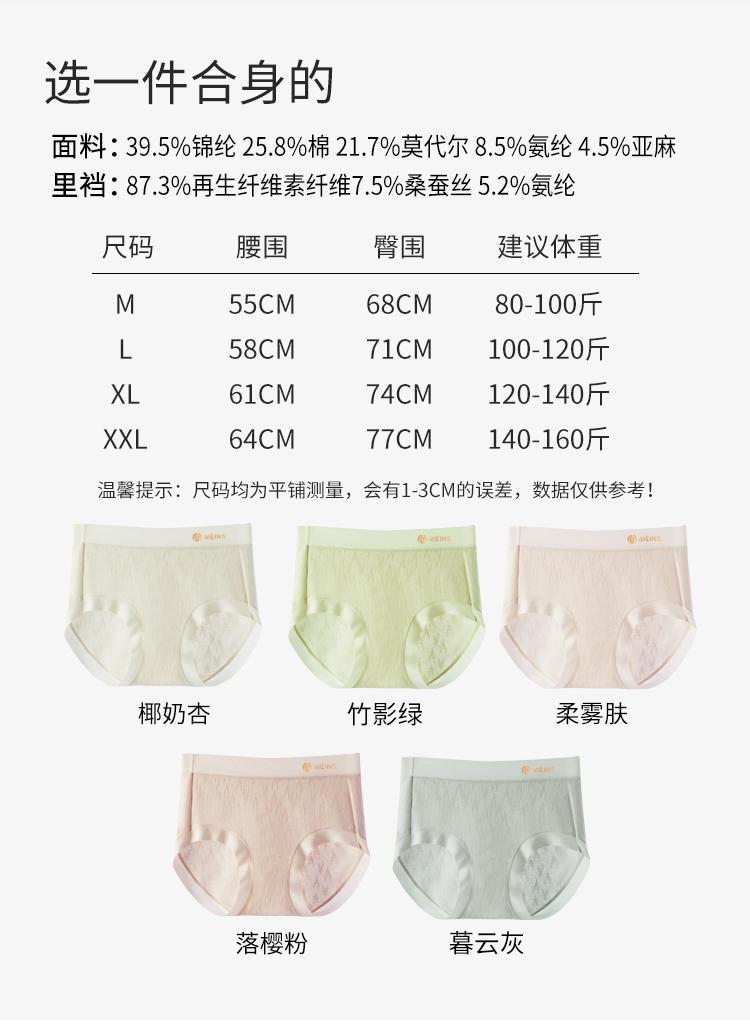 【品名】【超值3条装】MEINS/梅因斯 天然亚麻呼吸裤 女士内裤 清爽透气 【规格】 椰奶杏+柔雾肤+竹影绿 落樱粉+椰奶杏+暮云灰 【尺码】M-2XL 【产地】国内 【材质】 面料:锦纶39.5% 棉25.8% 莫代尔21.7% 氨纶8.5% 亚麻4.5% 里裆:再生纤维素纤维87.3% 桑蚕丝7.5% 氨纶5.2% 【发货包装】独立包装 【发货地】浙江、广东随机发 【发货快递】中通、申通随机发 【补邮费地区】新疆、西藏+10元 【发货时效】48-72小时,周末节假日顺延 【特别提醒】因产品属于贴身衣物,非质量问题,拆封后是不支持退换的,敬请谅解~ |