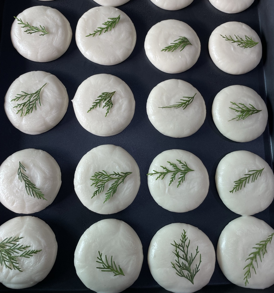 搅拌后进行捶打,上劲儿。塑型后进行人工压饼,贴松柏叶装饰。等糍粑变硬后再真空包装发出。