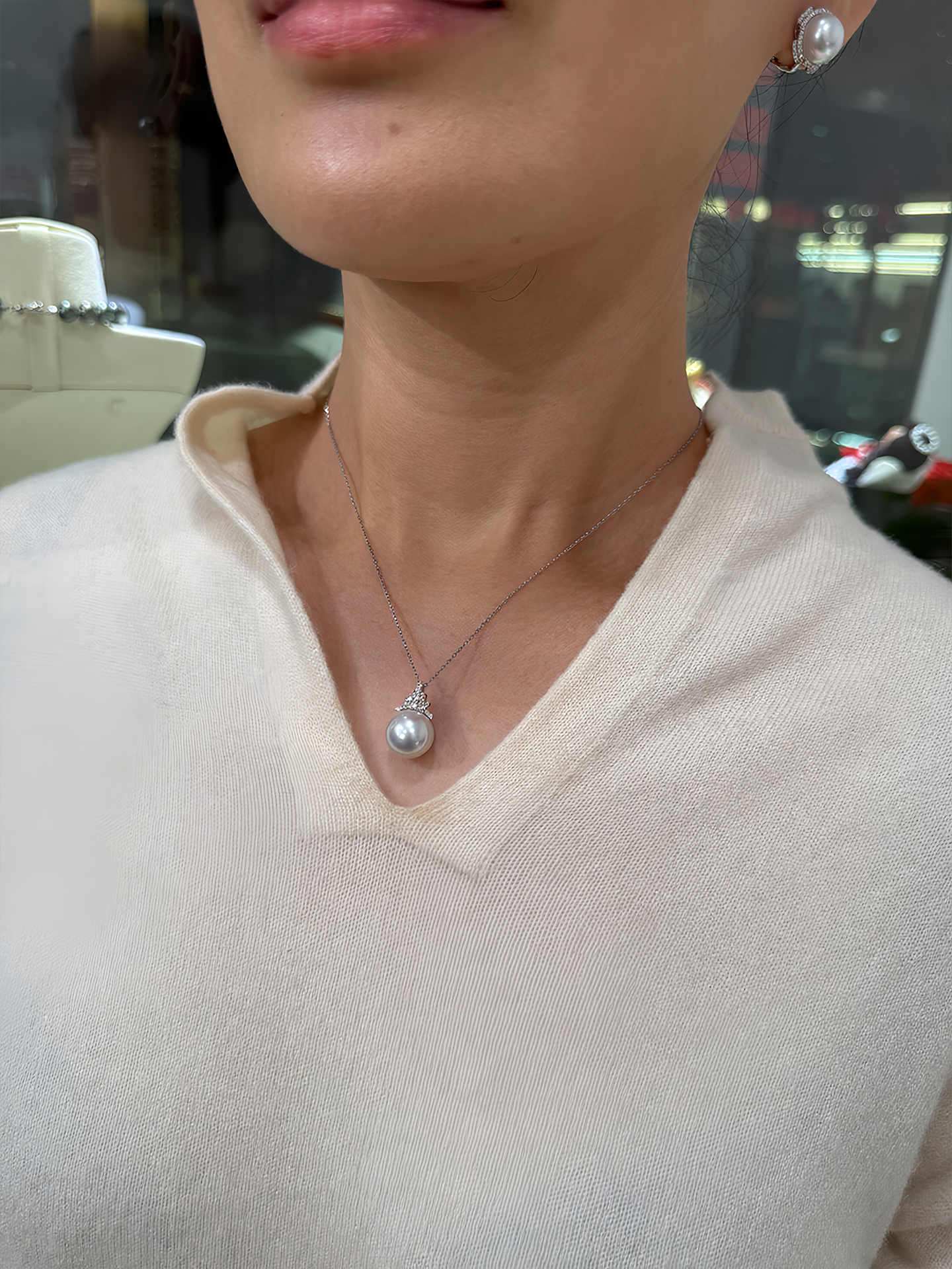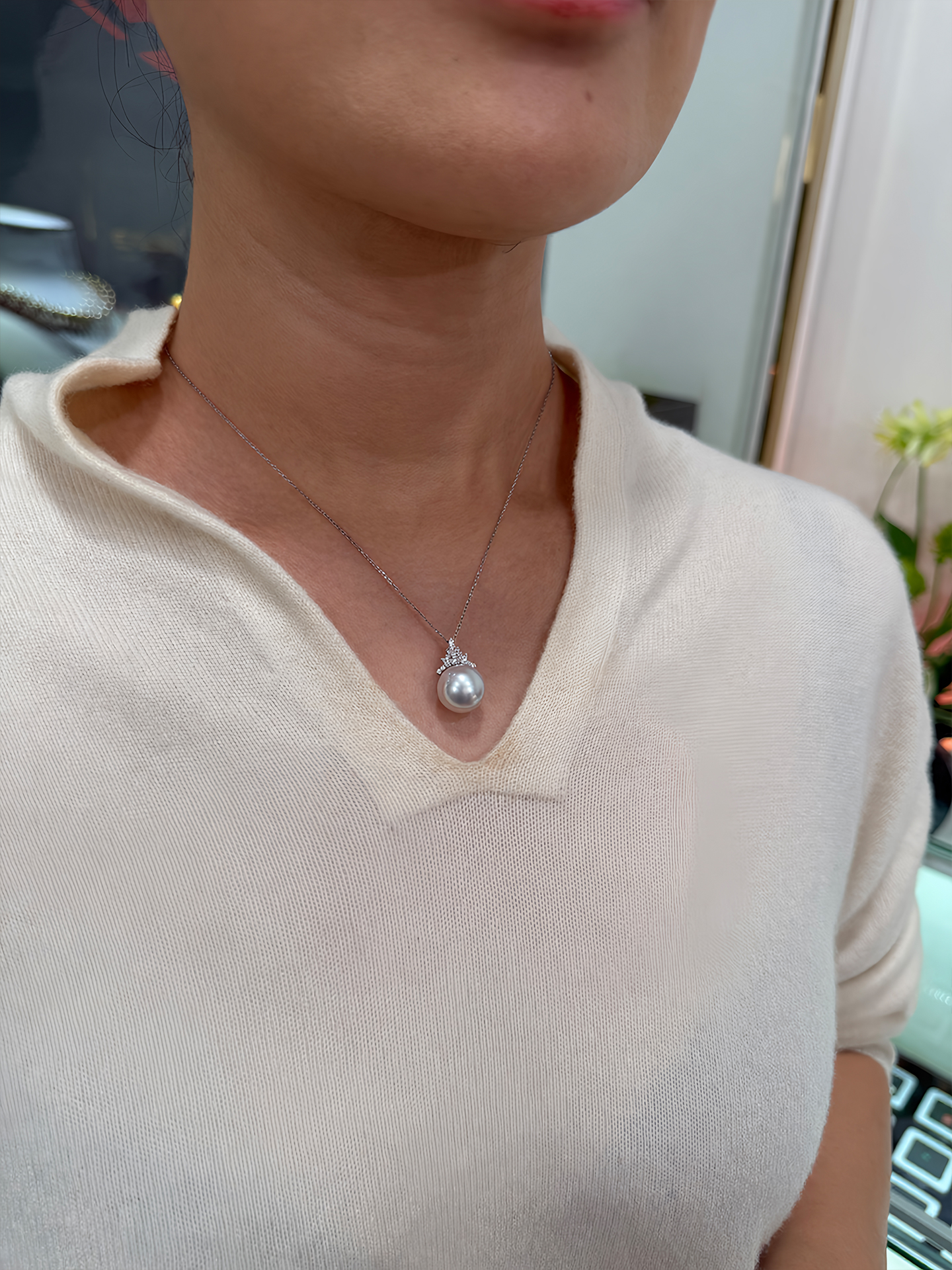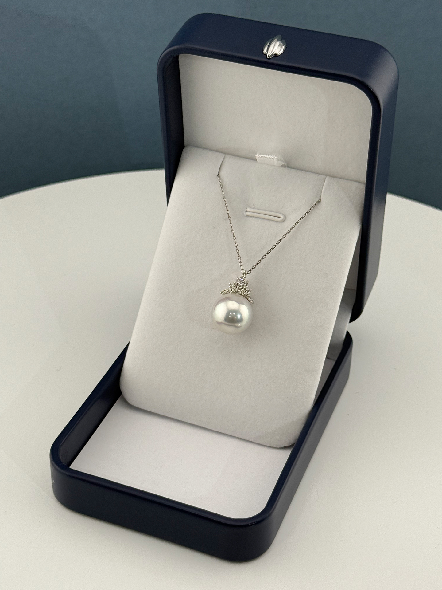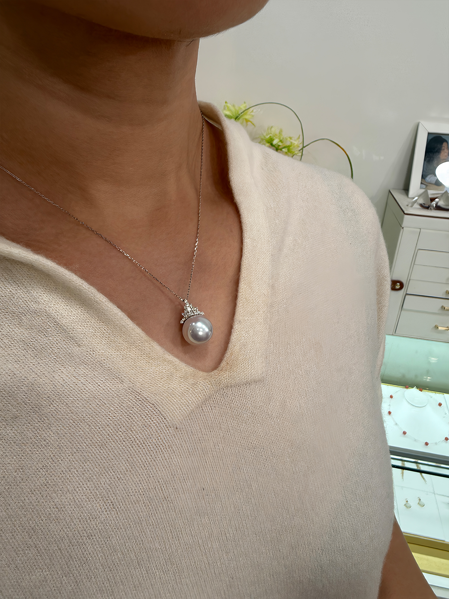 【挚友限定】冰雪皇冠-18K金钻石澳白珍珠吊坠 13-14mm