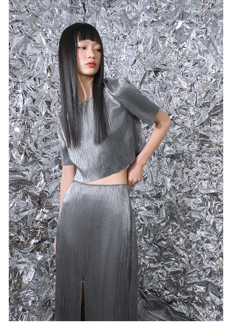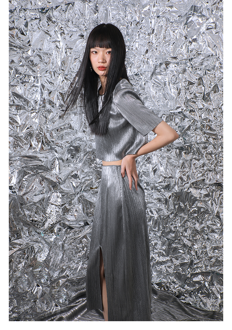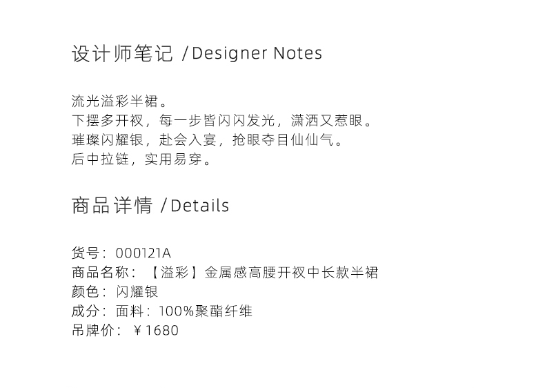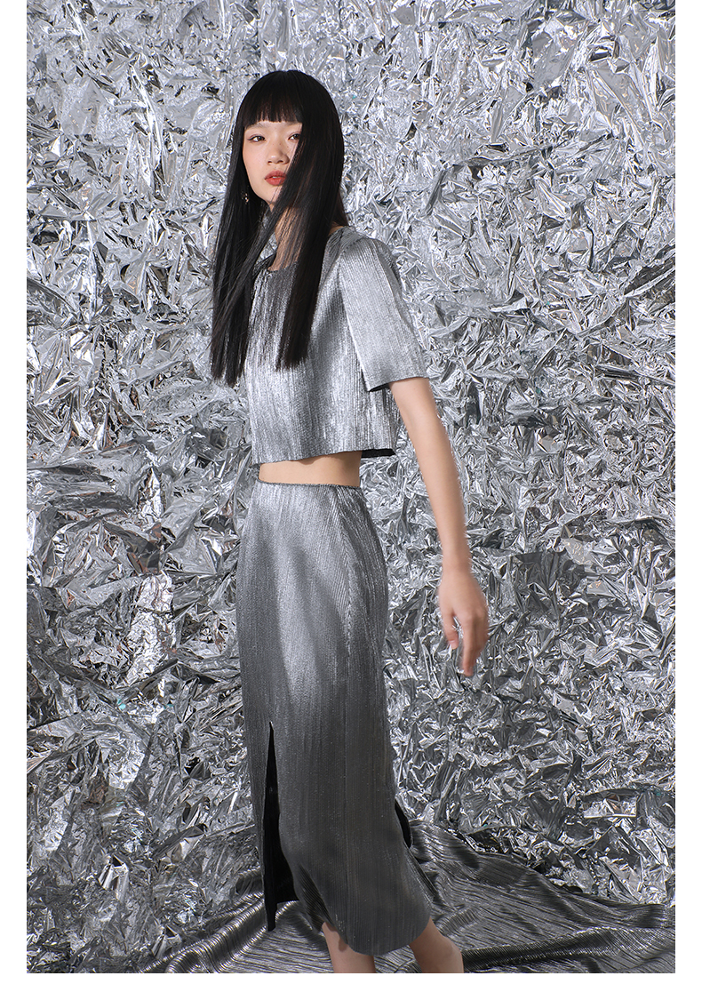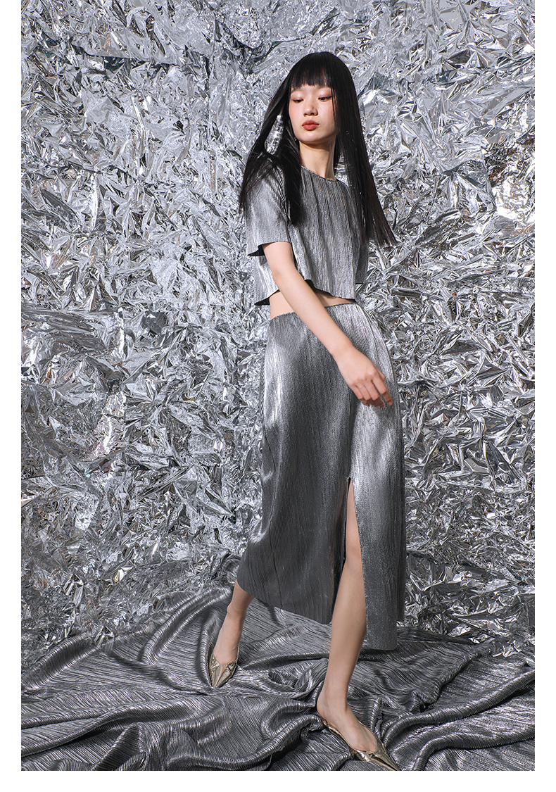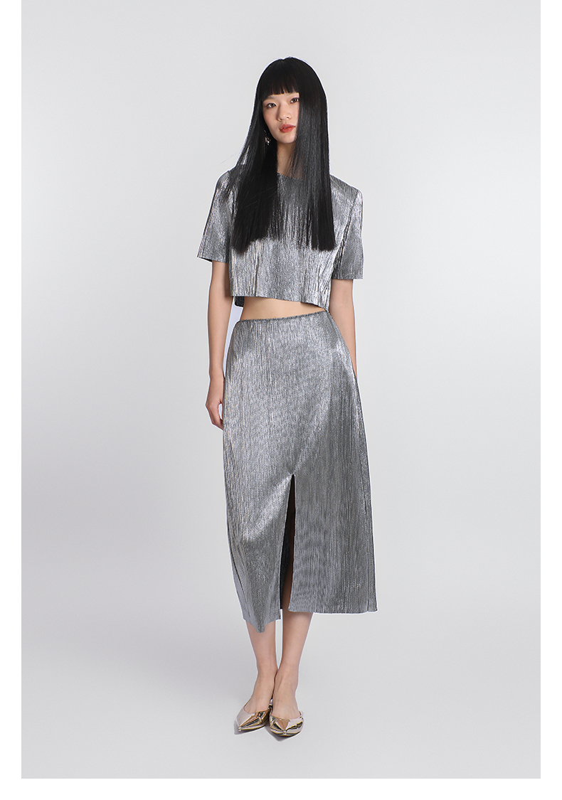 【溢彩】金属感高腰开衩中长款半裙/000121A