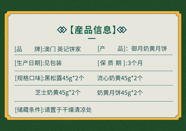 【一件包邮】澳门英记御月奶黃月饼360g 四款奶黄月饼各具风格 甘肃/青海/内蒙古/新疆/西藏/宁夏/海南/港澳台不发货
