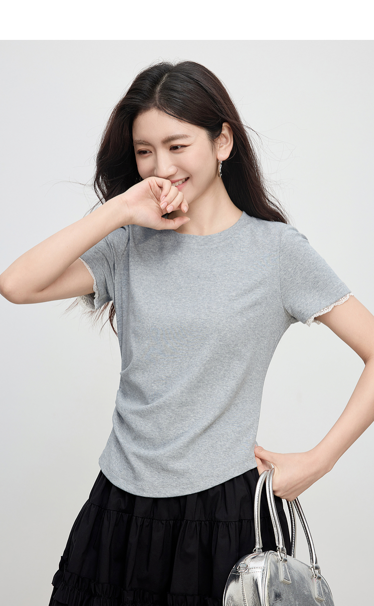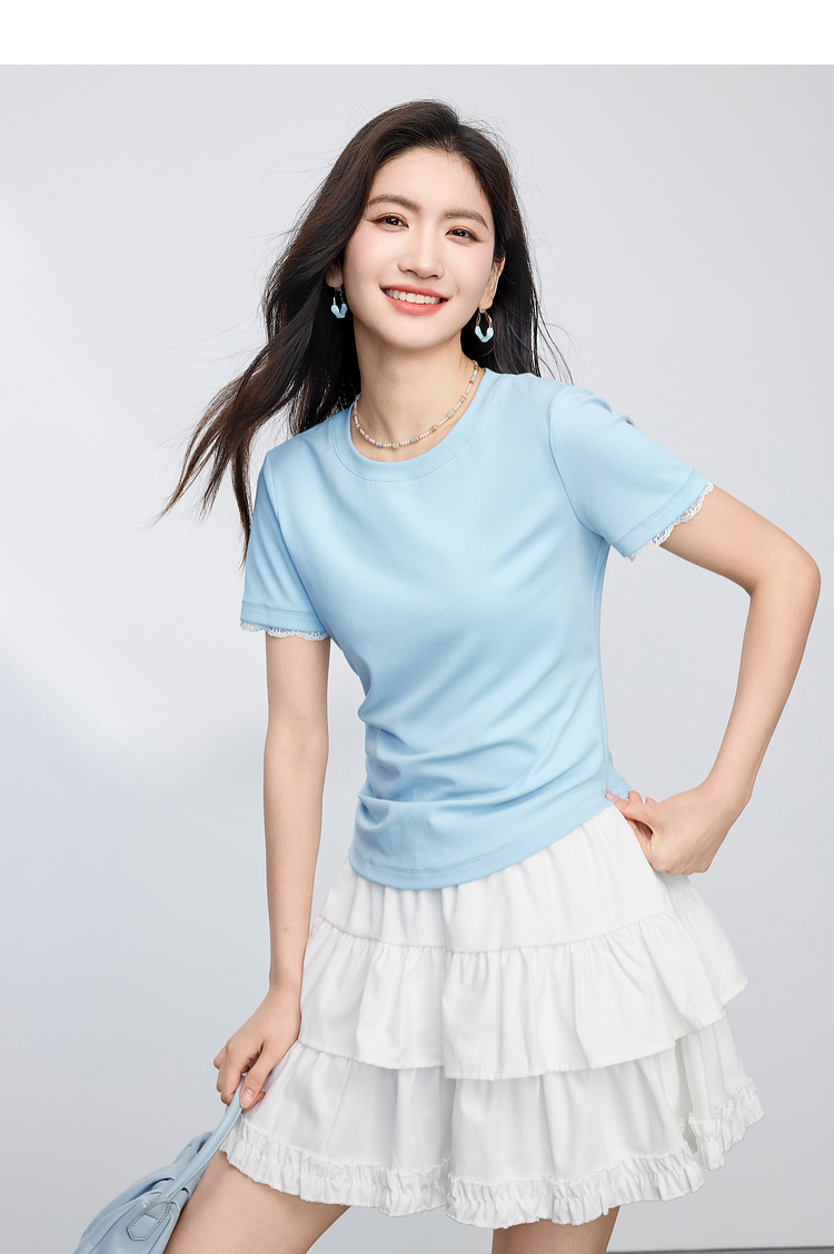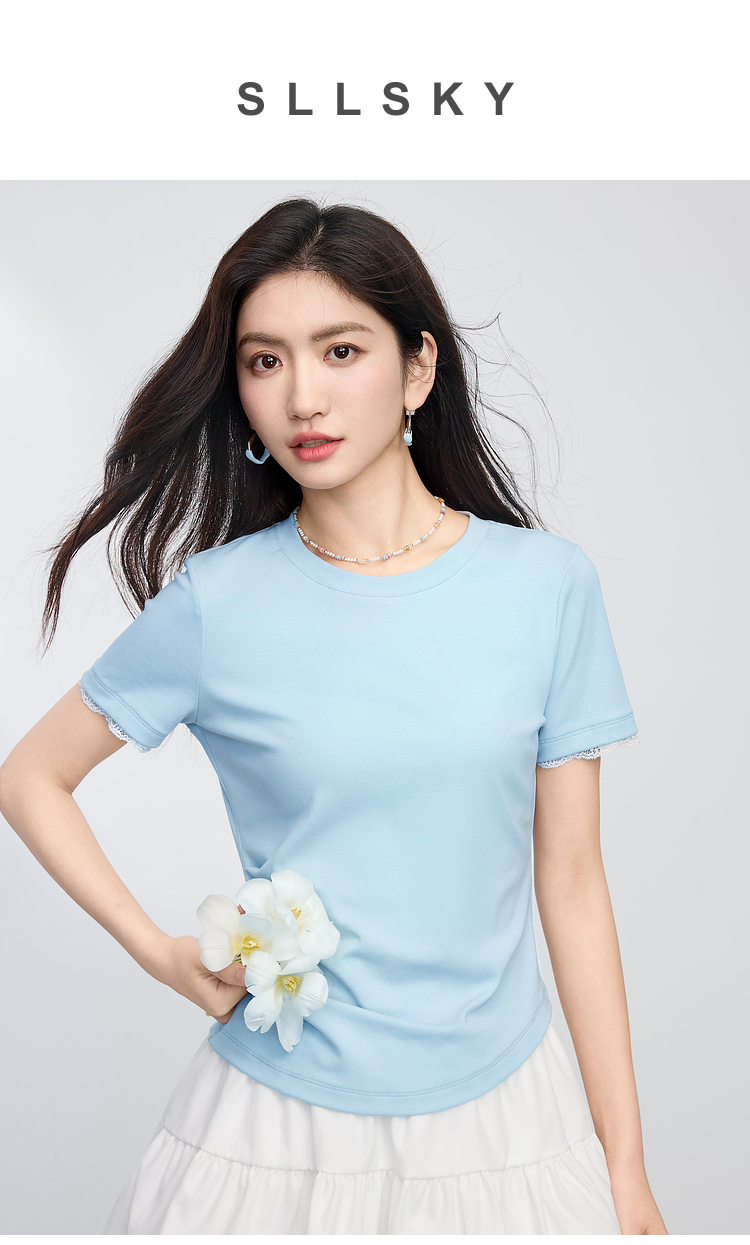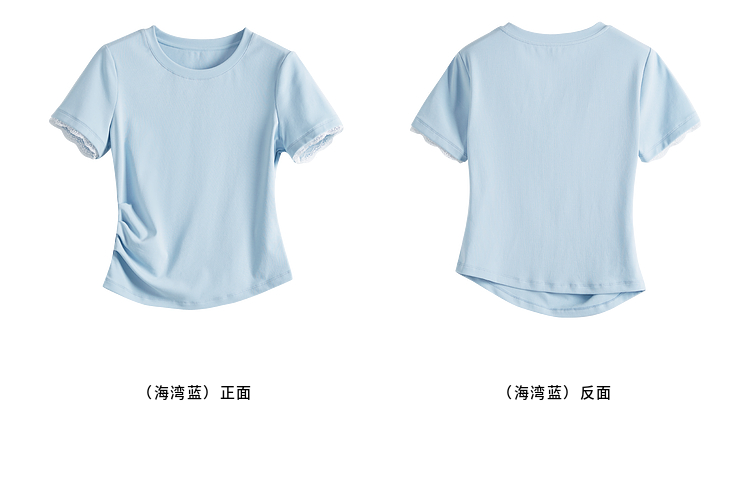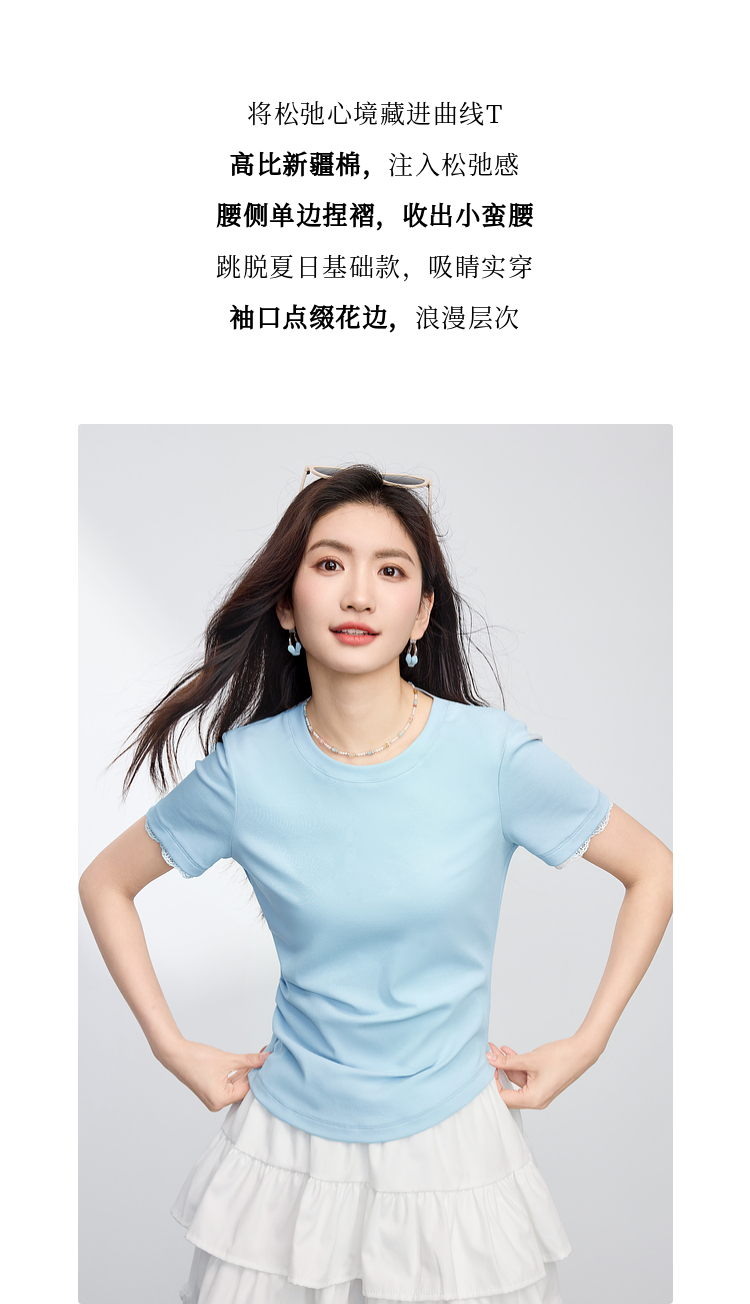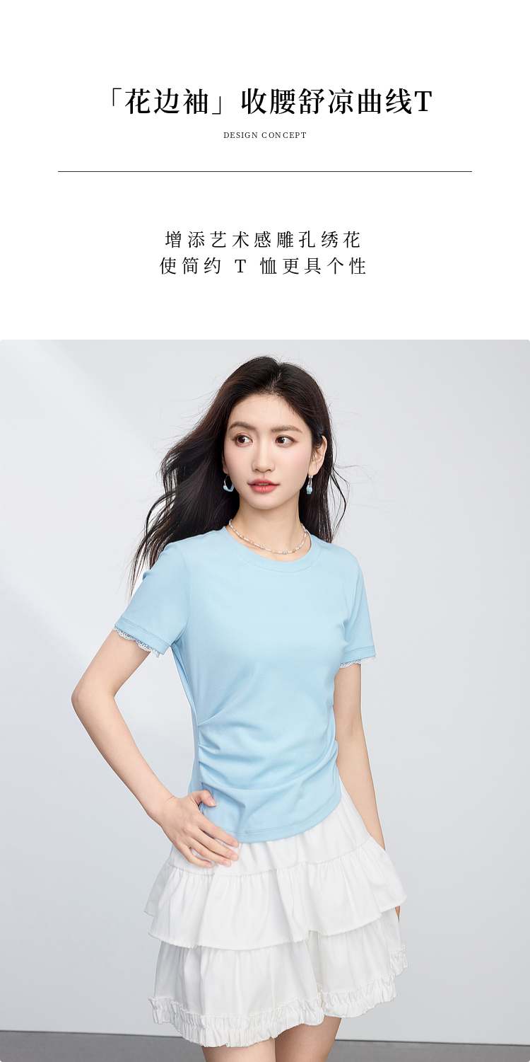 【周末秒杀】熙世界蓝色短袖t恤女修身显瘦夏新款设计感收腰捏褶圆领正肩上衣