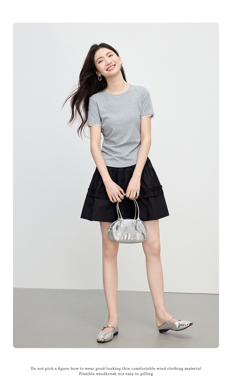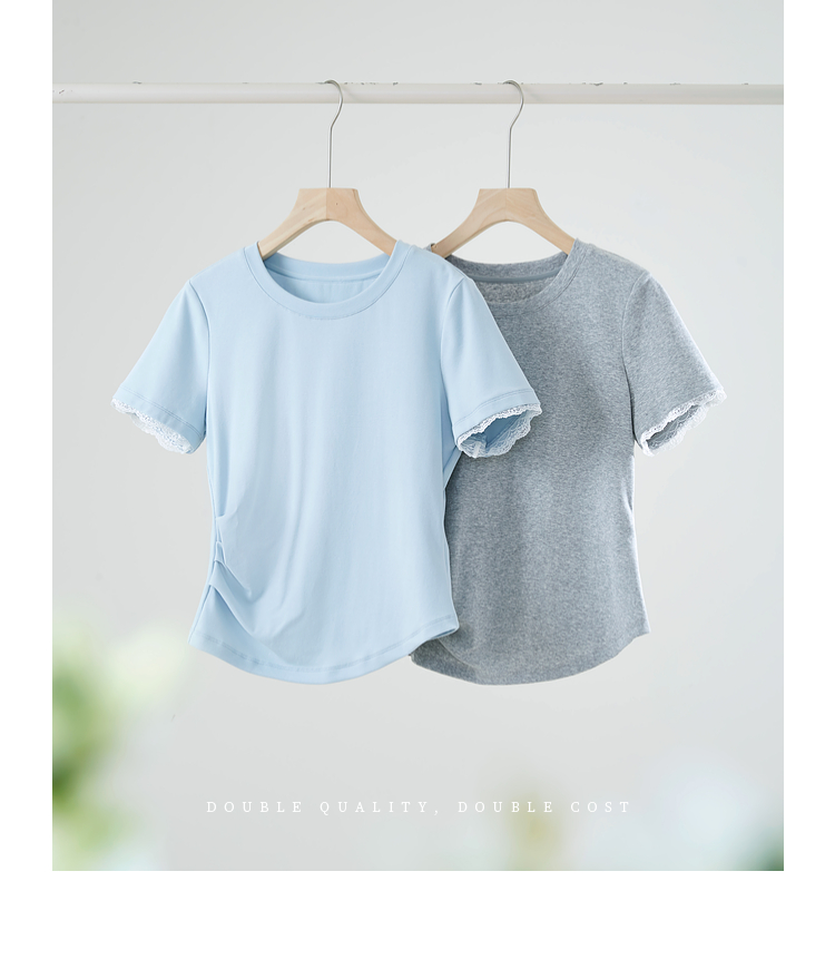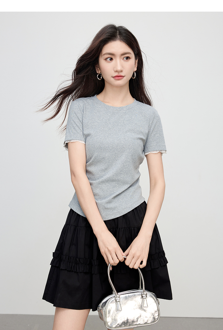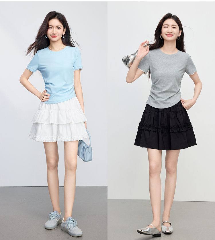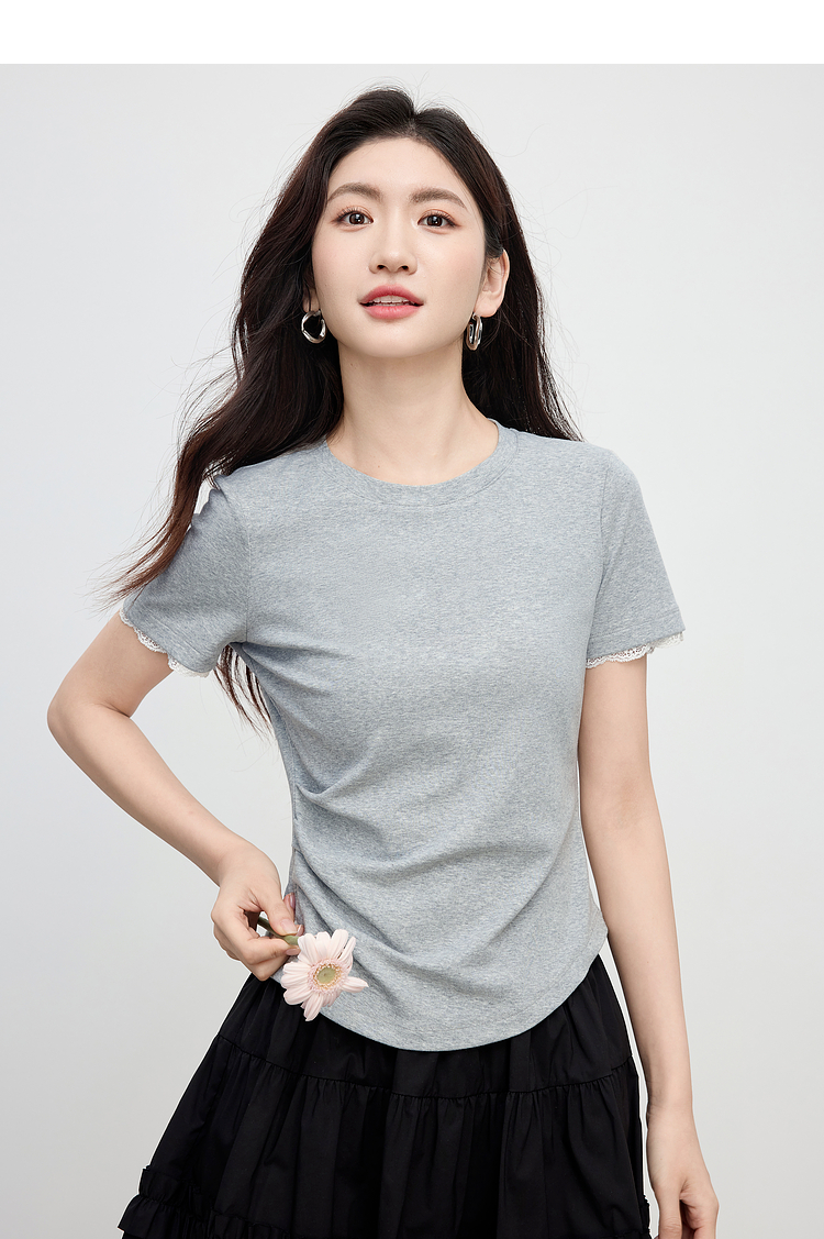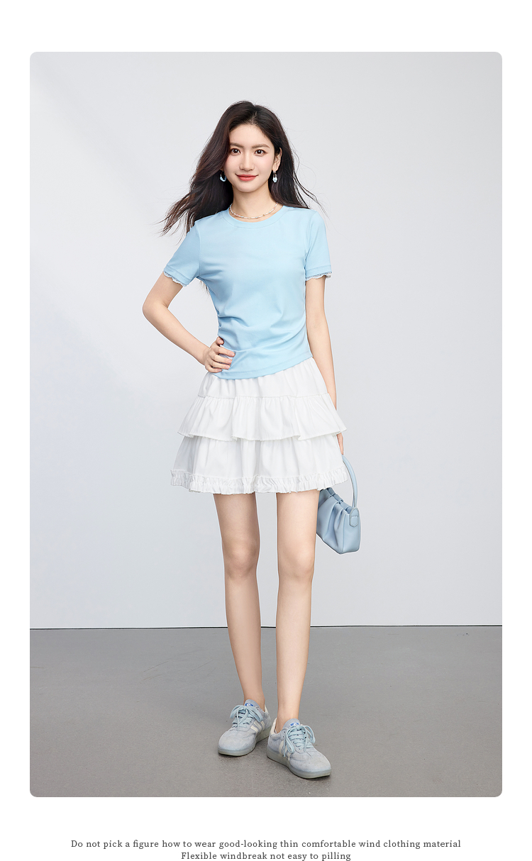 【周末秒杀】熙世界蓝色短袖t恤女修身显瘦夏新款设计感收腰捏褶圆领正肩上衣