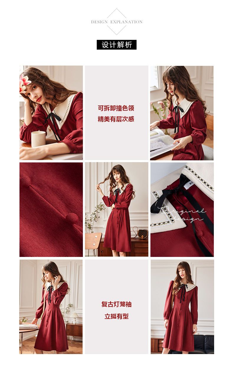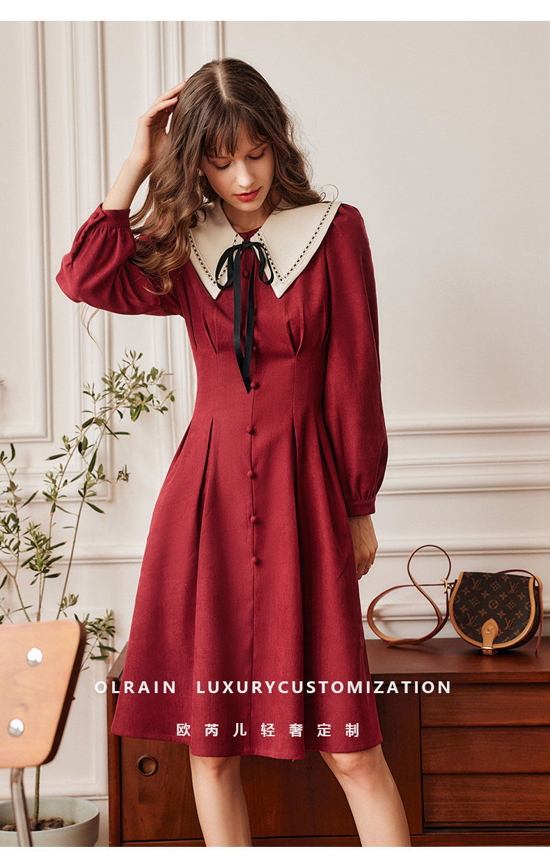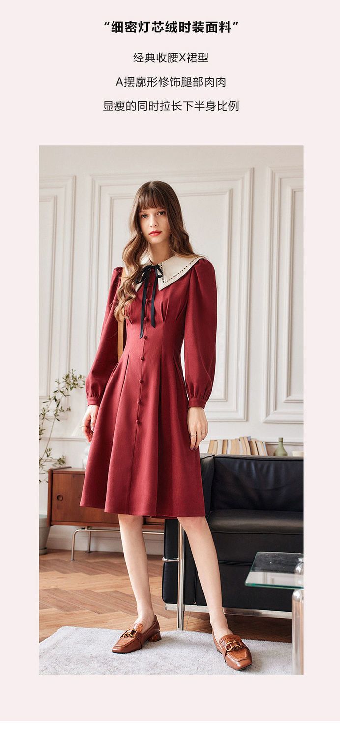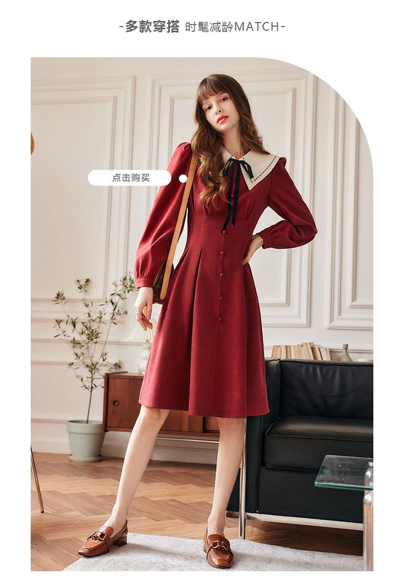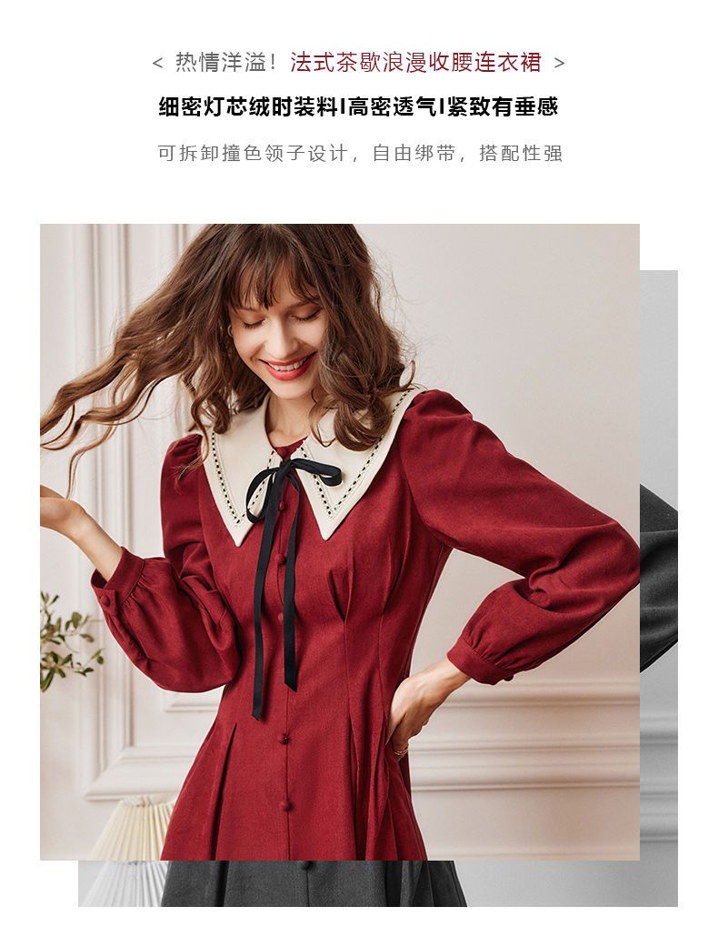 欧芮儿酒红色连衣裙女秋冬新款2021收腰显瘦气质复古灯芯绒茶歇裙