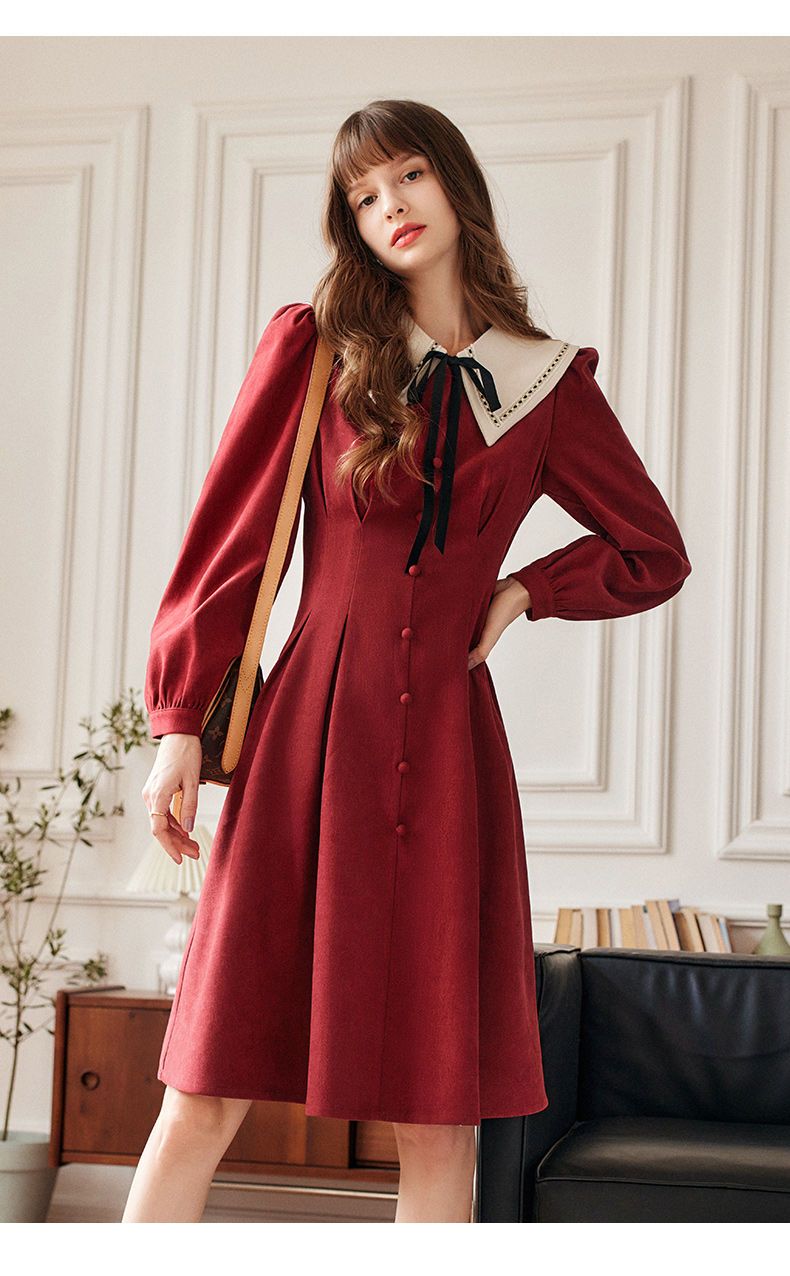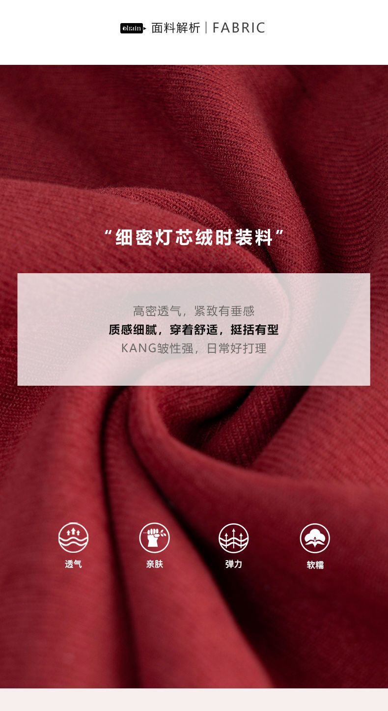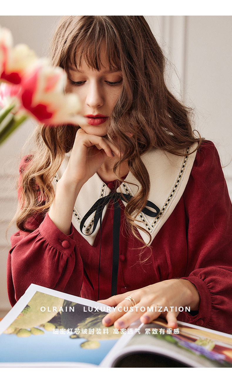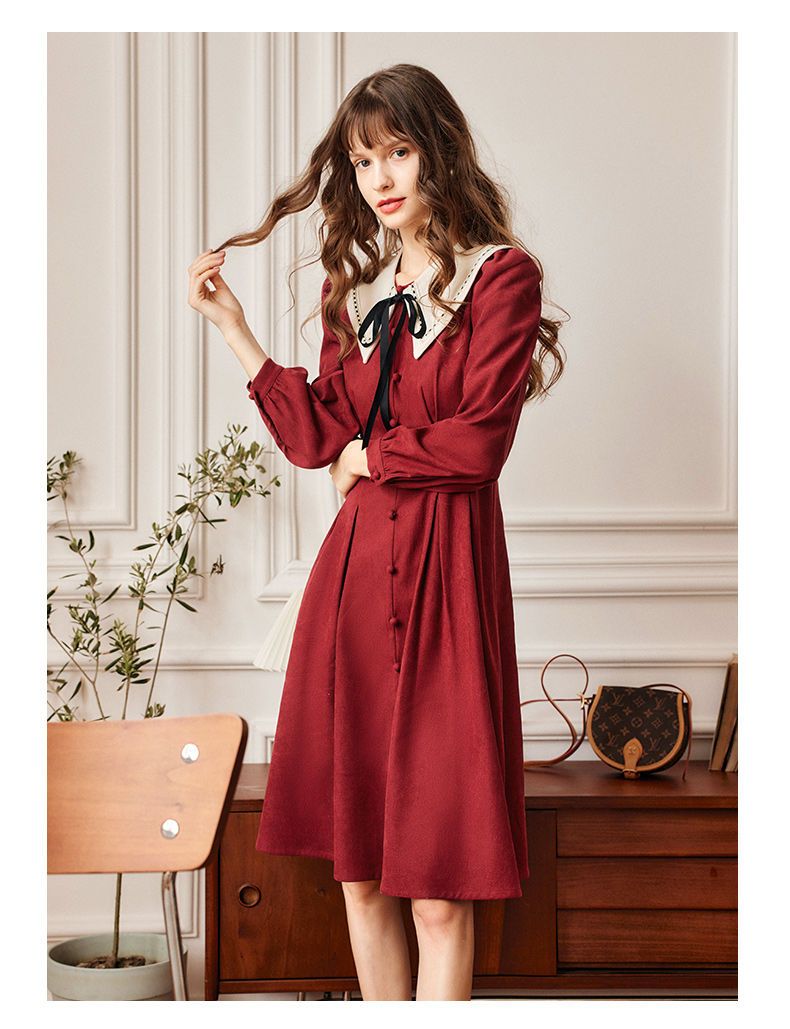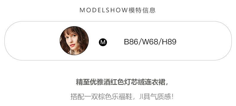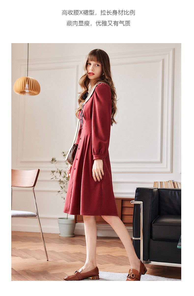 欧芮儿酒红色连衣裙女秋冬新款2021收腰显瘦气质复古灯芯绒茶歇裙