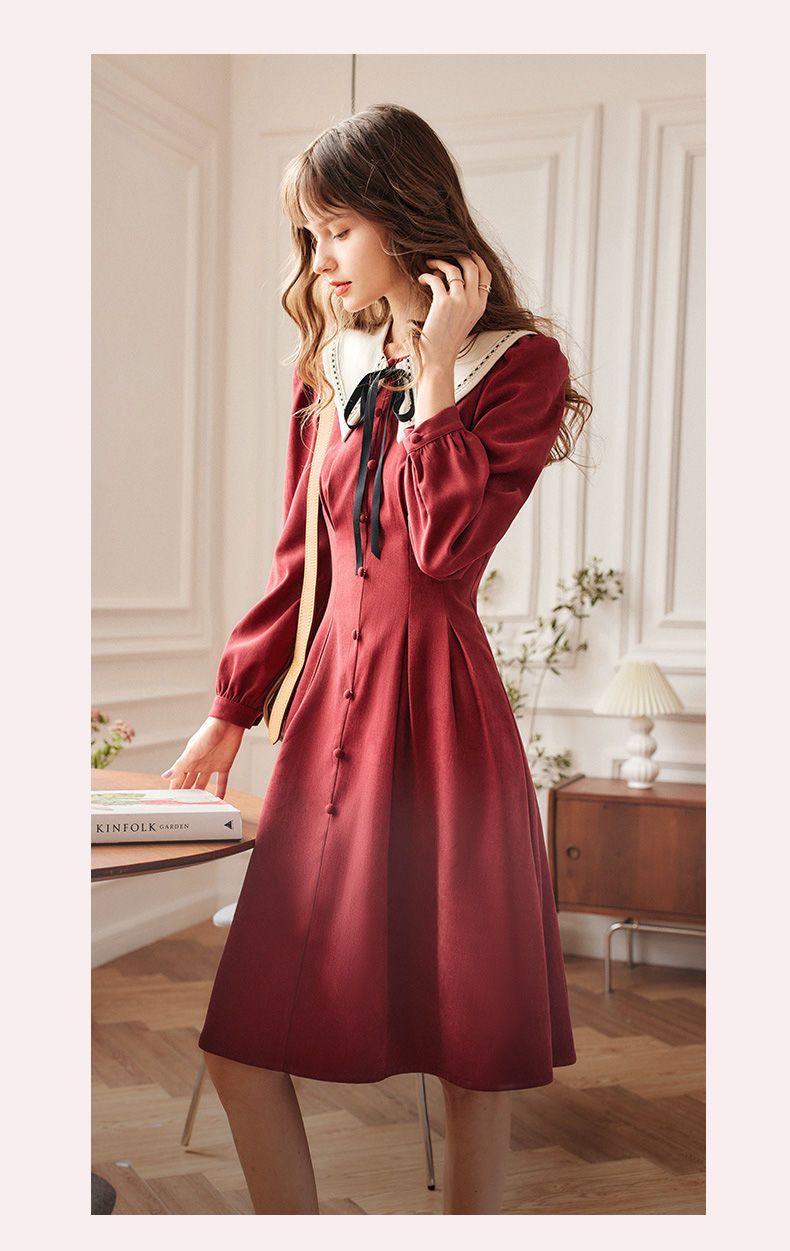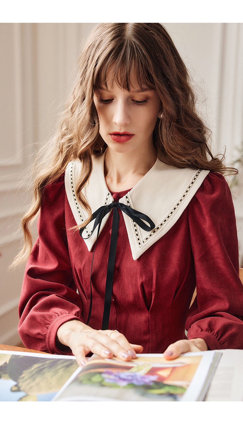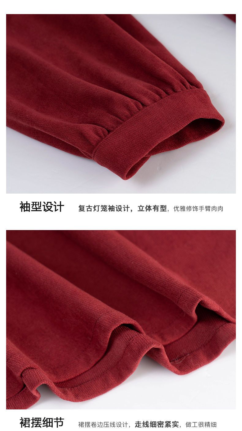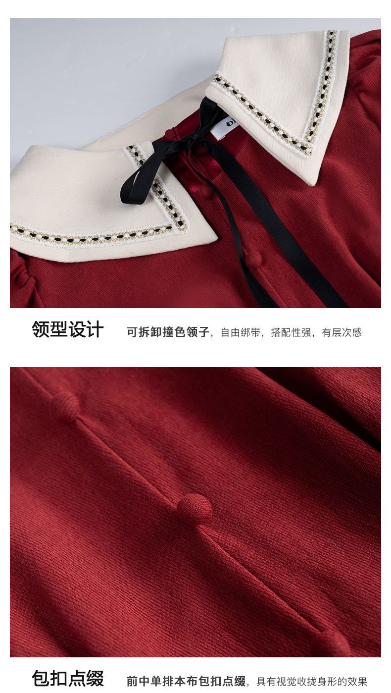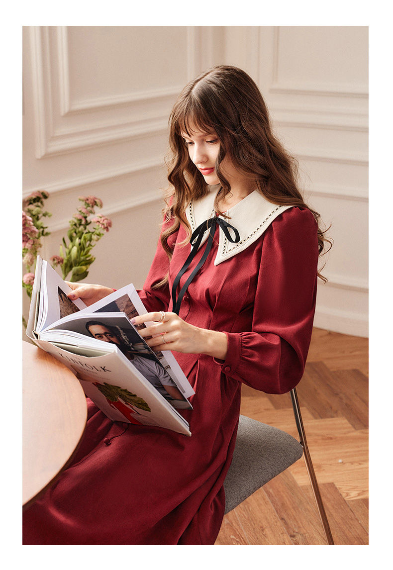 欧芮儿酒红色连衣裙女秋冬新款2021收腰显瘦气质复古灯芯绒茶歇裙