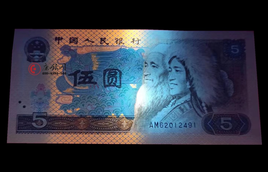 “红光蓝鹤”就是央行在80版5元身上试验下的荧光品种,其特点为:纸币正面满版蓝色网格,整体为红色荧光。仙鹤和花朵均为蓝色,背面左侧和右下角花朵均为蓝紫色。